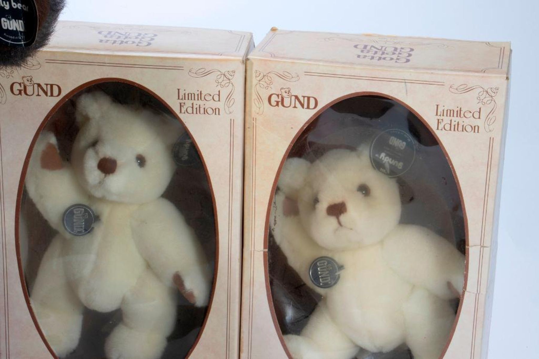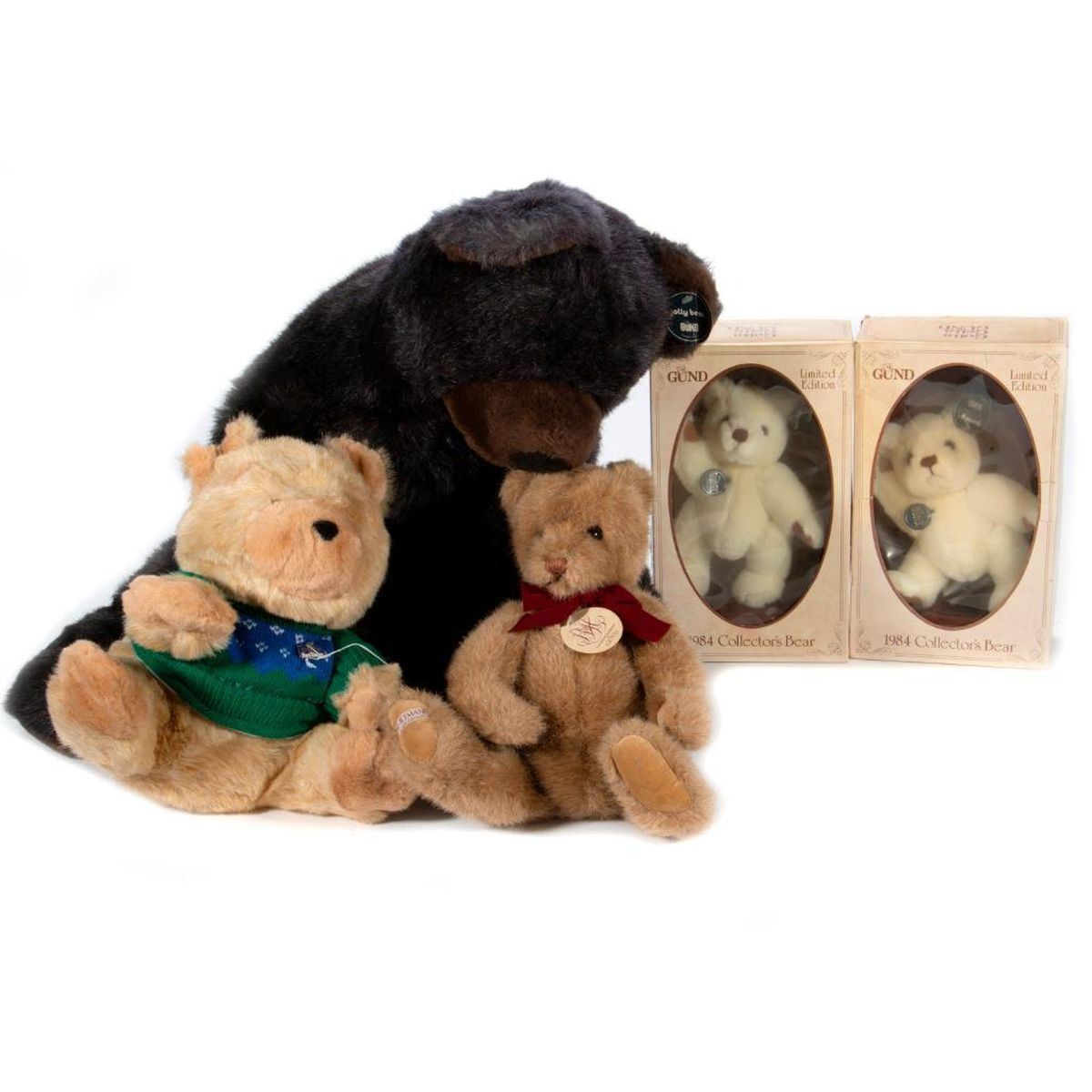 Assorted stuffed Teddy Bears by Gund, lot of five. Largest measure at 25 inches.