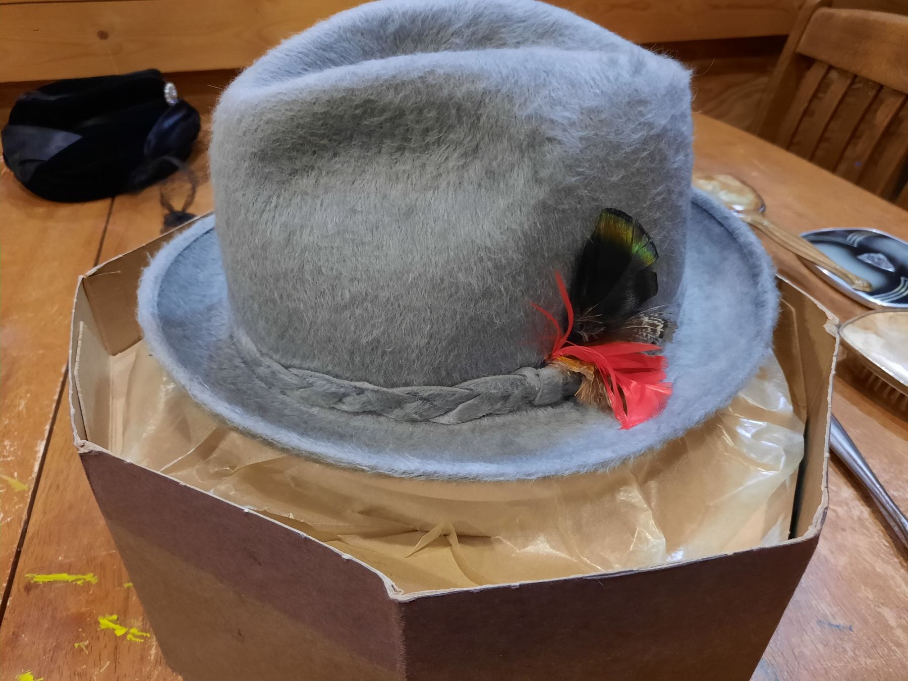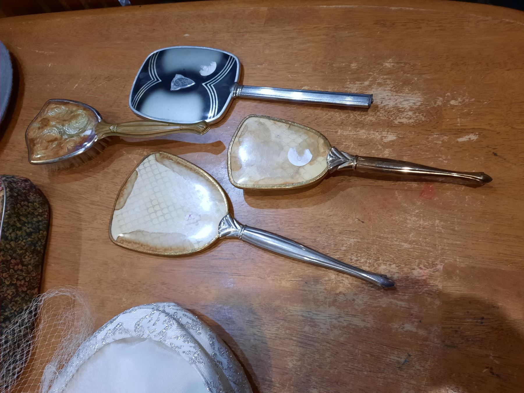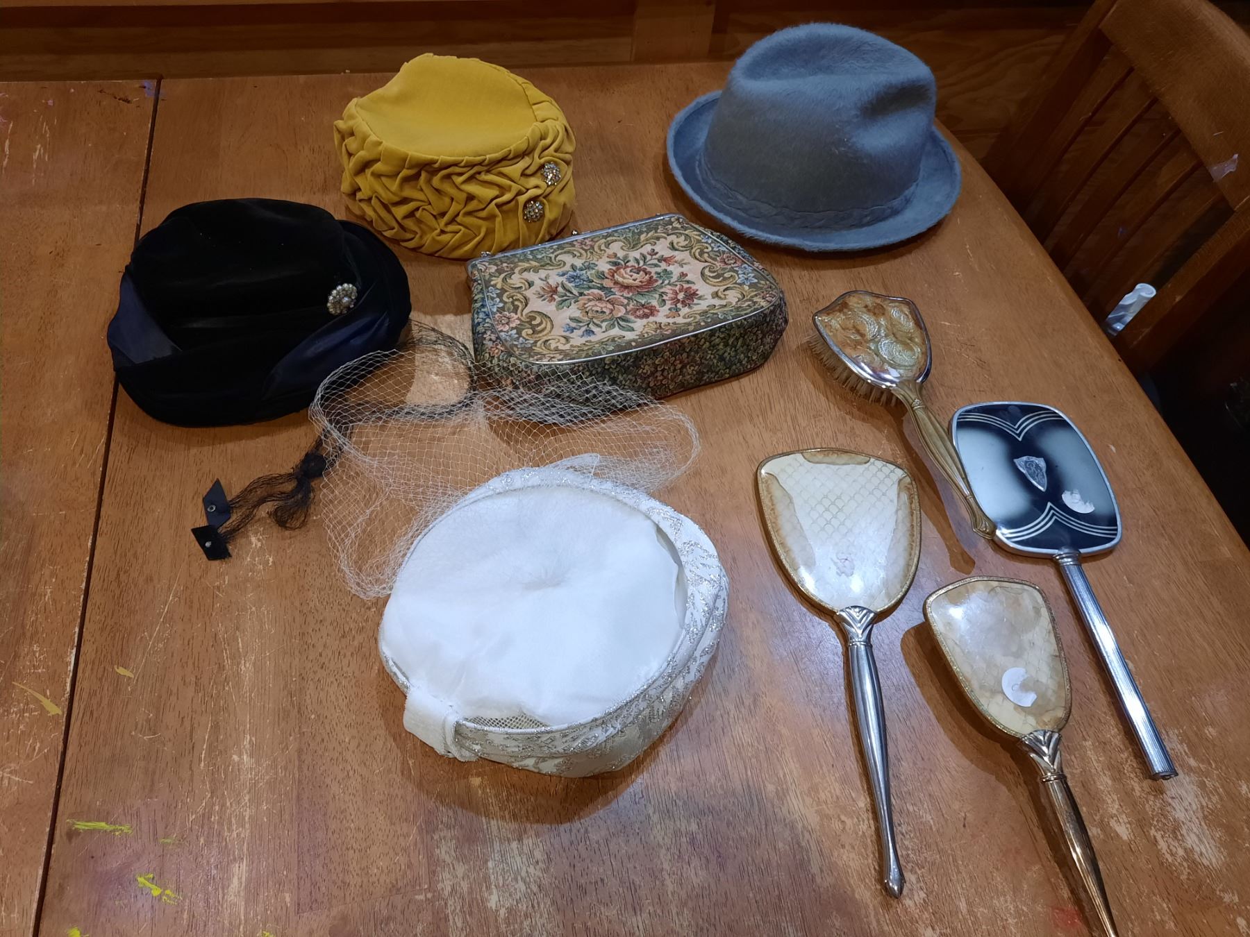 Assorted Vintage Hats, Purse, Mirrors & Brushes (backings are stained)