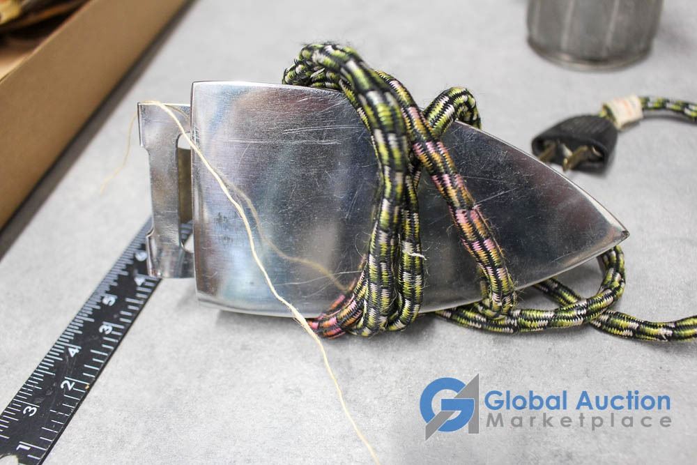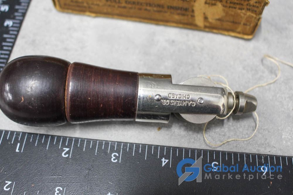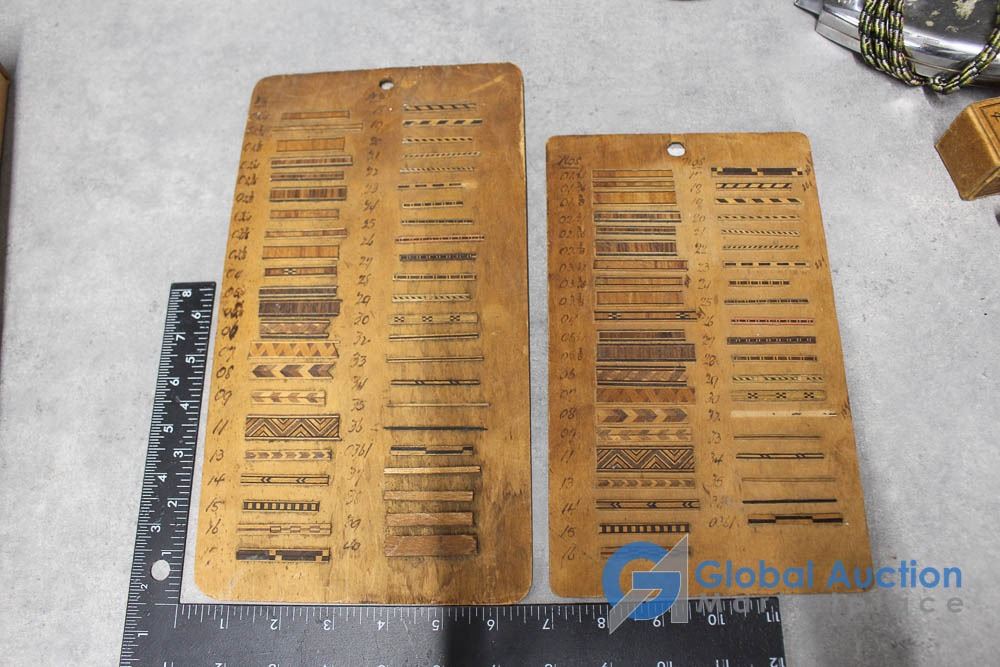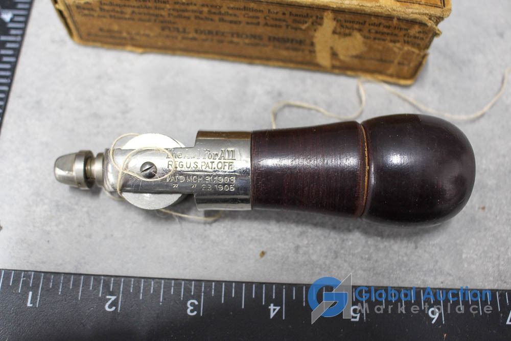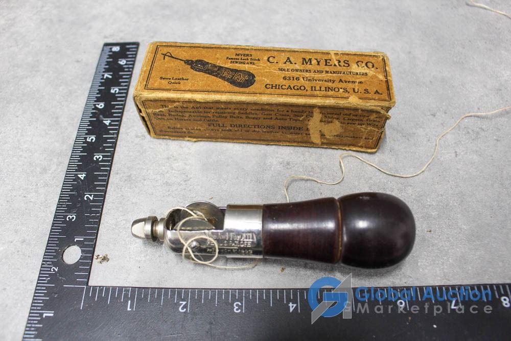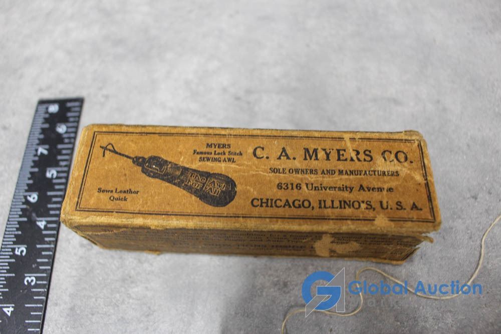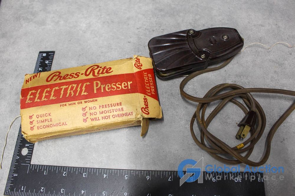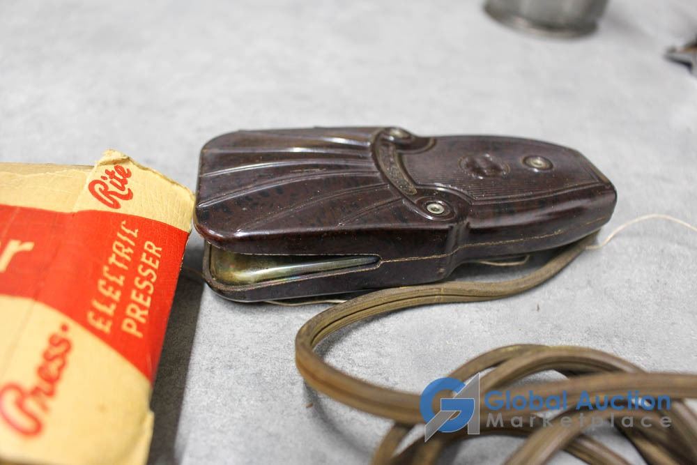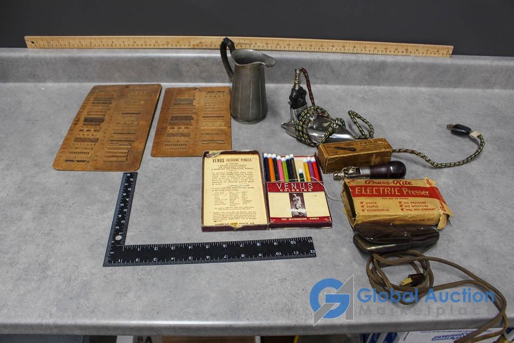 Vintage electric iron (working), Press Rite Electric Presser -working (in original box), sole repair tool (In original box), salesman moulding samples, Venus water colour pencils.