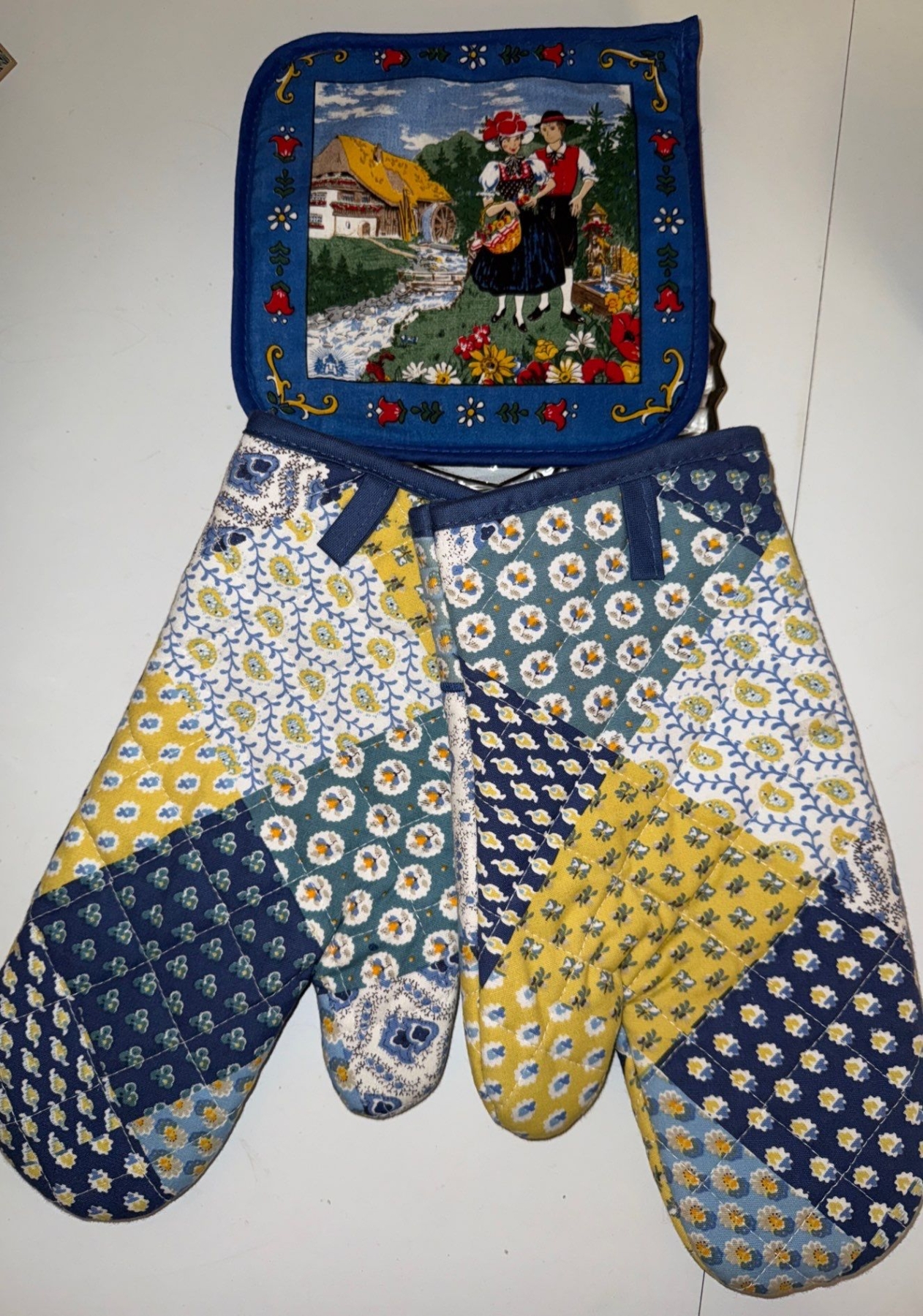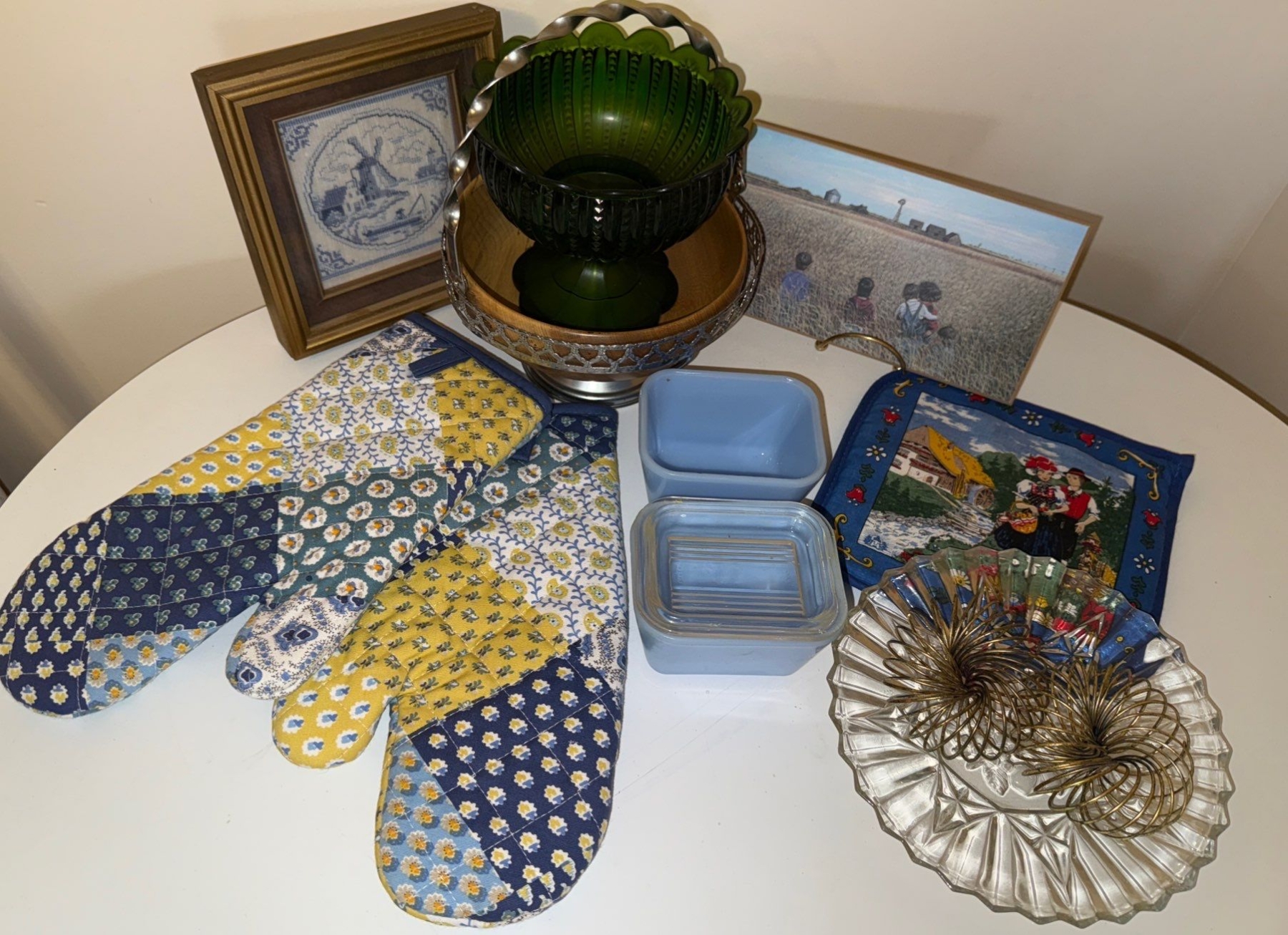 Assorted Vintage Kitchen Items- oven mitts, Pyrex dishes, Wall art & Ashtray & More