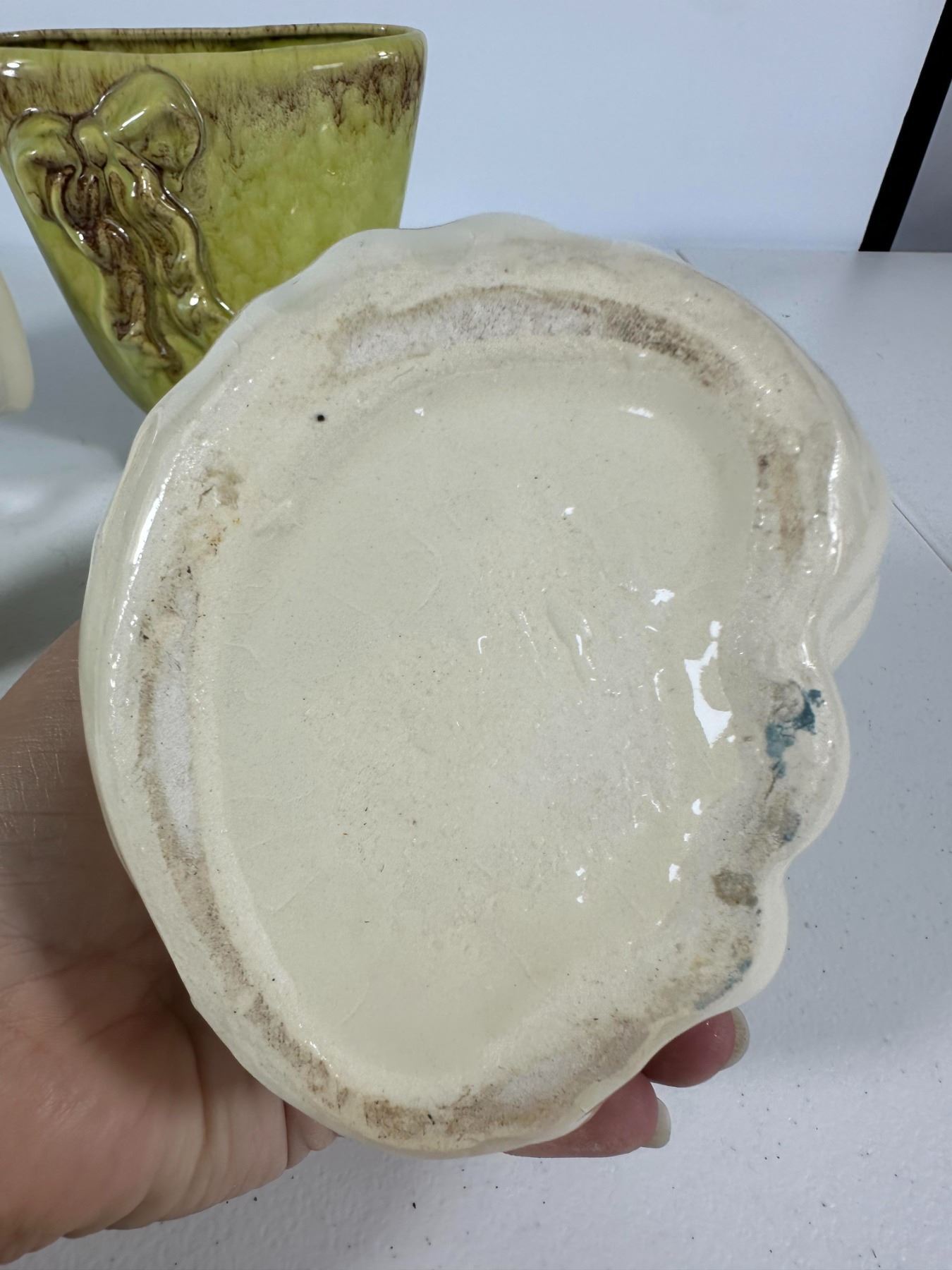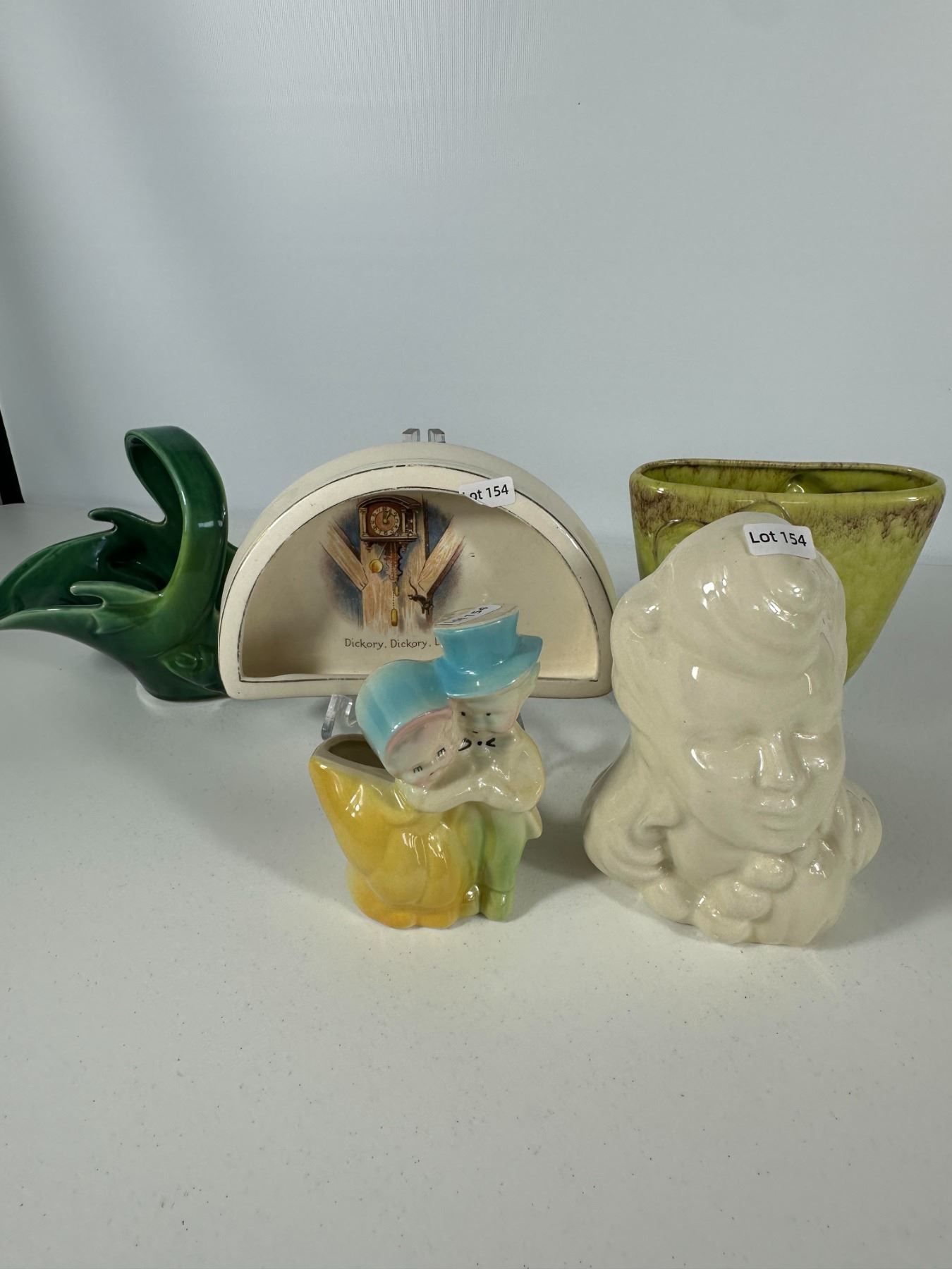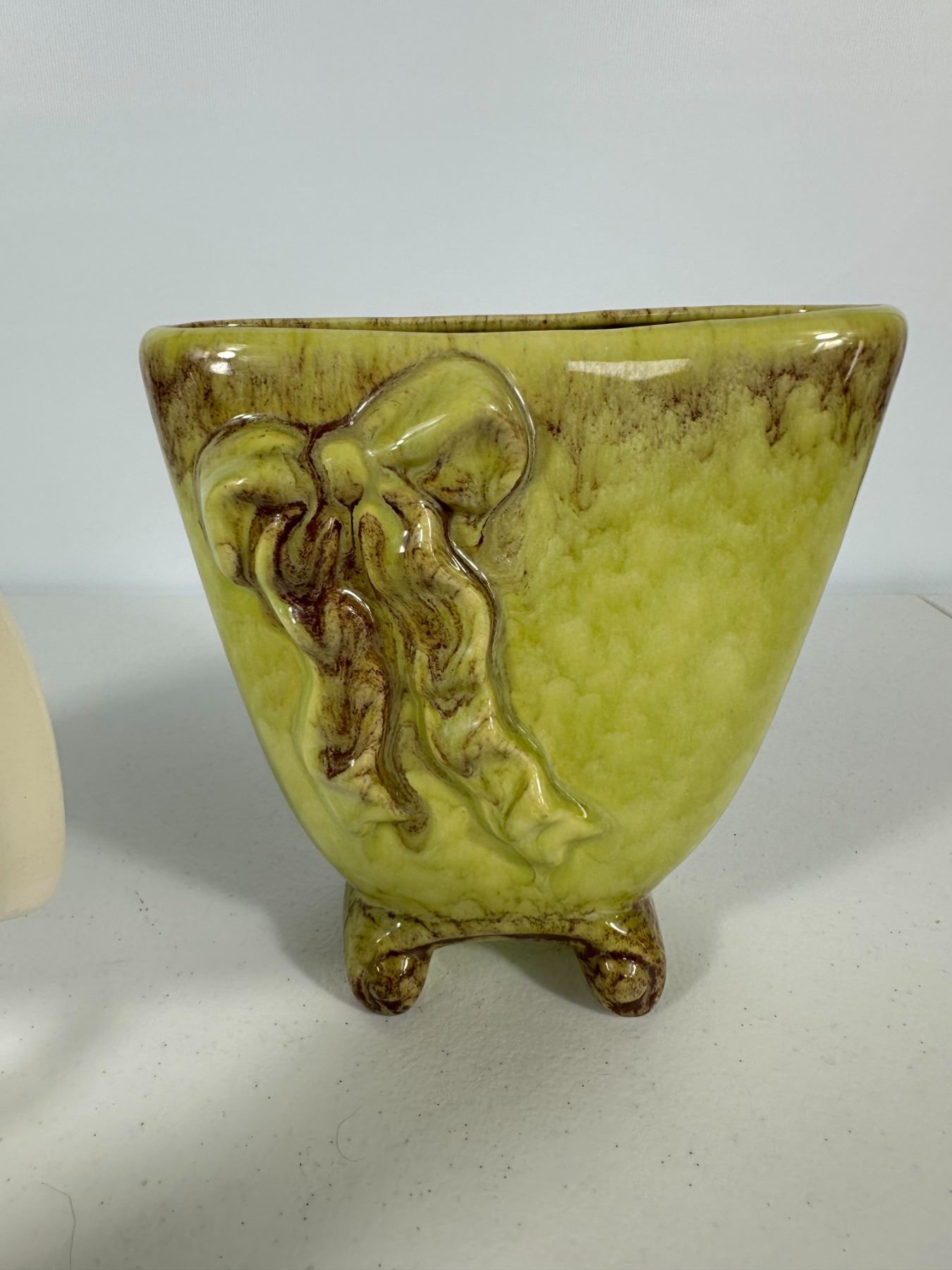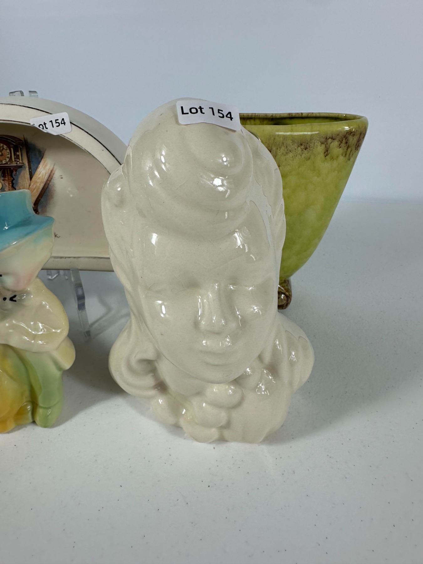 Includes a grouping of pottery planters and novelty pieces including a green swirl planter, yellow-green glaze planter, ceramic lady head planter, and figural novelty pieces. Fun decorative mix.
