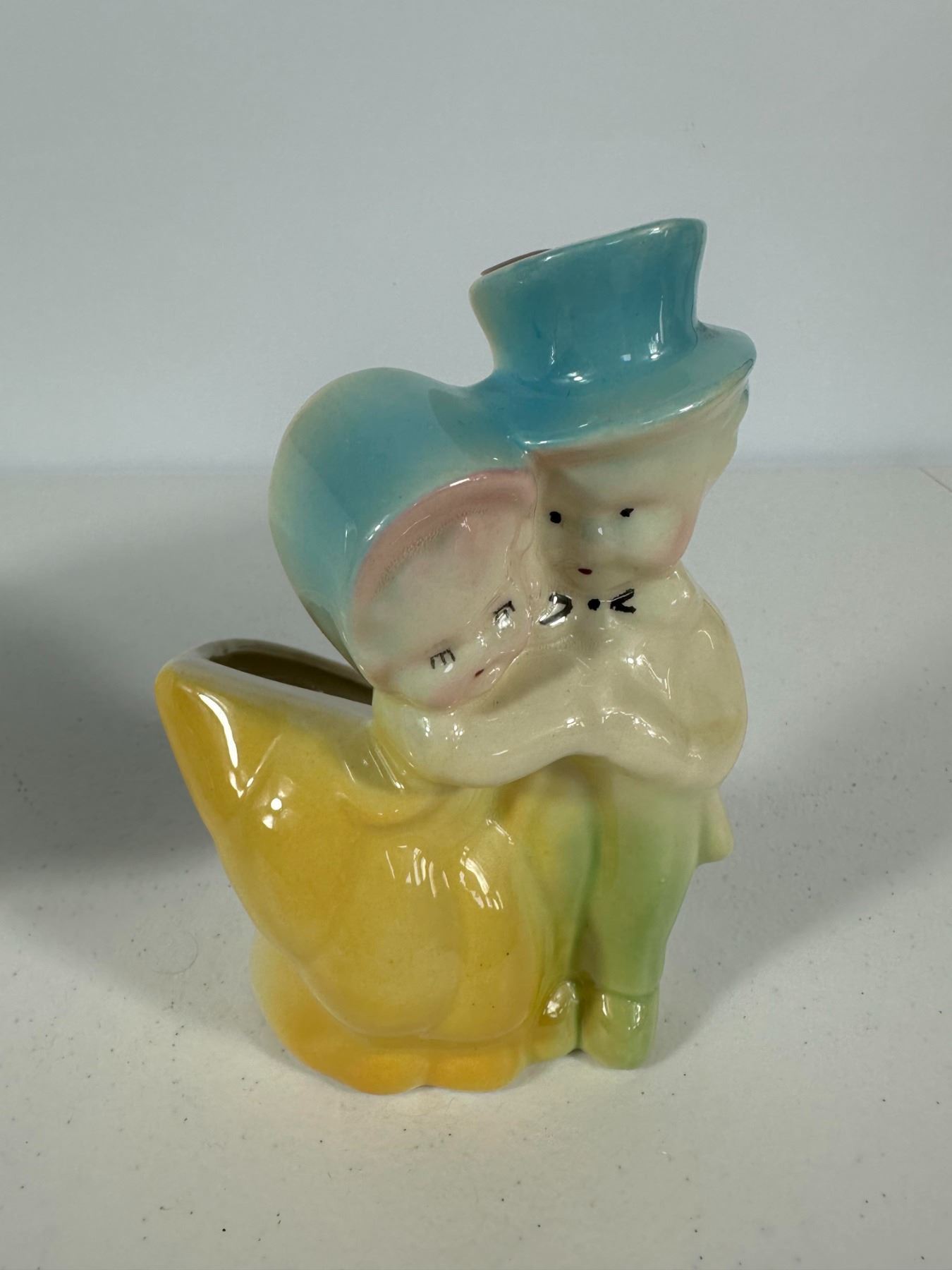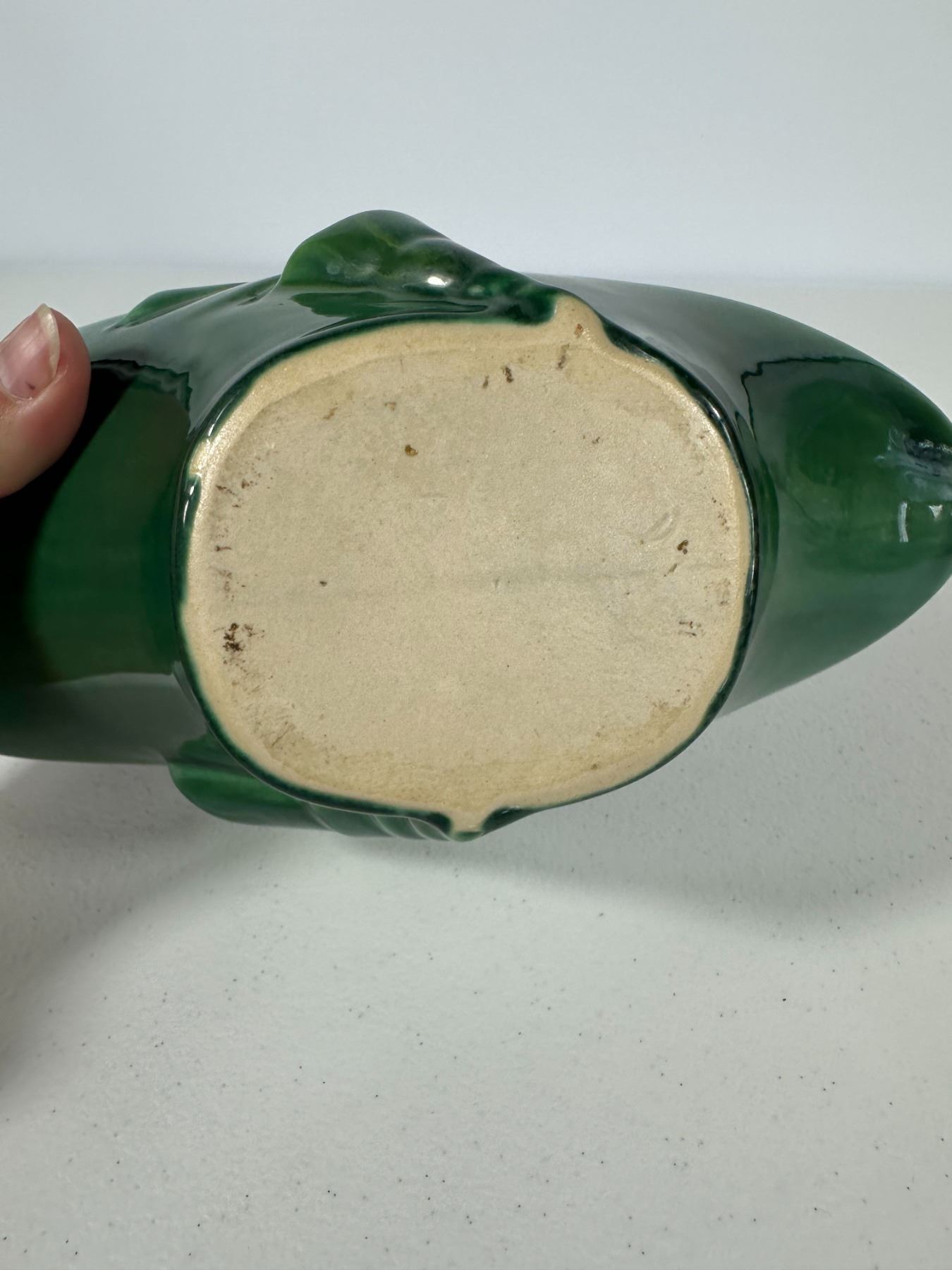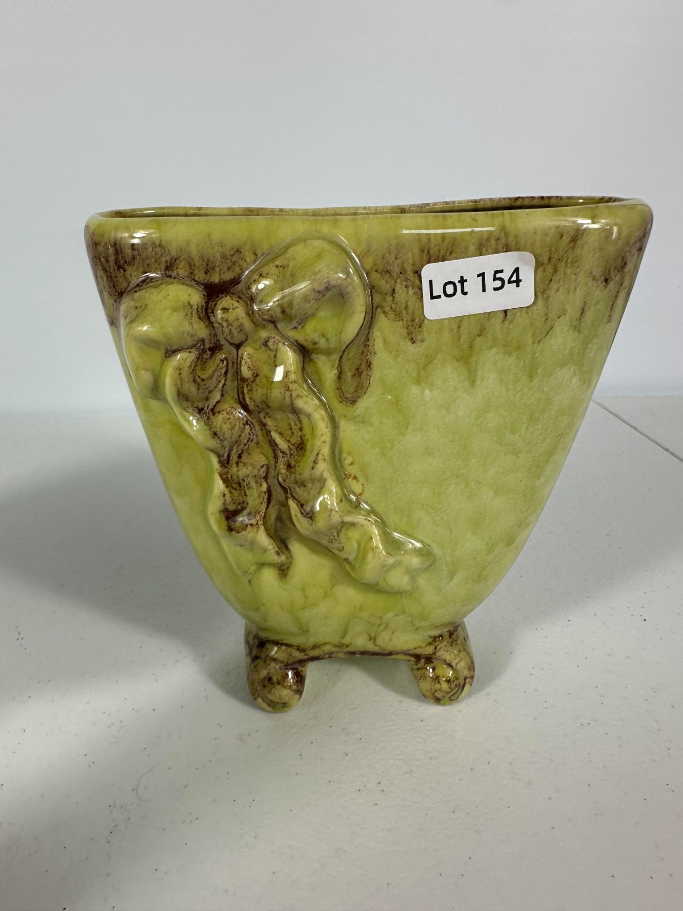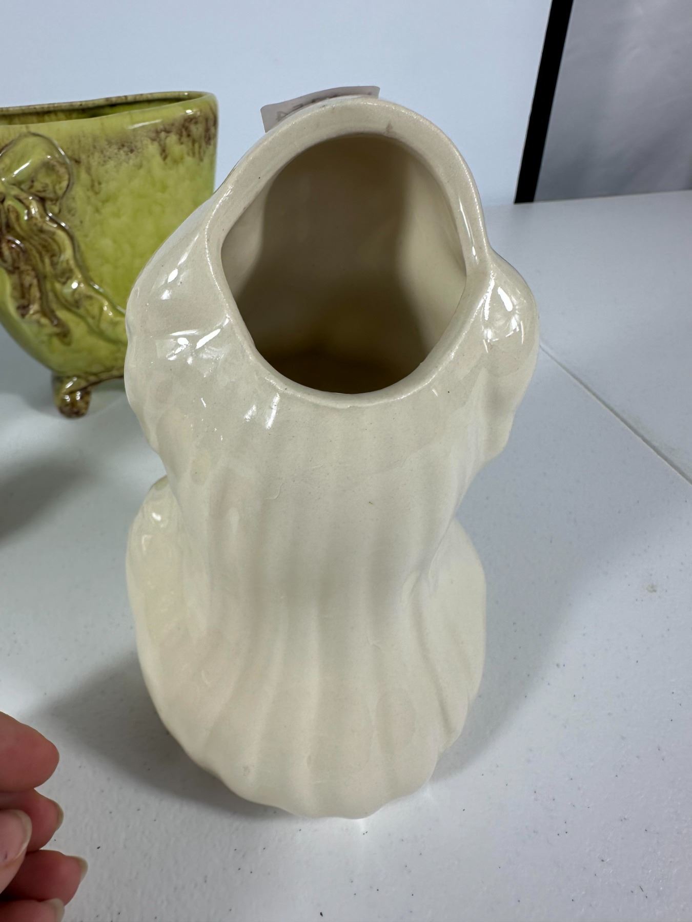 Includes a grouping of pottery planters and novelty pieces including a green swirl planter, yellow-green glaze planter, ceramic lady head planter, and figural novelty pieces. Fun decorative mix.