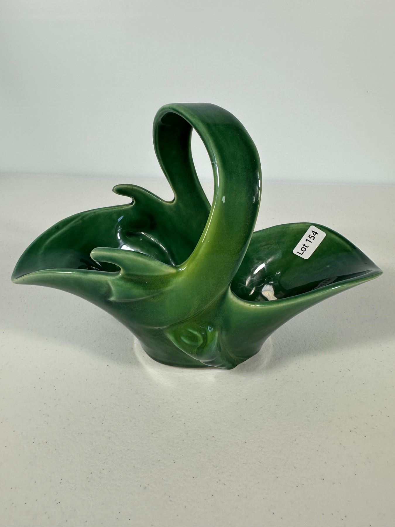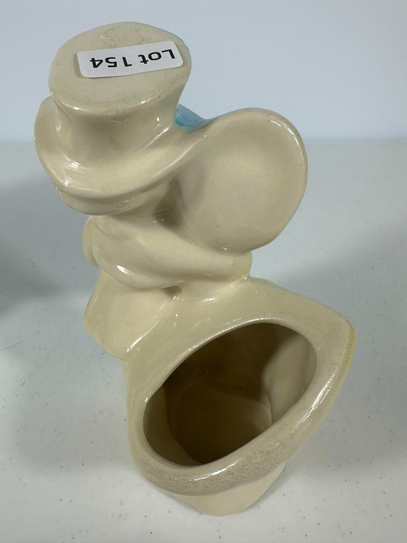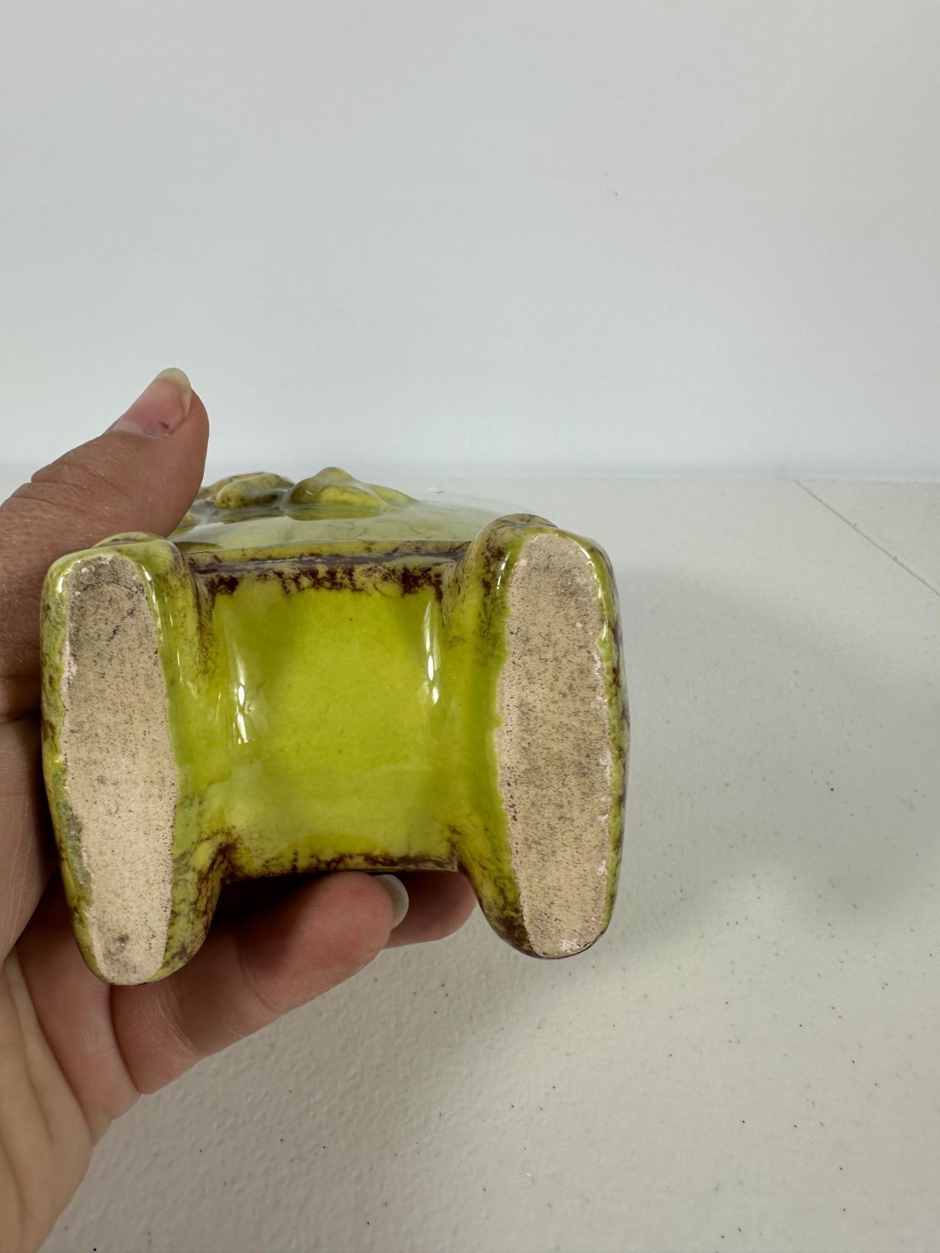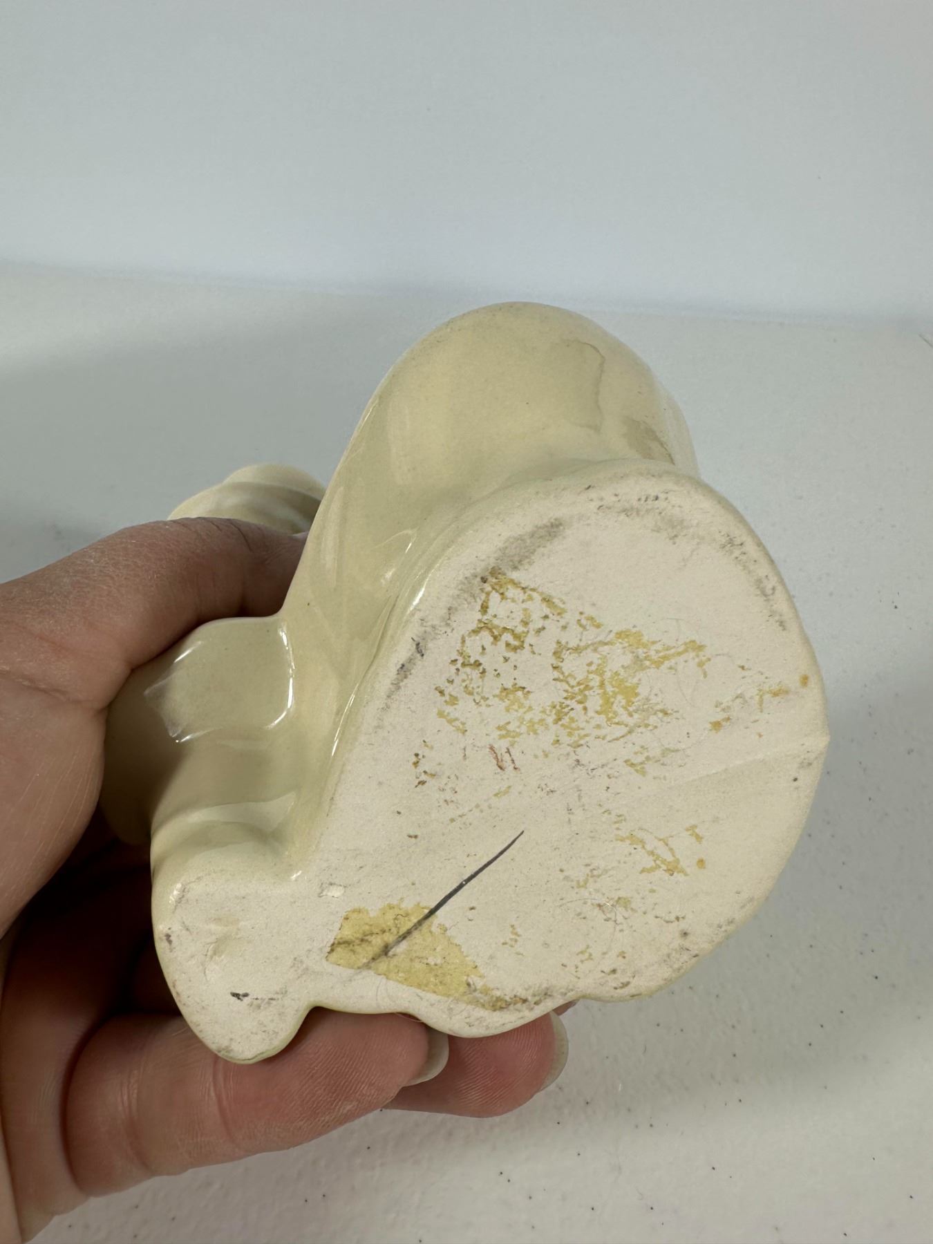 Includes a grouping of pottery planters and novelty pieces including a green swirl planter, yellow-green glaze planter, ceramic lady head planter, and figural novelty pieces. Fun decorative mix.