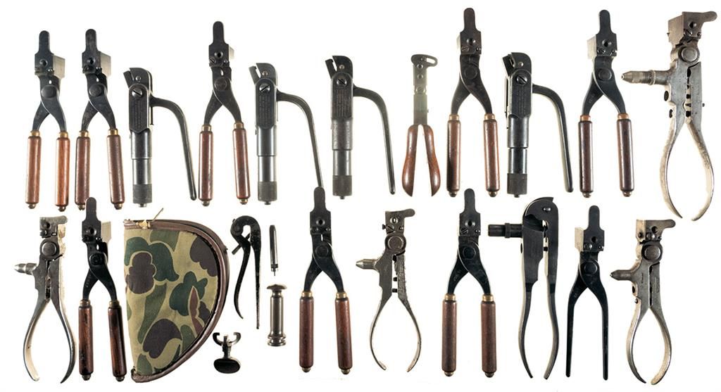 Lot includes primer seaters/extractors, Winchester and Ideal multitools, and bullet molds, all in an assortment of rifle calibers including 45-9038-56 WCF, 30 WCF, 44-77, 40-82 and others. In good or better condition overall.