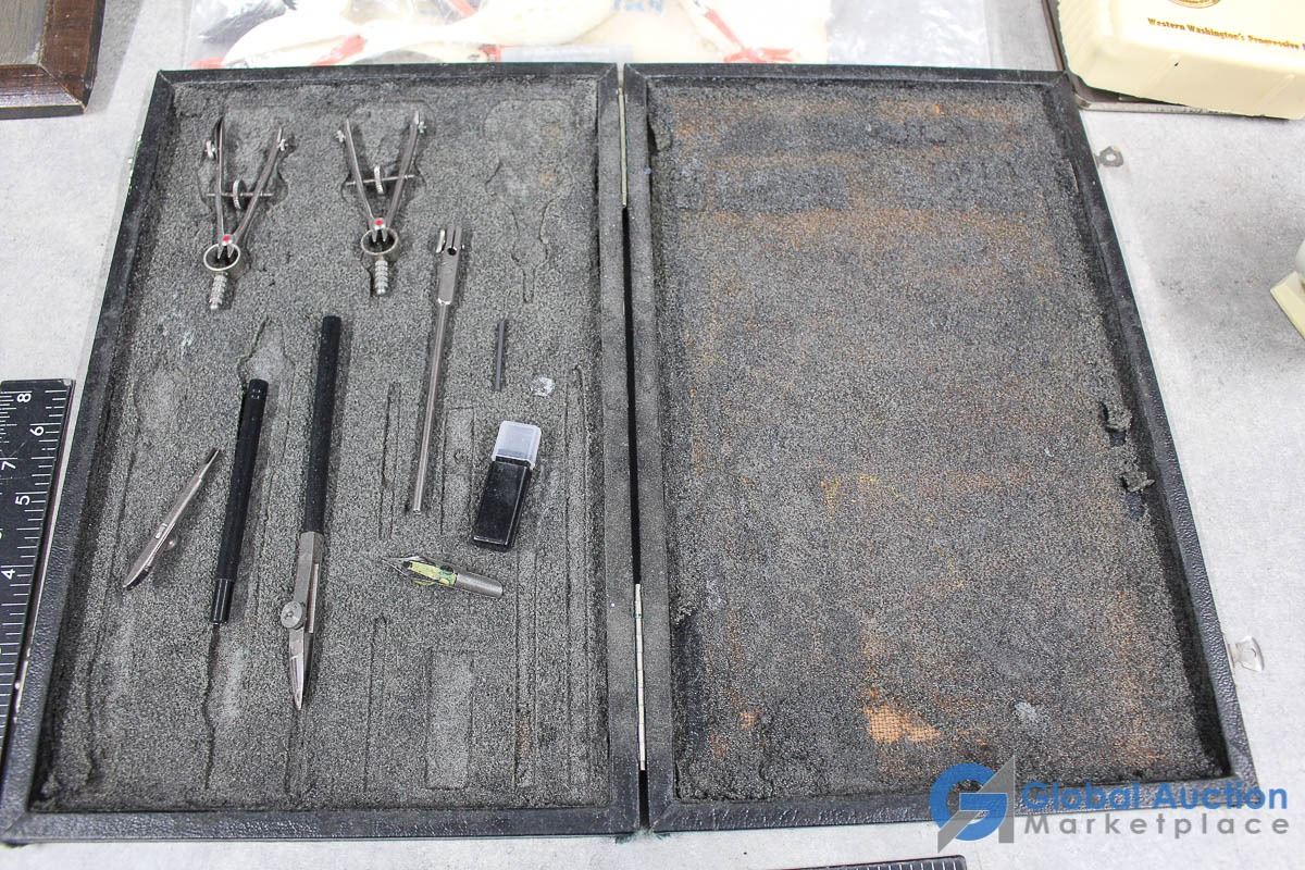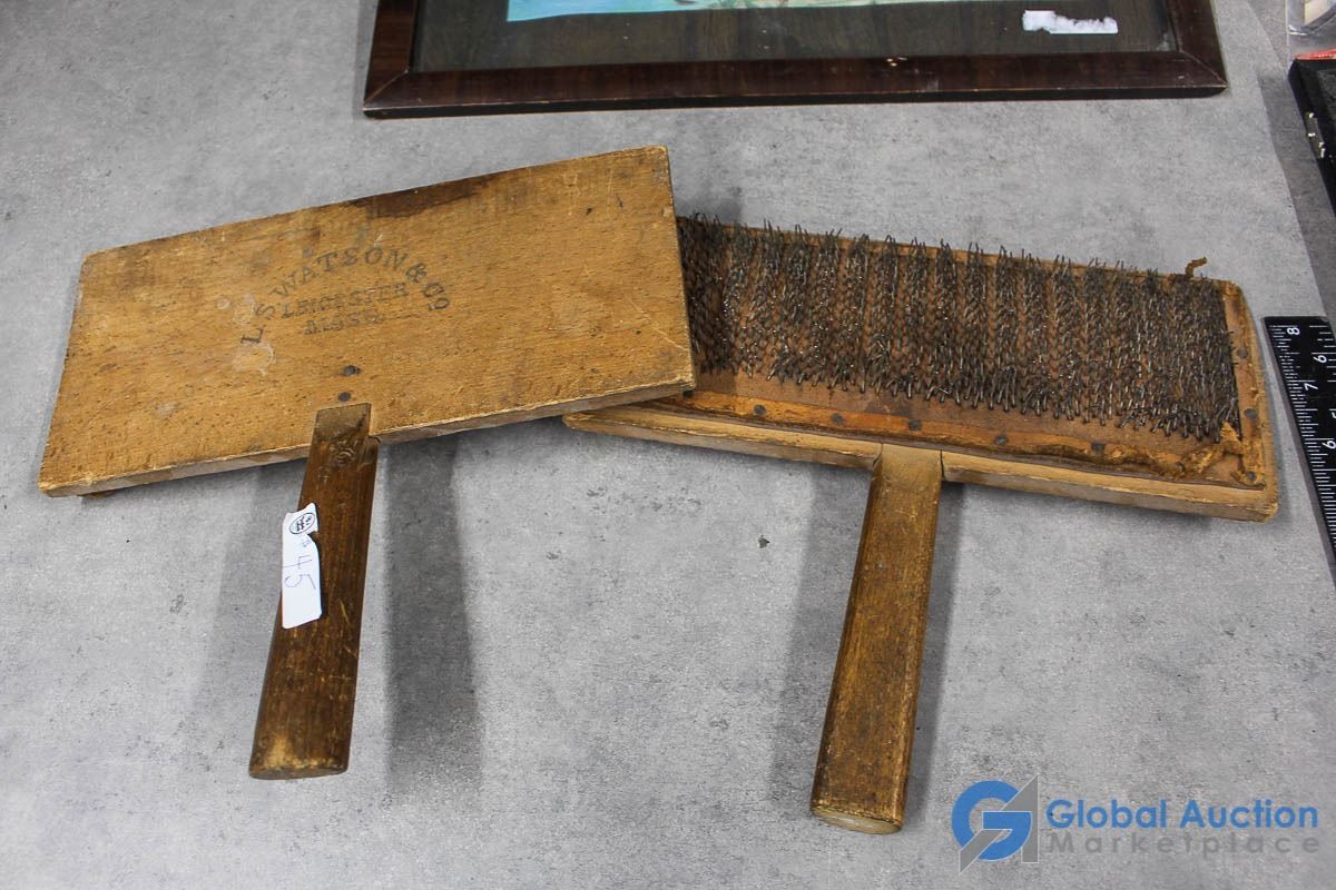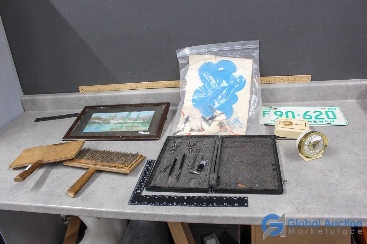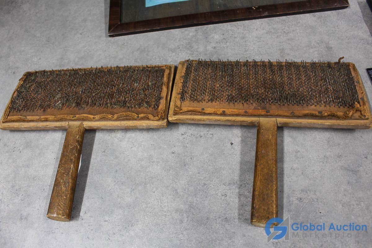 Carding brushes, geometry tools, framed drawing, clock & more.