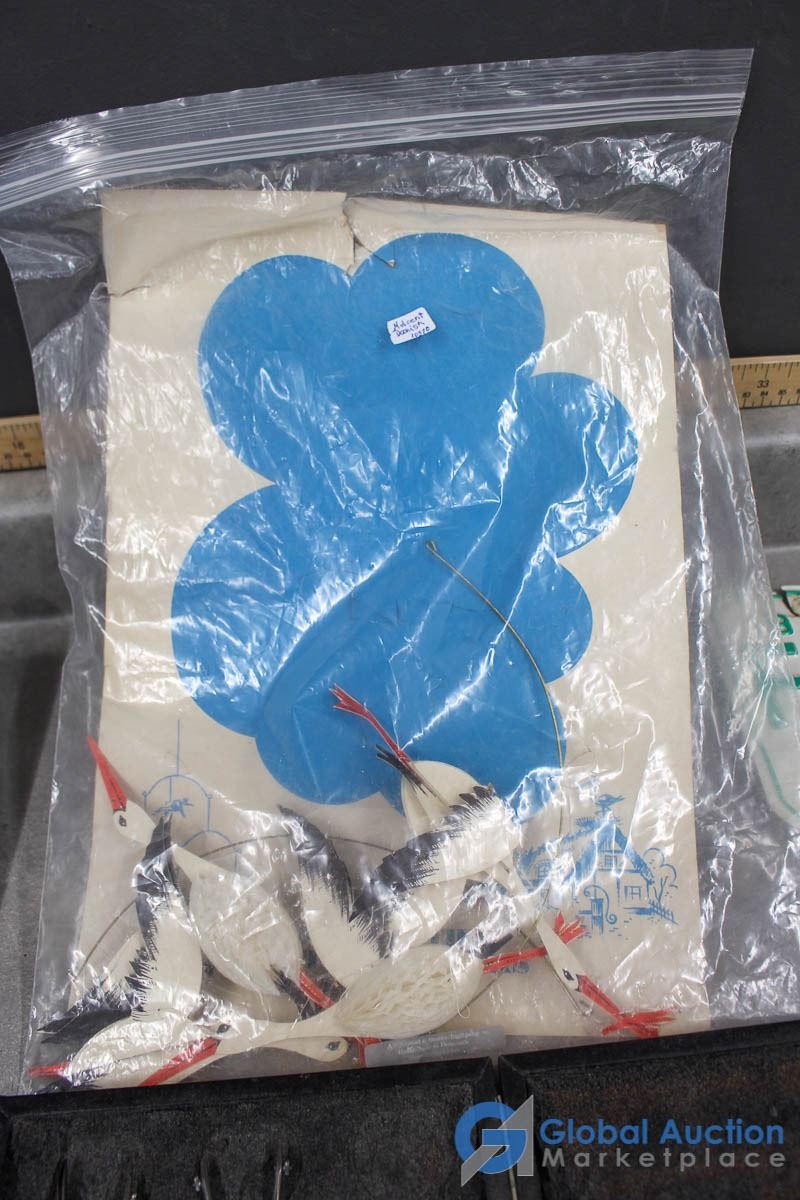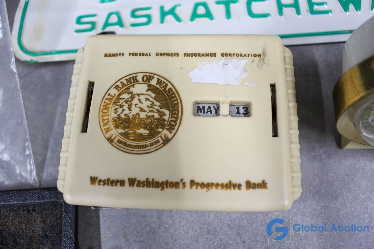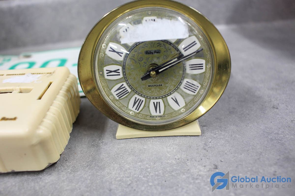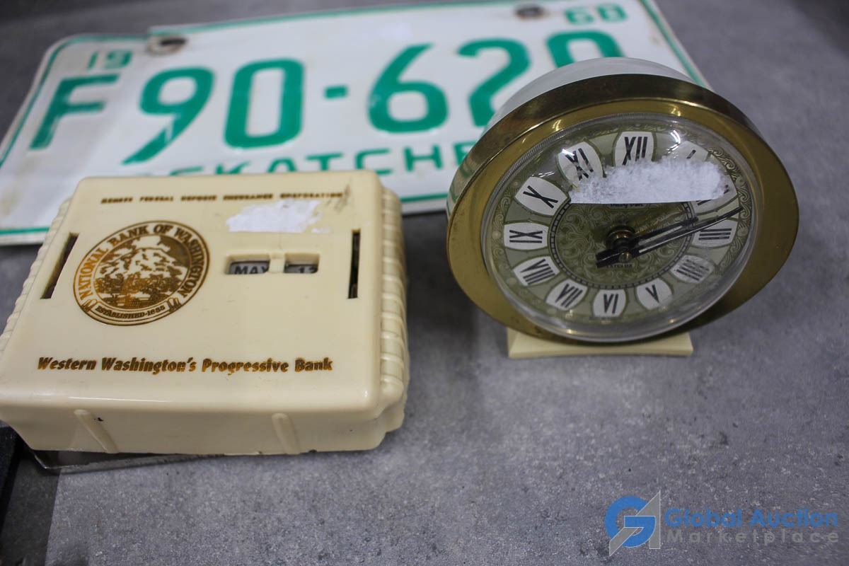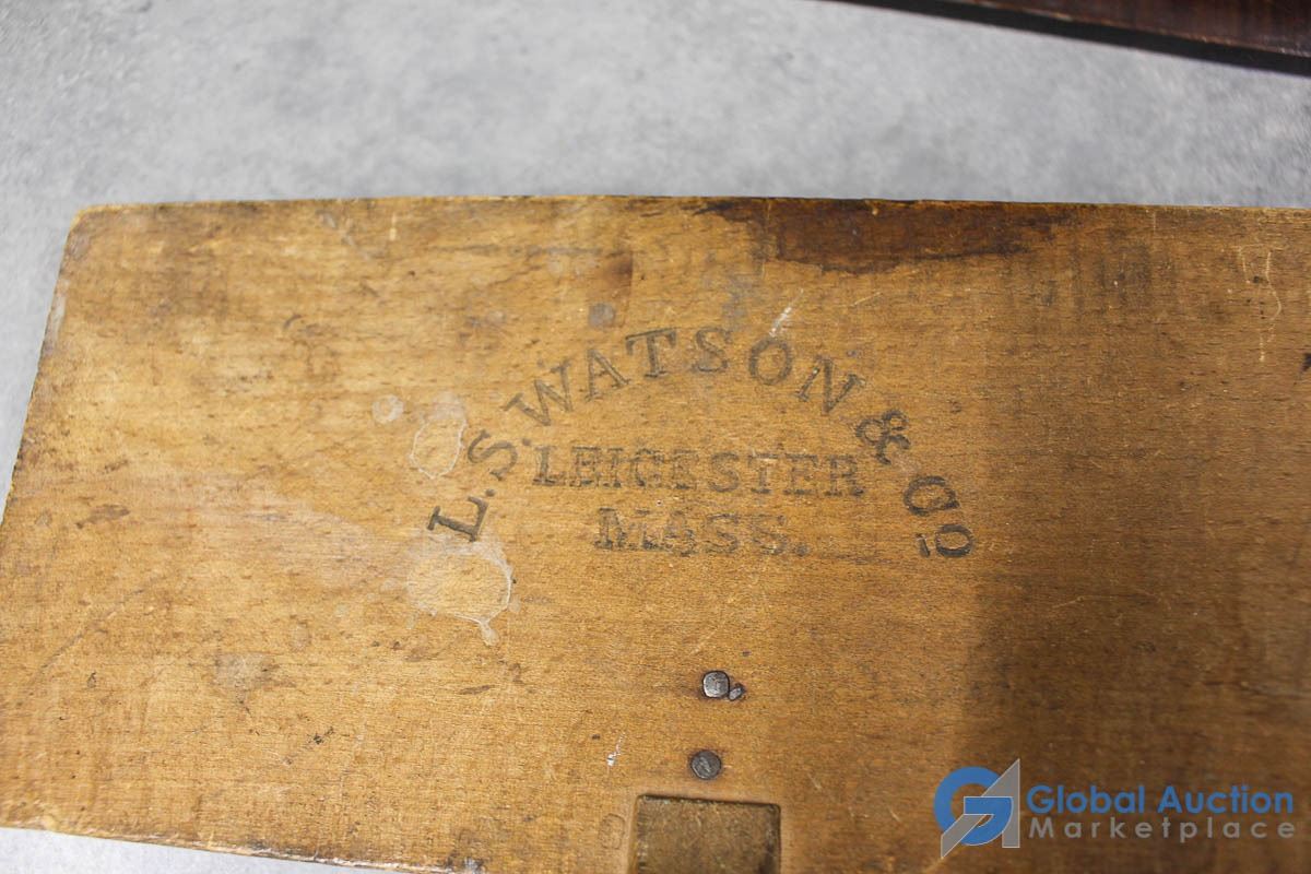 Carding brushes, geometry tools, framed drawing, clock & more.
