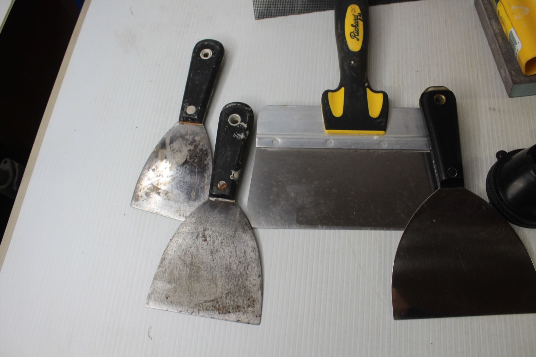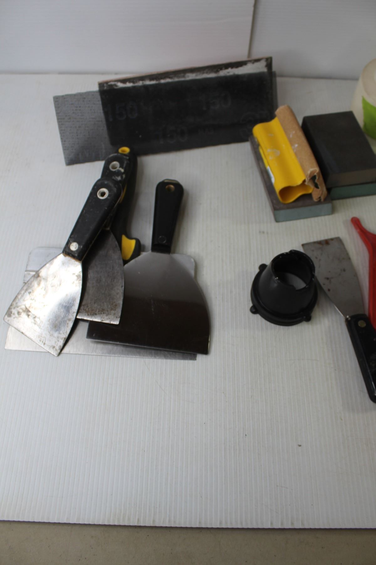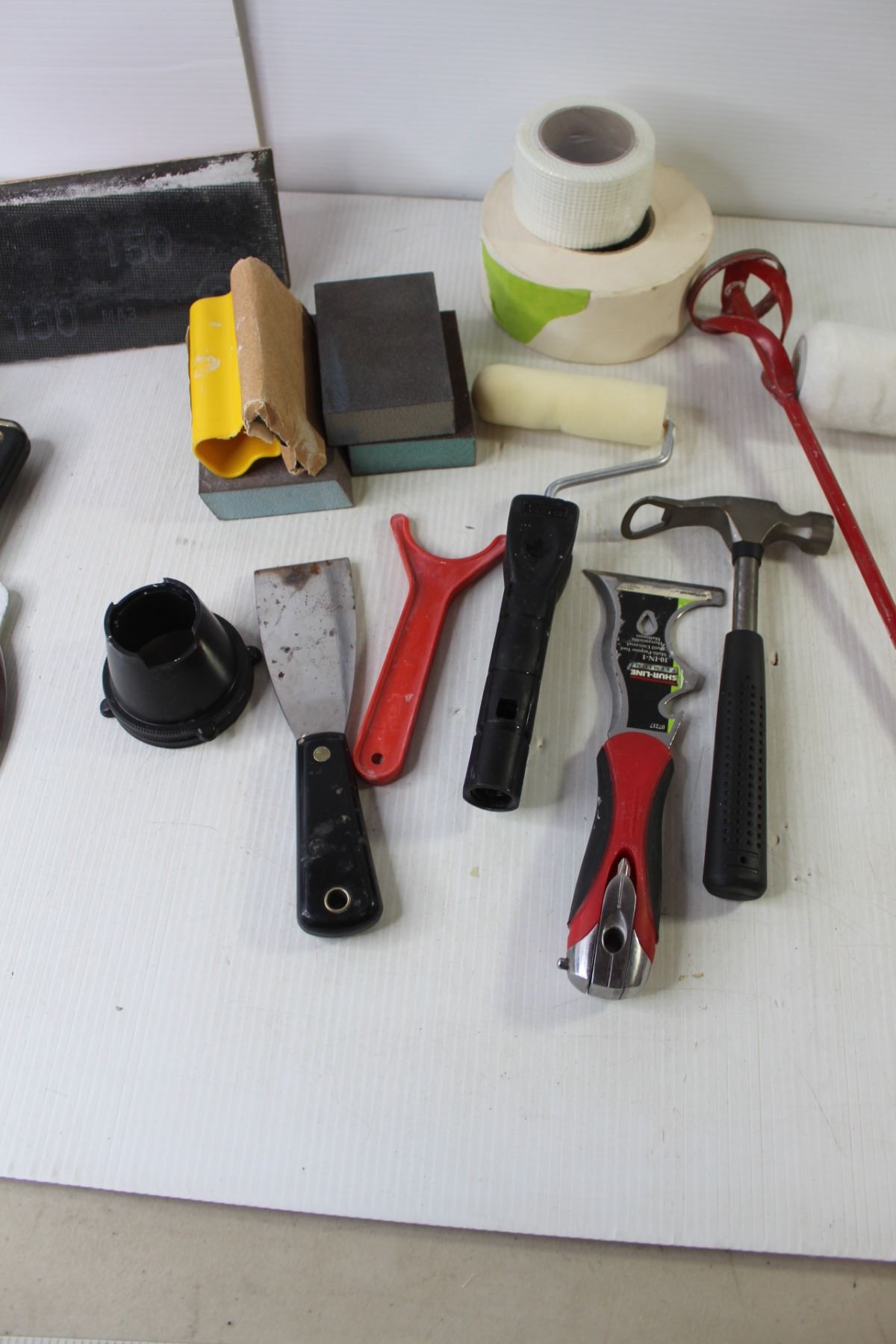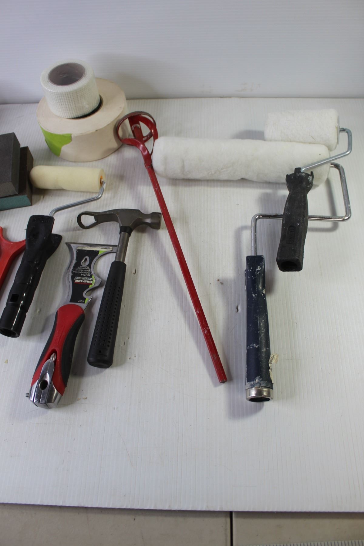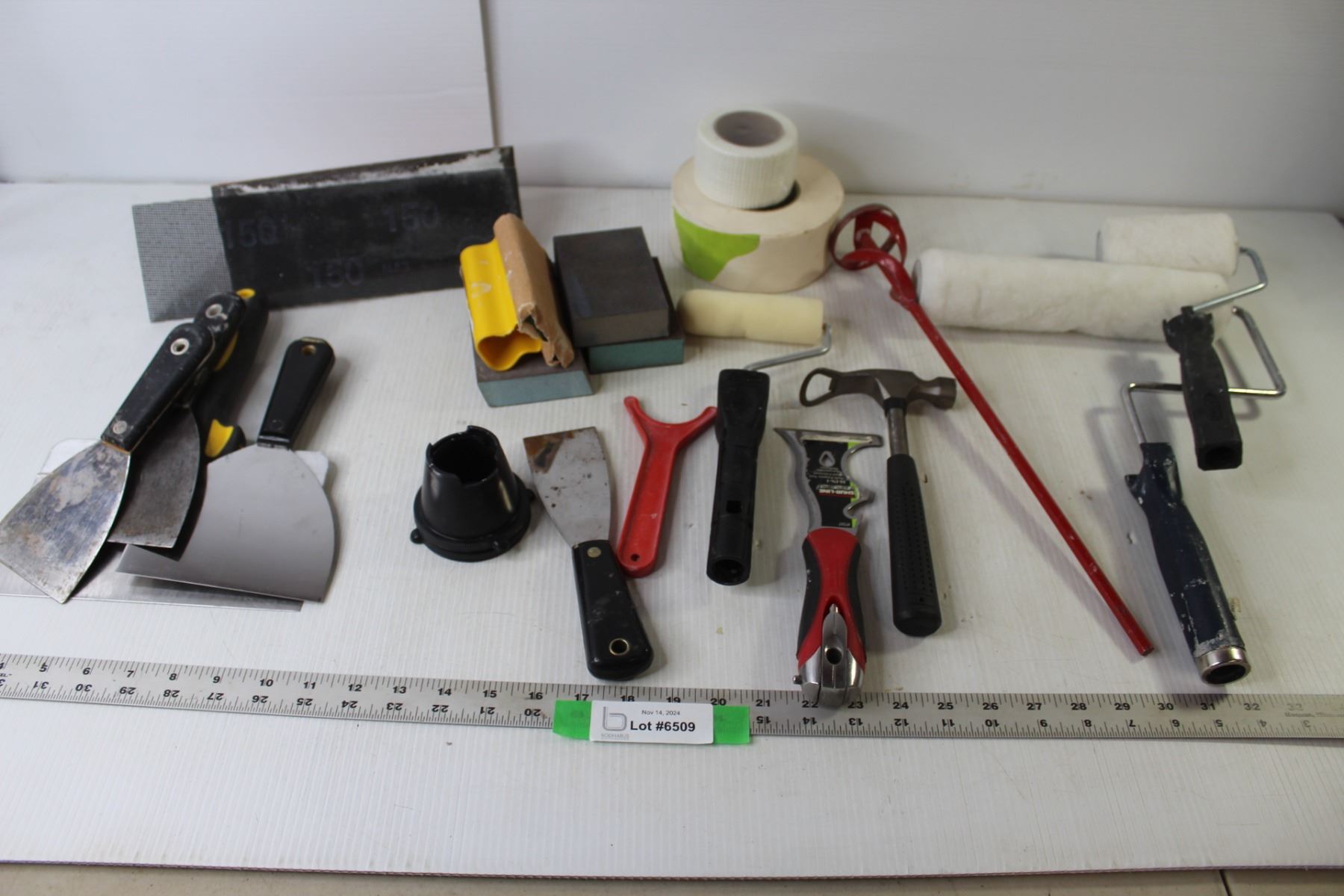 Assorted Wall Repair Items (Sanders, Tape, Mudding Trowels), Paint Rollers, Mixer, Shur-Line 10 In 1 Multipurpose Tool, Misc.