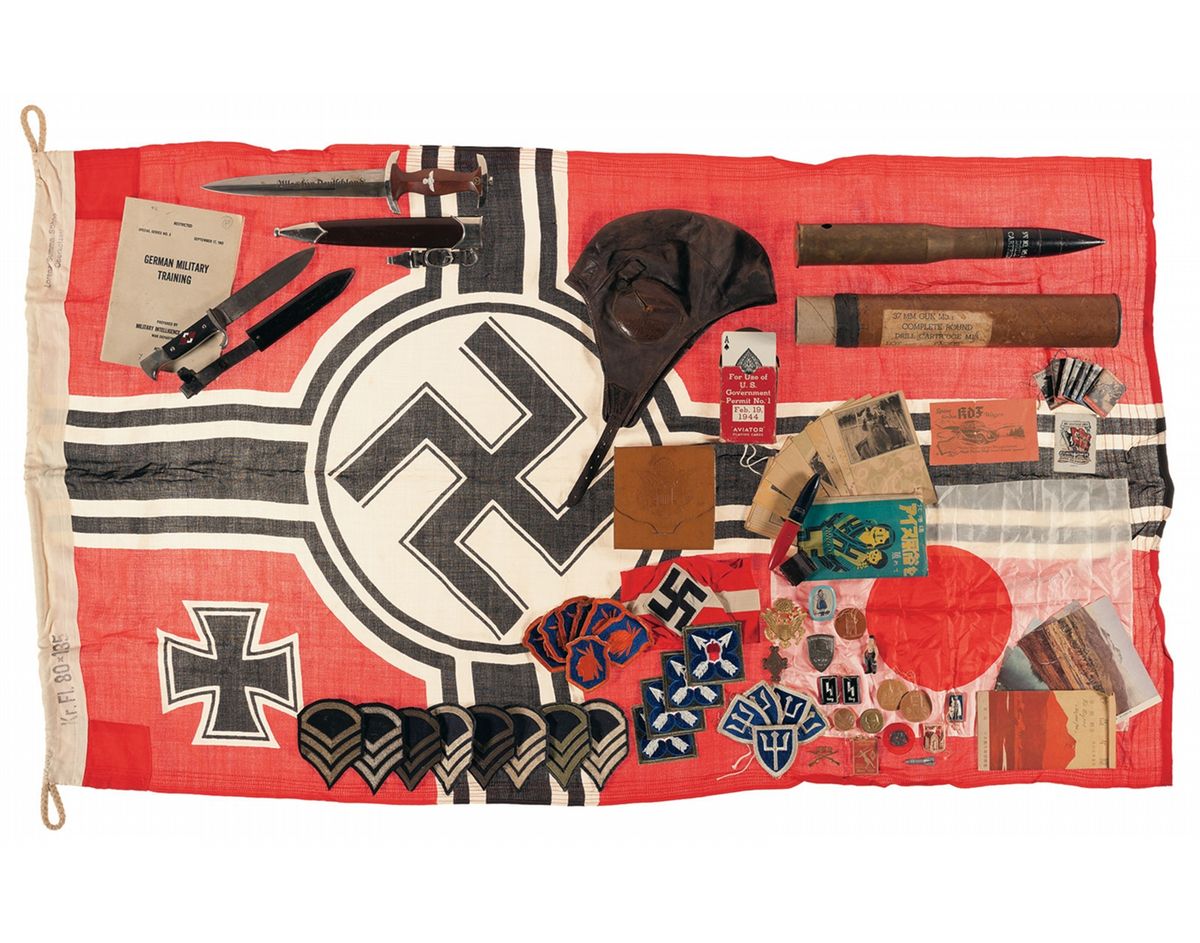 SA service dagger with sheath, Hitler Youth knife with sheath, U.S. Army cribbage set, small Japanese flag, Nazi flag, Scully Brothers leather flight helmet, 37mm drill cartridge M13, 1942 dated U.S. German Military Training manual, assortment of 24 U.S. patches, deck of U.S. 1944 dated playing cards, approximately 35 U.S. and Nazi insignia, 9 small Nazi propaganda booklets, 2 packages of Japanese postcards. Includes letter of provenance stating many of the items were picked up by a merchant Marine during and after the war.