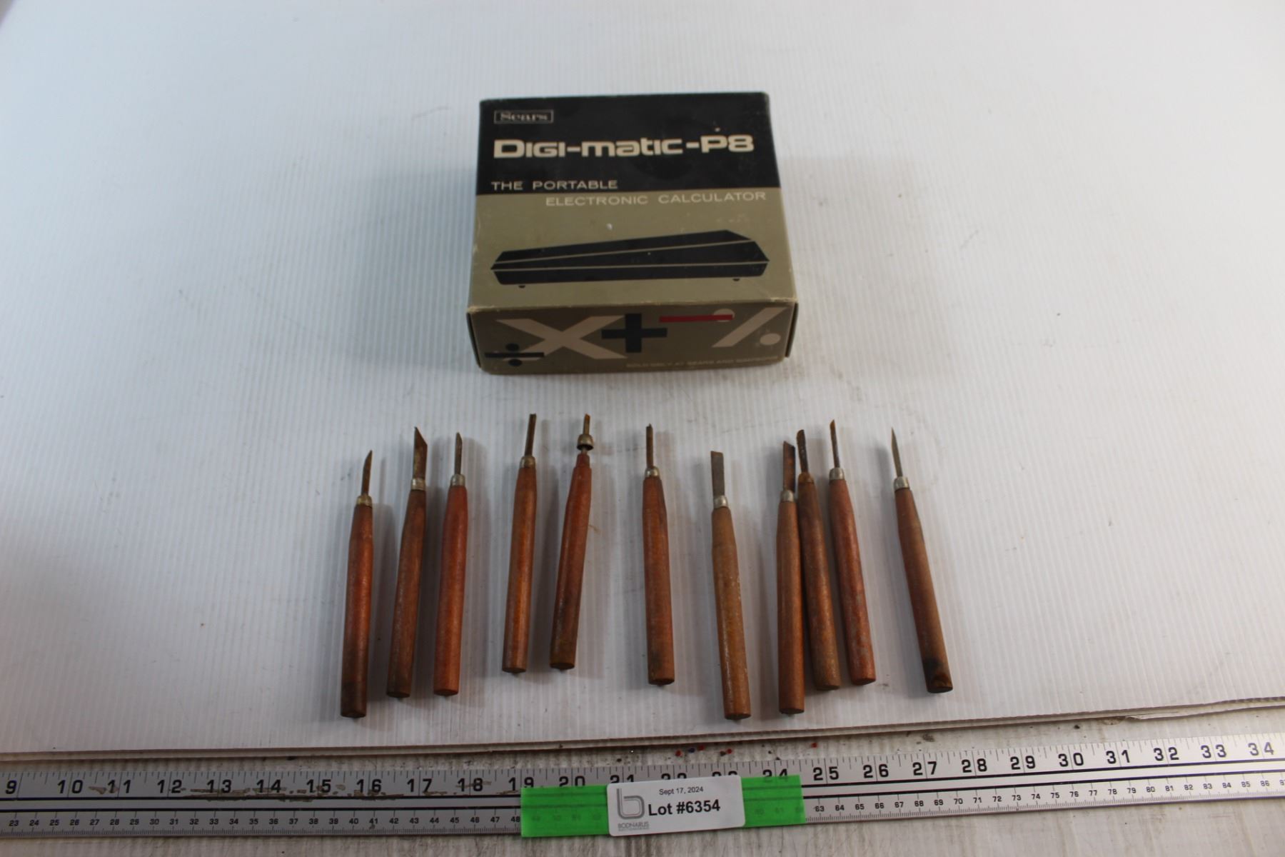 Assorted Wood Chisels and Sears Digimatic P8 Electronic Calculator
