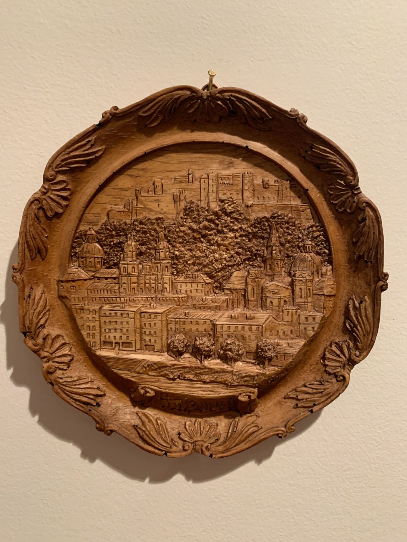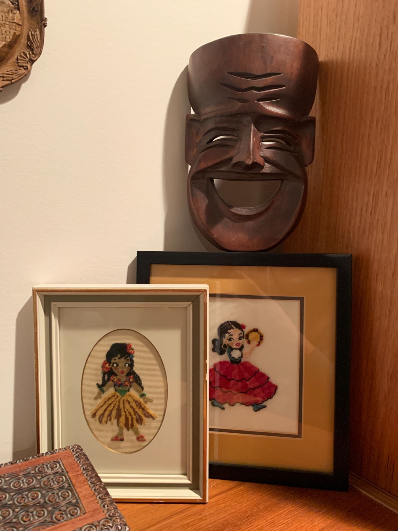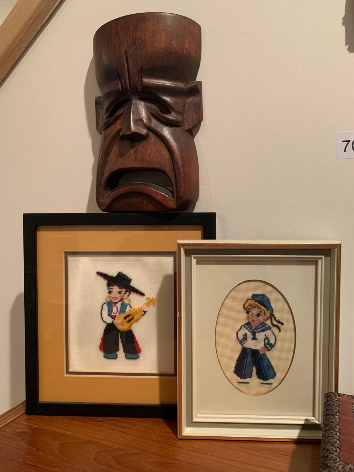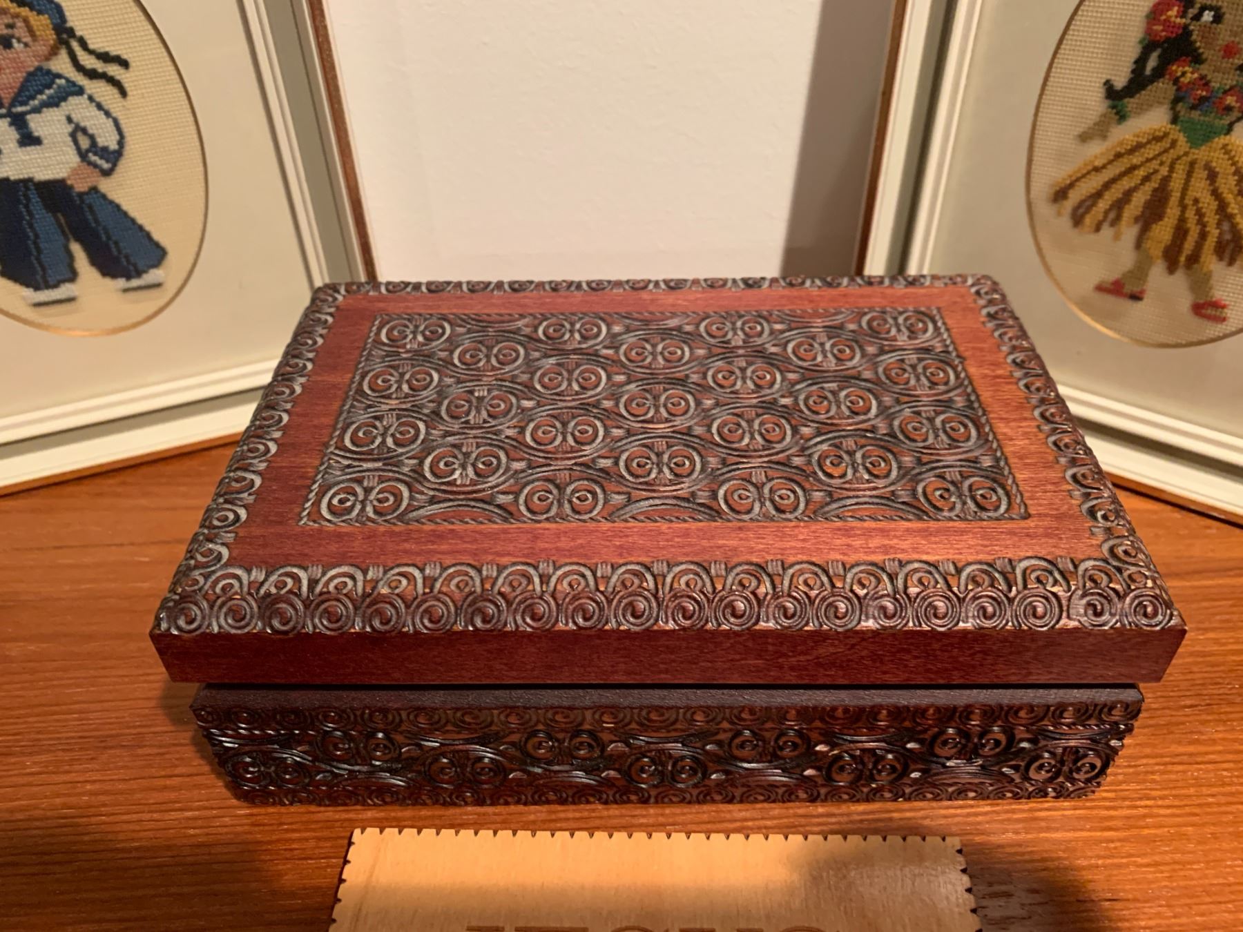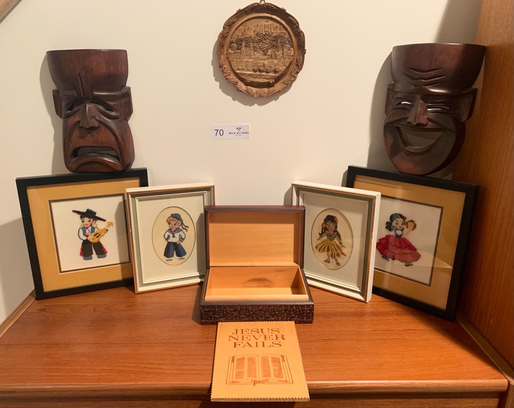 Assorted Wooden Decorations, Engraved Wooden Jewelry Box, & Framed Needlepoint Artwork