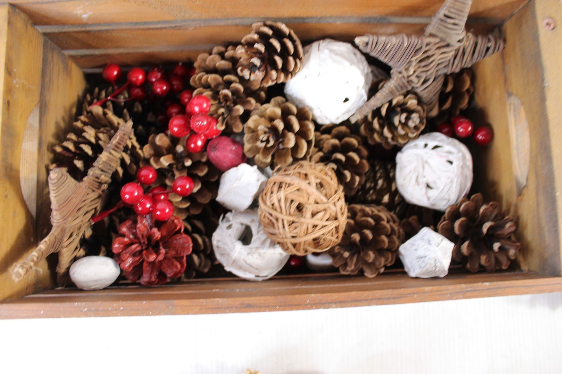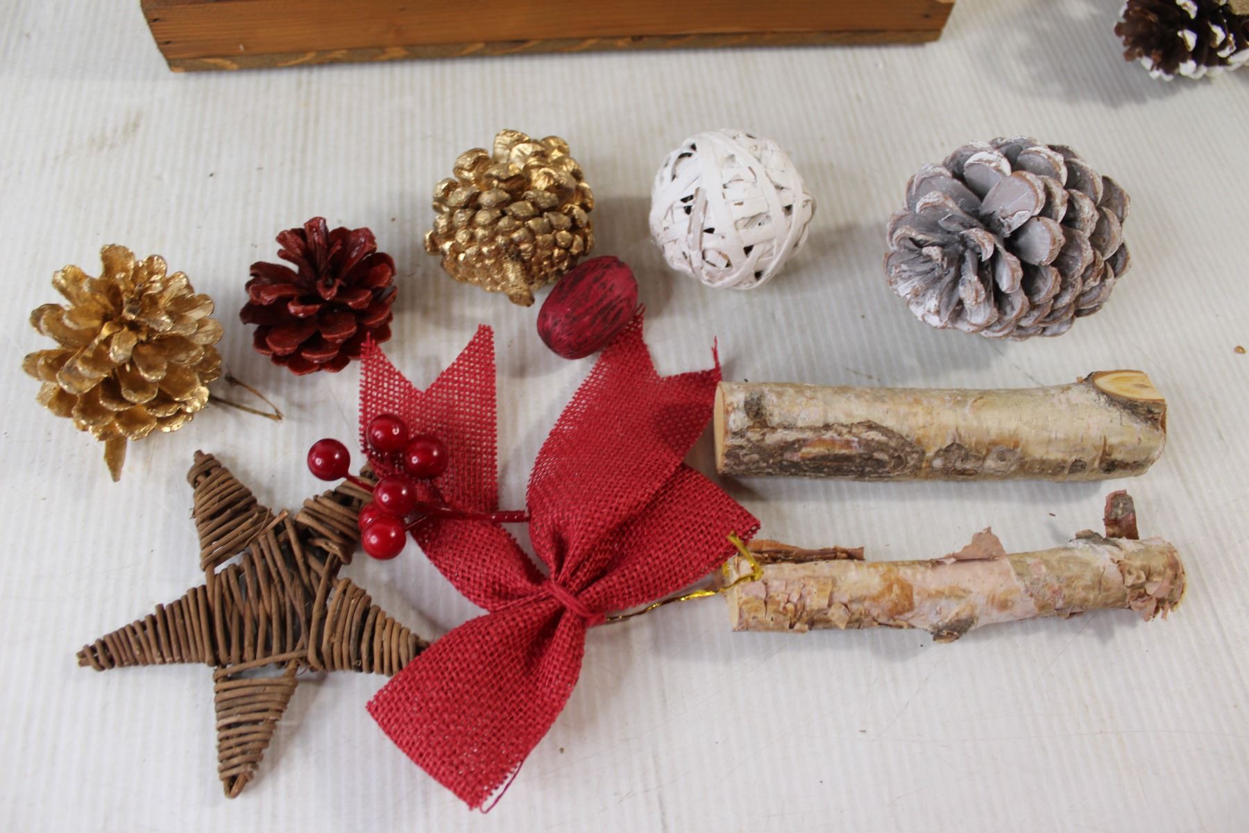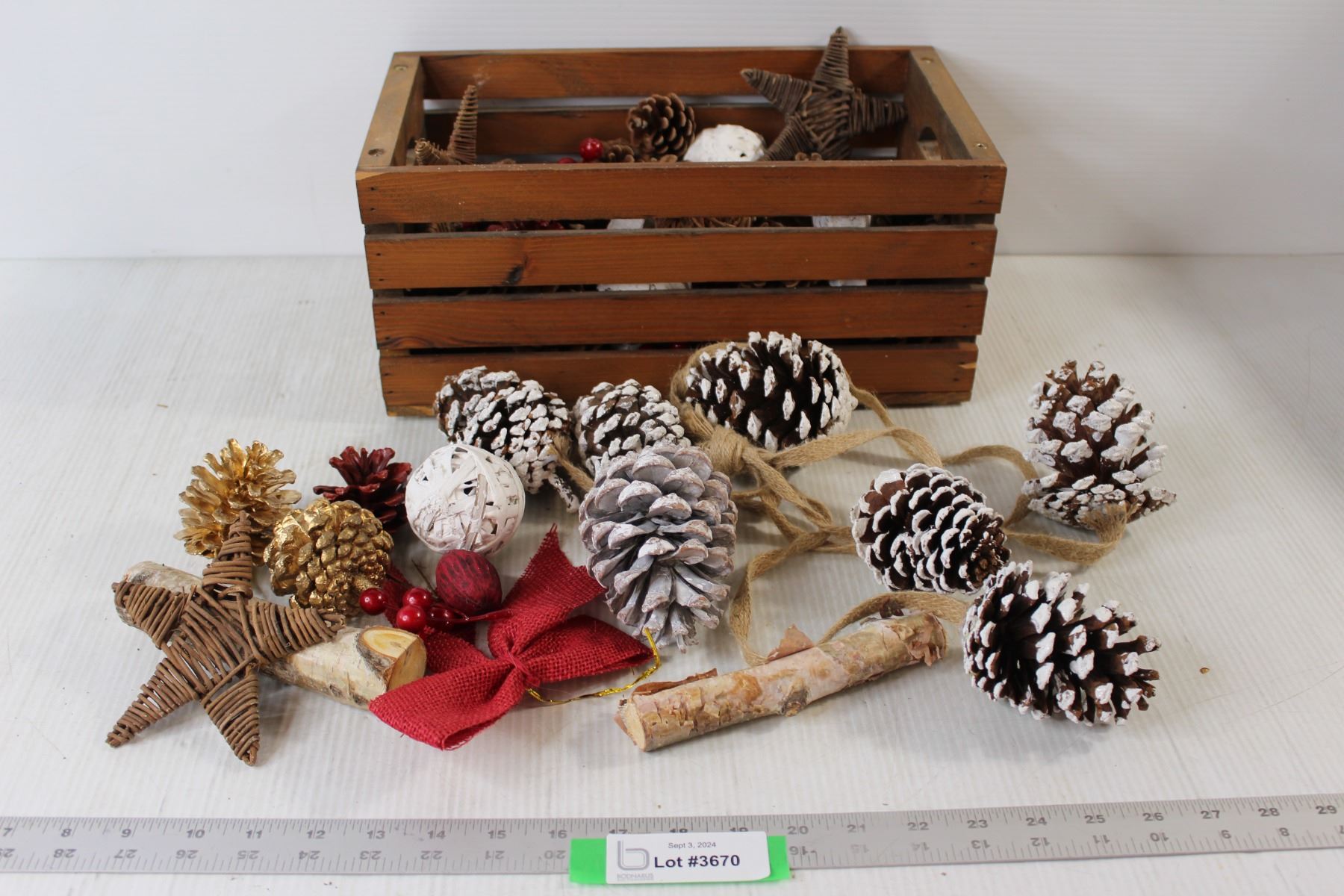 Assorted Wooden Pinecones Decorations and Various Christmas Holiday Decorations
