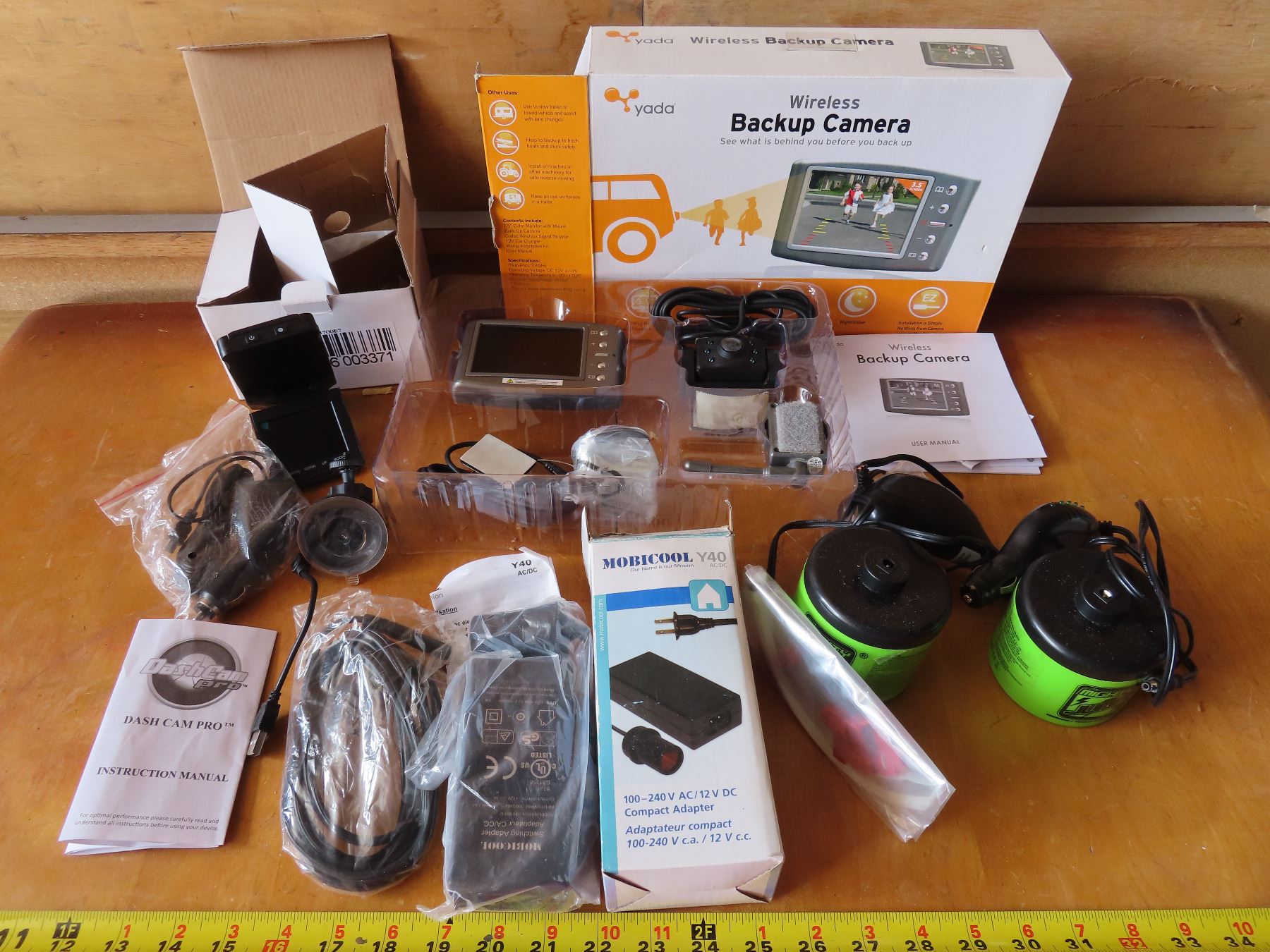 Assorted car accessory items including Dashcam Pro, Emergency jumper, etc.