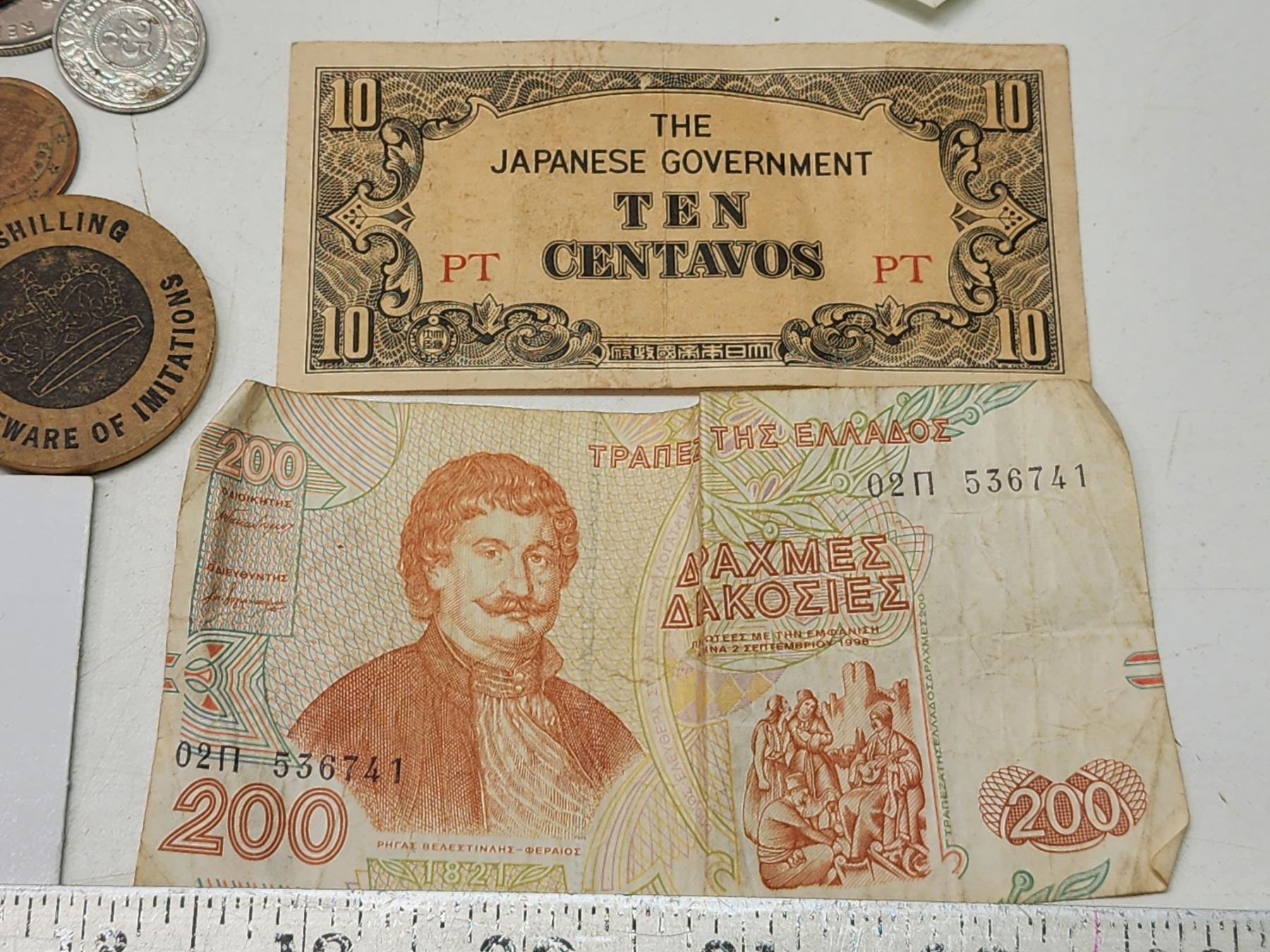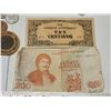 Assorted coins and bill in box