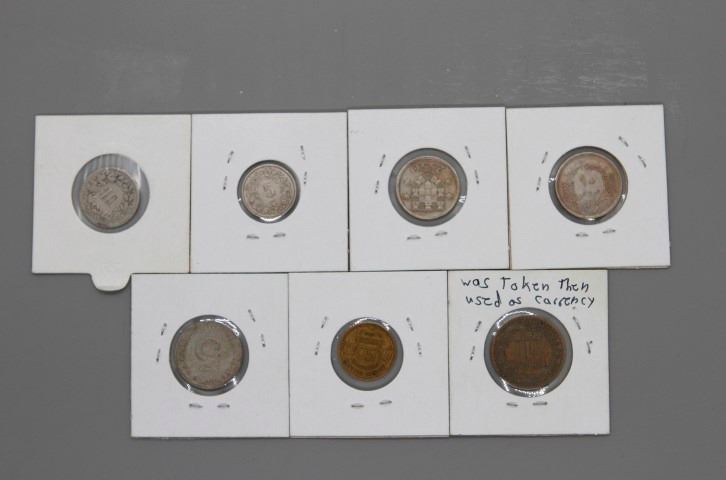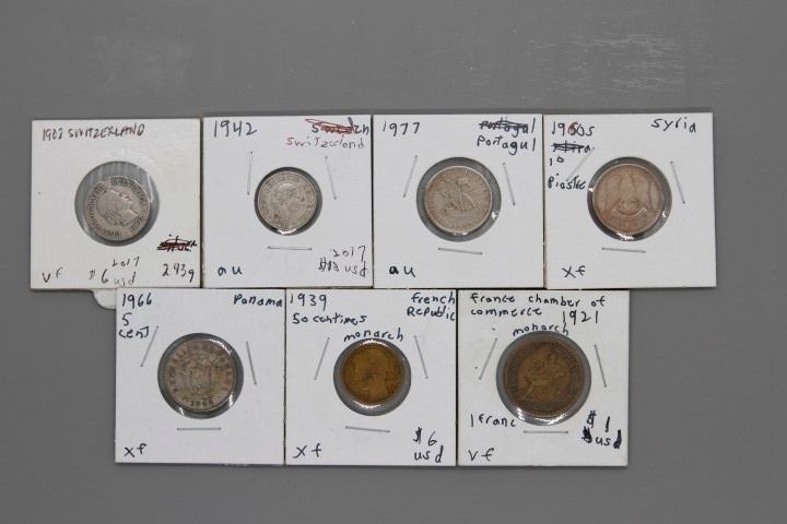 1902 Switzerland 10 VF, 1942 Switzerland 5 a.u., 1977, Portagul 2 $50 a.u., 1907 Syria coin XF, 1921 1 Franc VF, 1939 50 centimes XF, 1966 Panama 5 cent XF