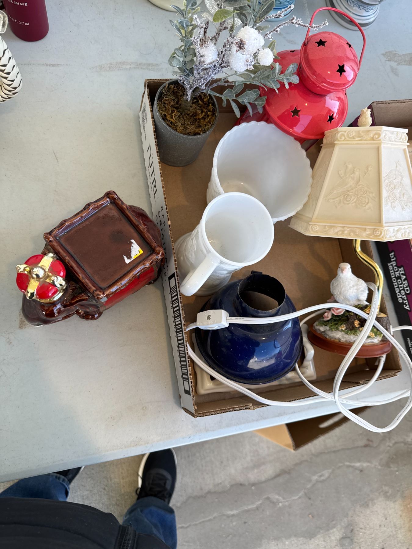 Assorted decor, lamp, elephant, decanter, etc.