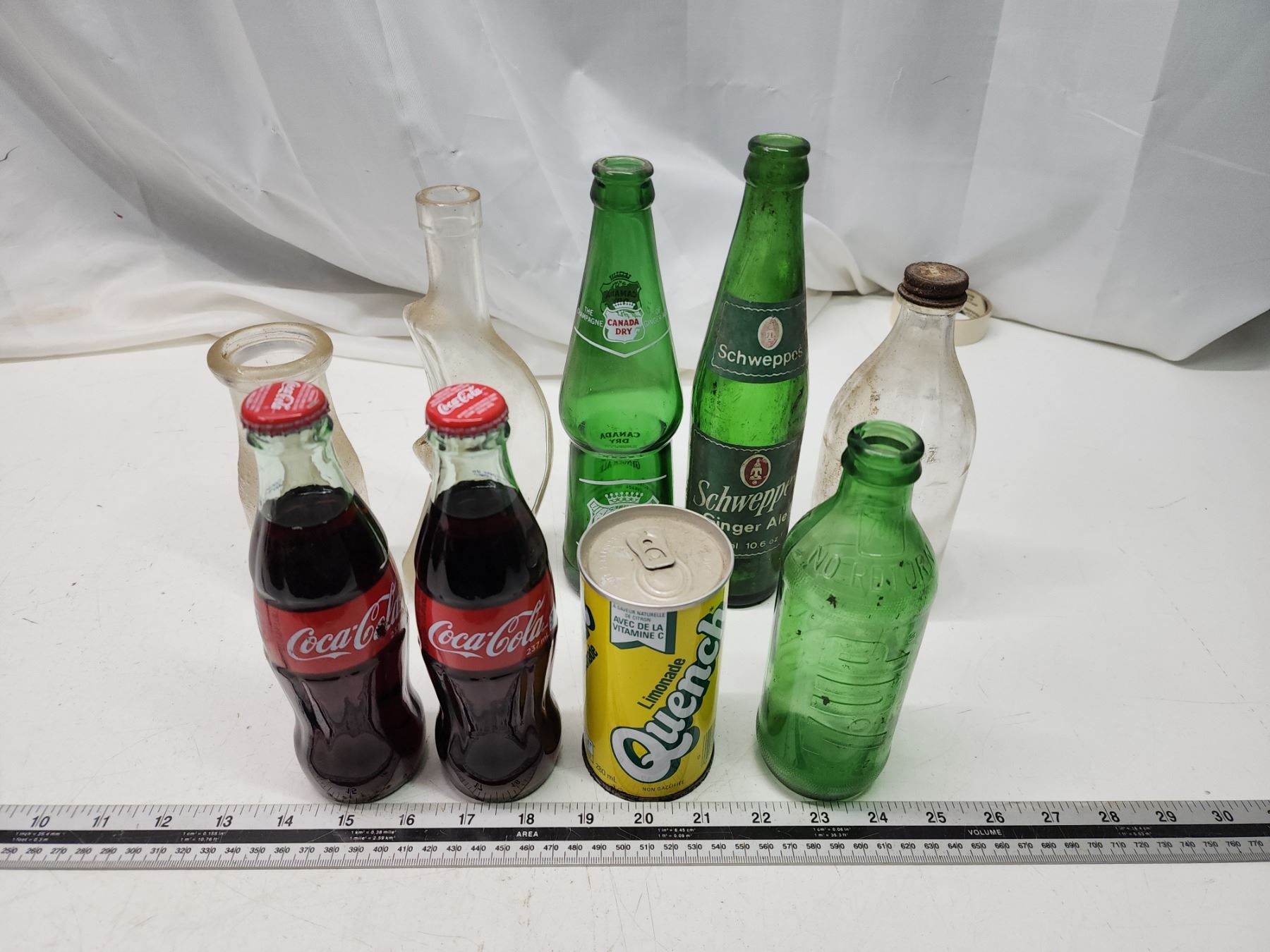 Assorted glass bottles - pop bottles, 2 full Coca-Cola, etc.