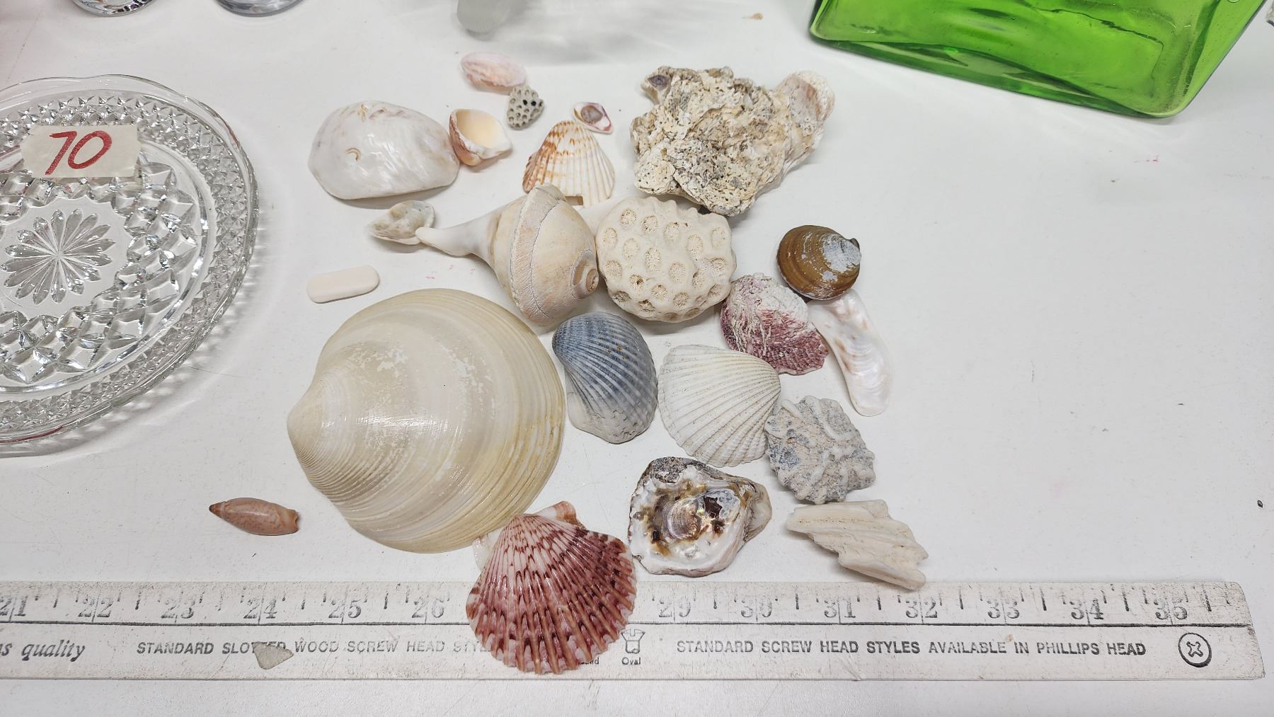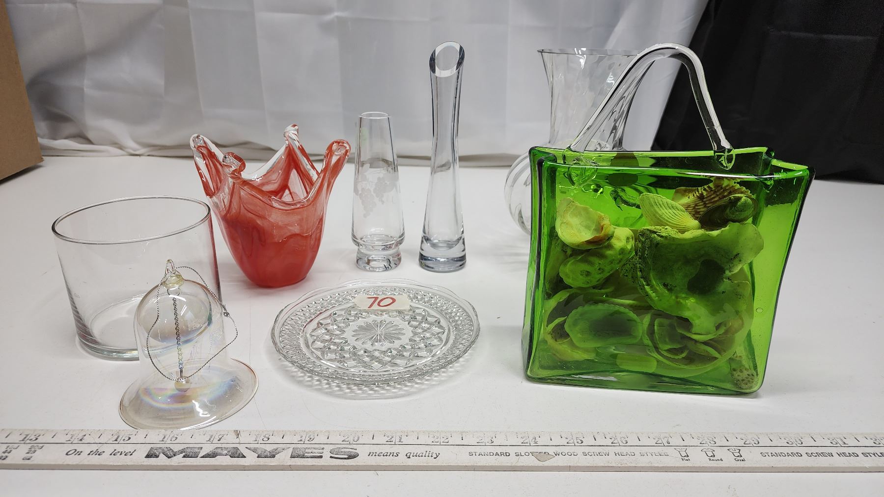 Assorted glasswares - Glass green purse filled with seashells (handle is broken), vases, etc.