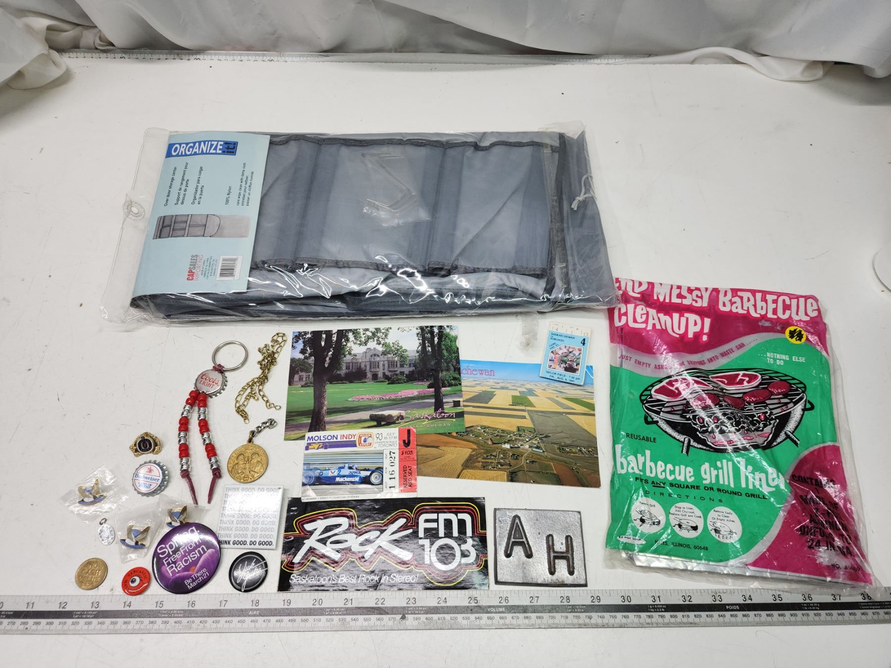 Assorted items - Over the door organizer - sealed, BBQ liners, and knick knacks
