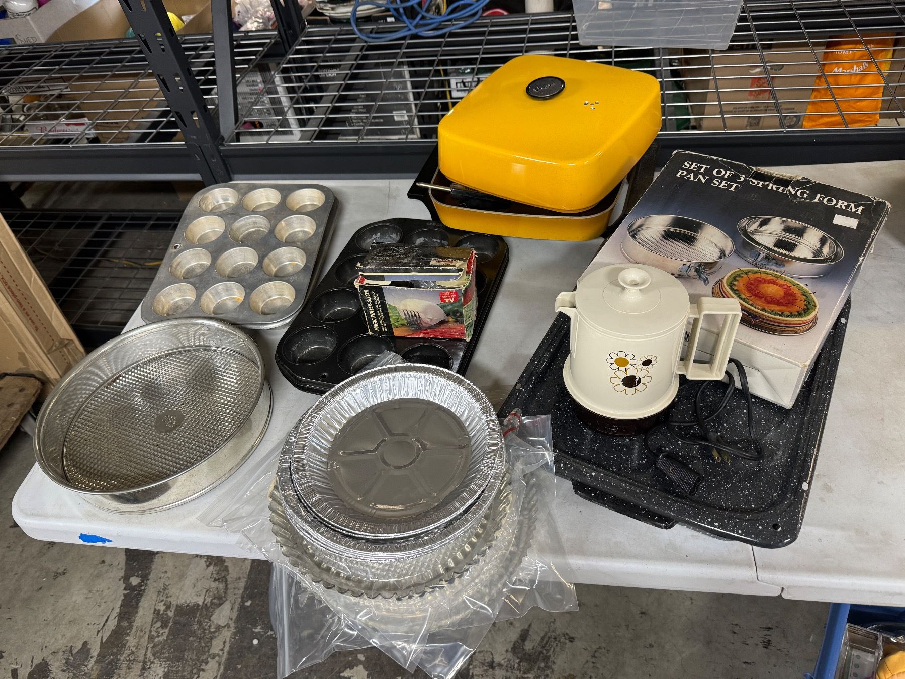 Assorted kitchen items and baking electric frying pan, springform pan, set electric kettle, etc.