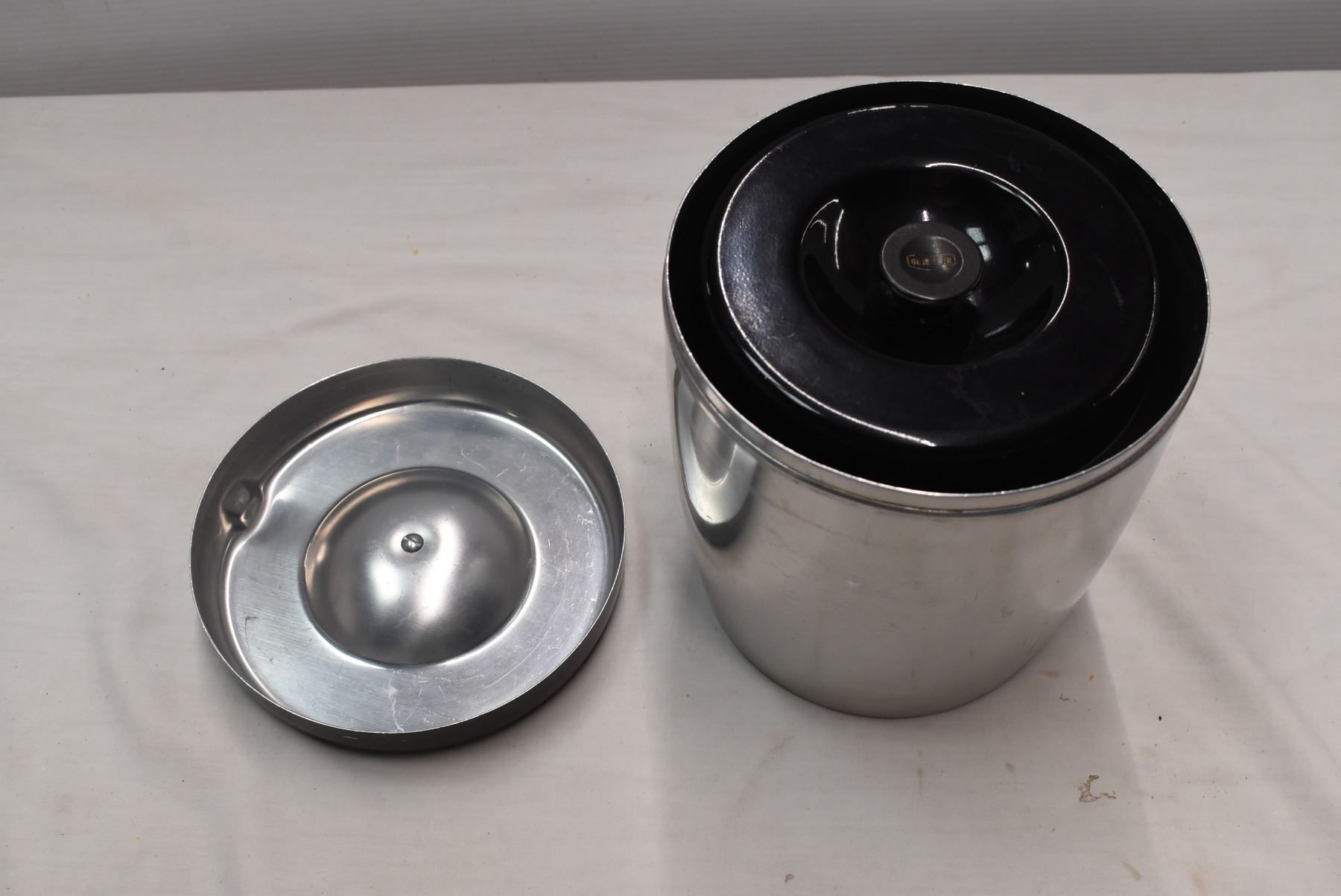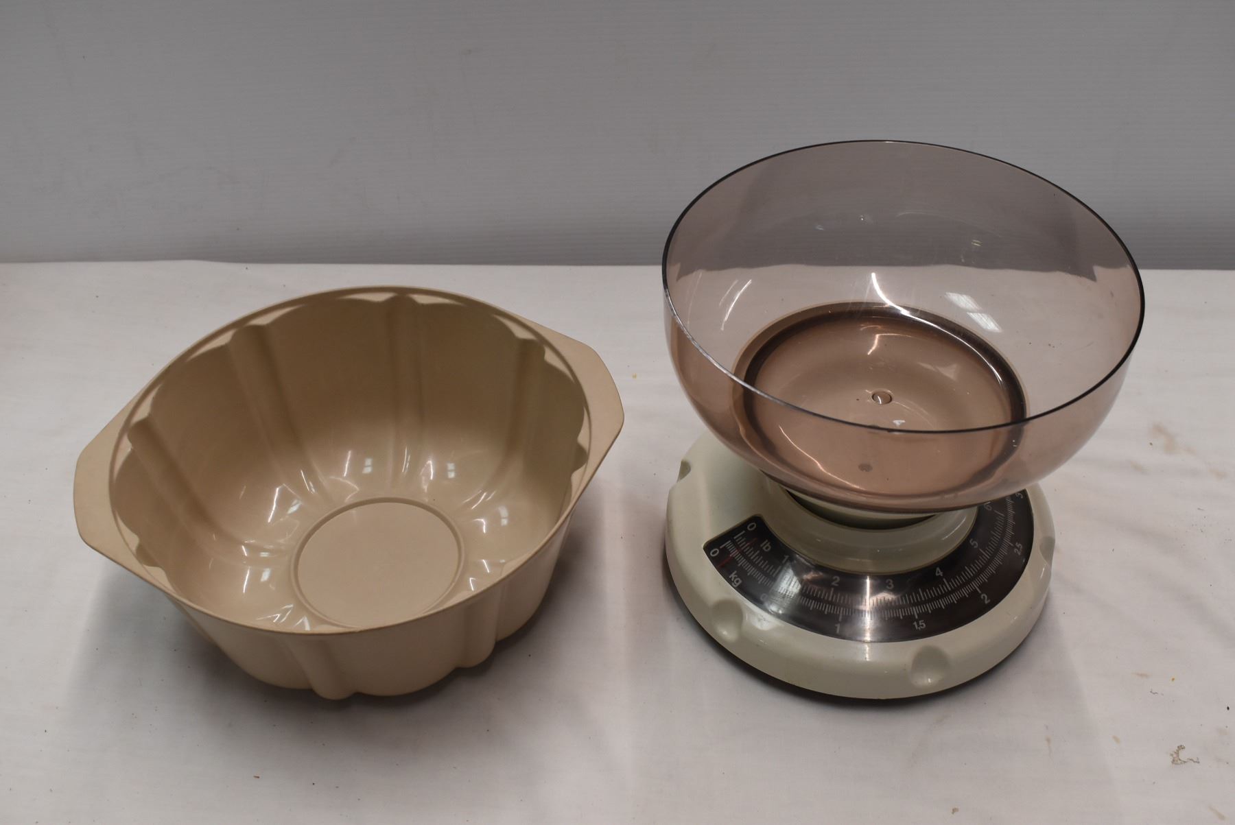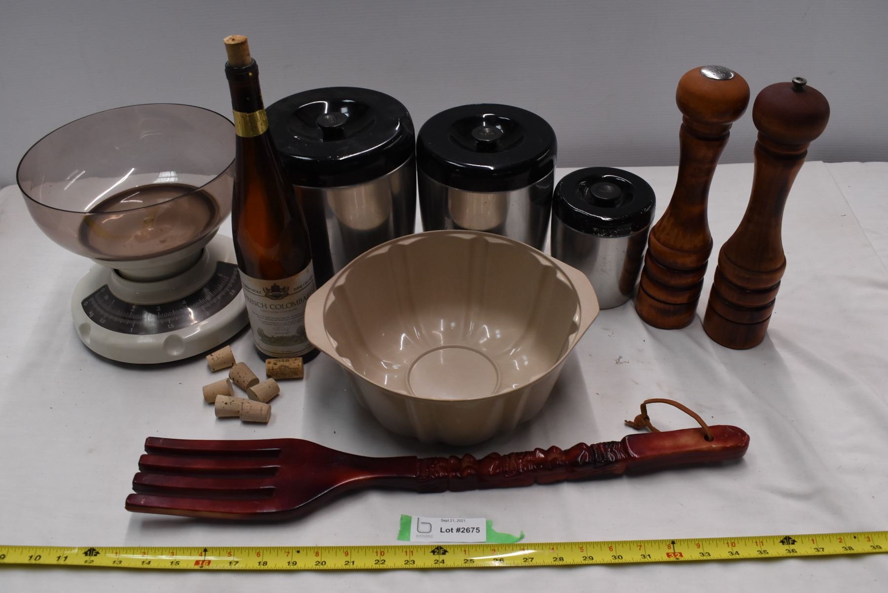 Assorted kitchen supplies. Ice buckets, scale, wine bottle & backs cratcher