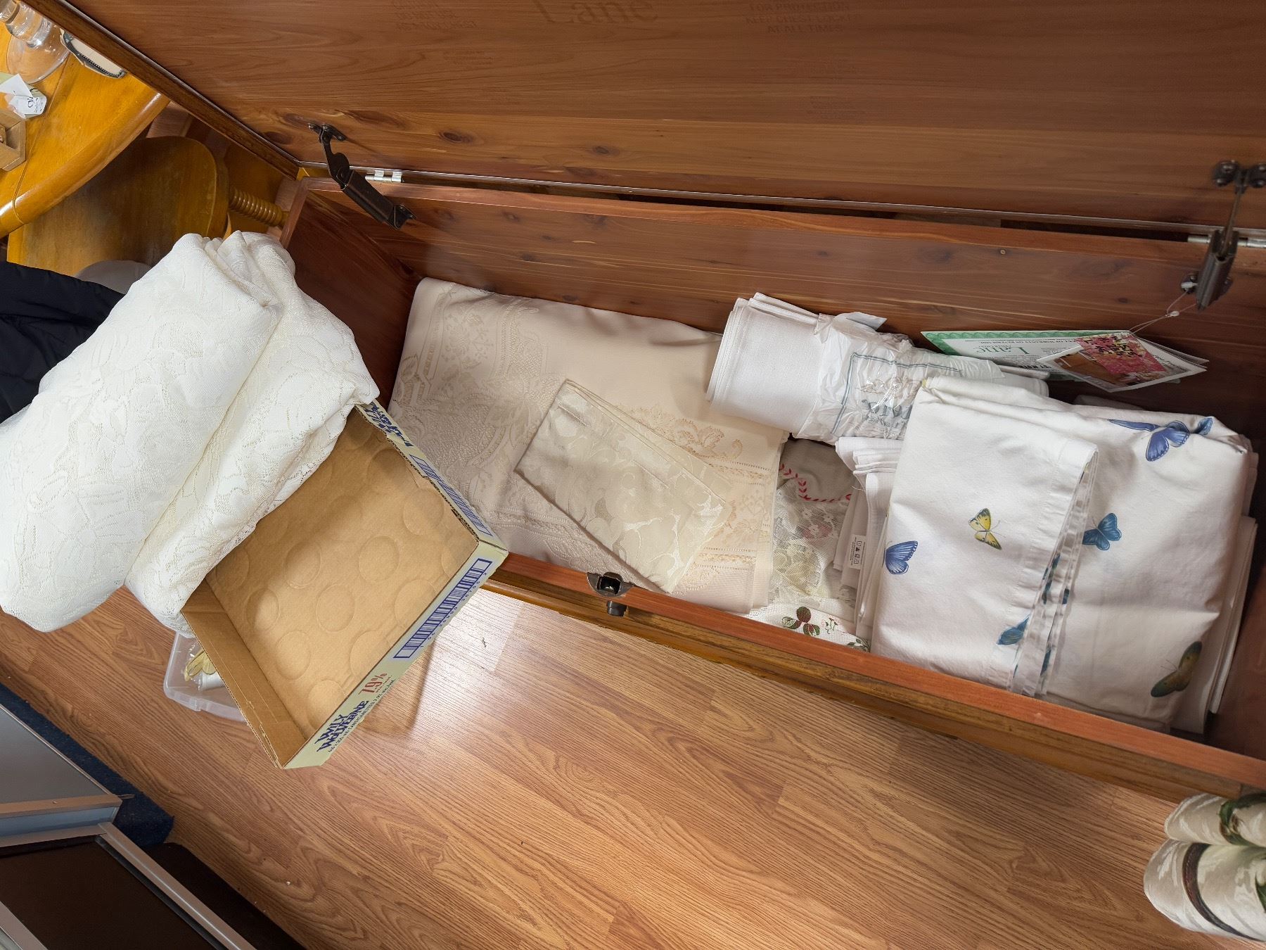 Assorted lace table, tablecloths, and other linens