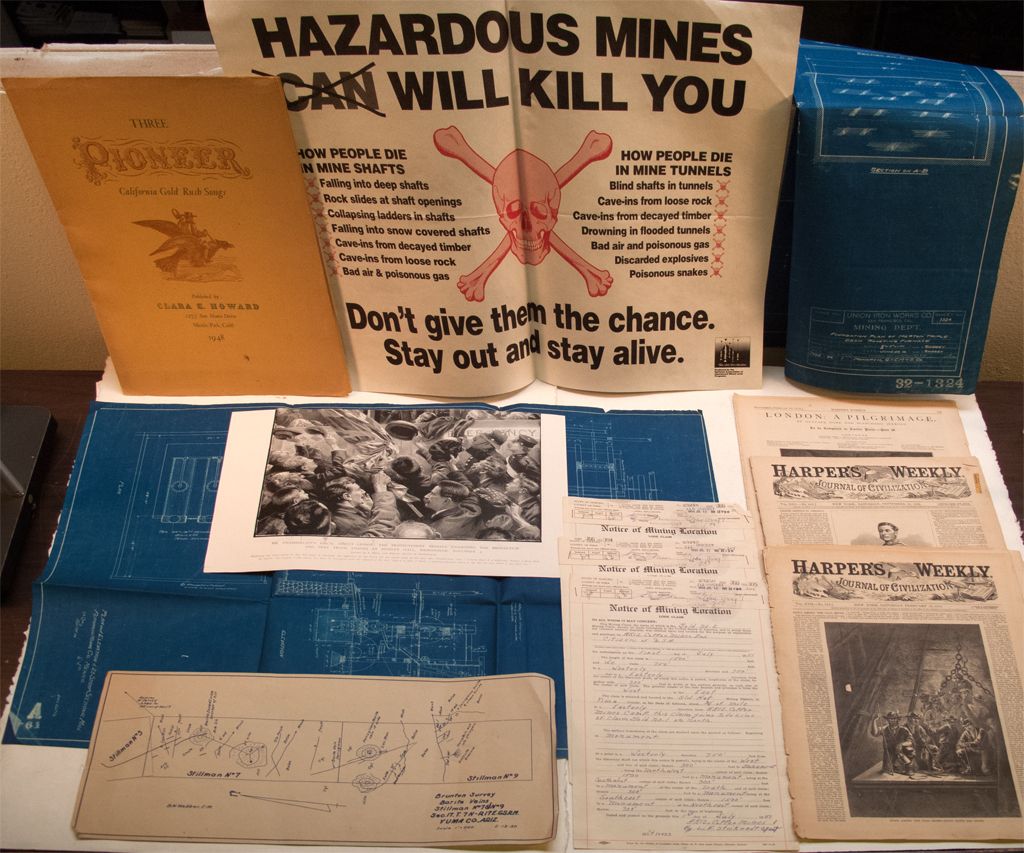 Large blueprint of the Union Works Mining Dept. Blueprint of Fernando Mining Company, Three 1951 Arizona Copper mining locations. Yuma AZ Brunton Survey of Stillman barite veins. 1948 reprint of three pioneer gold rush songs. Three 1873 Harper's Weekly's including stories on coal mining and a picture of the Union Pacific Railroad station in Sherman, Wyoming. Poster of Chamberlain's fiscal lesson.