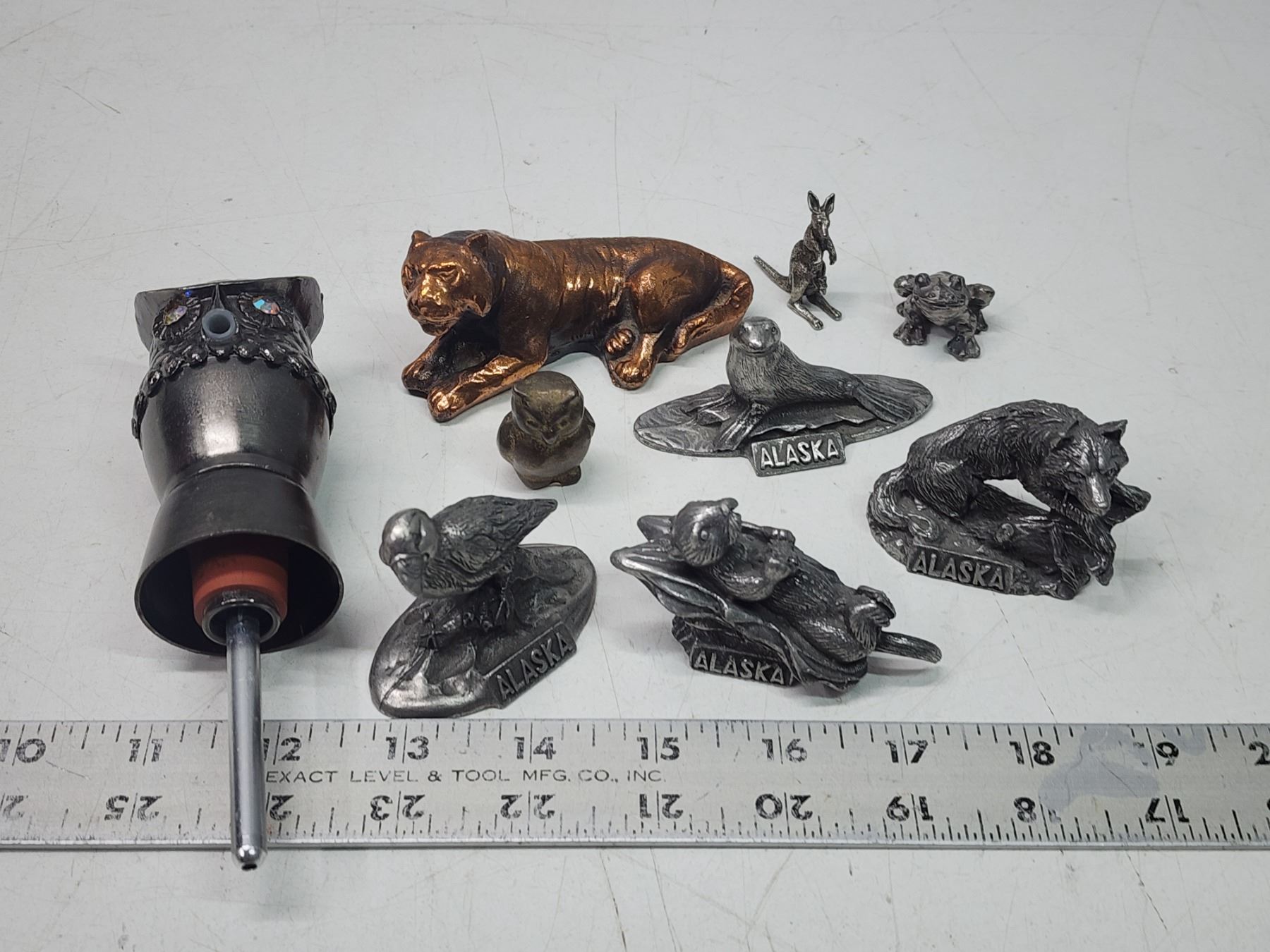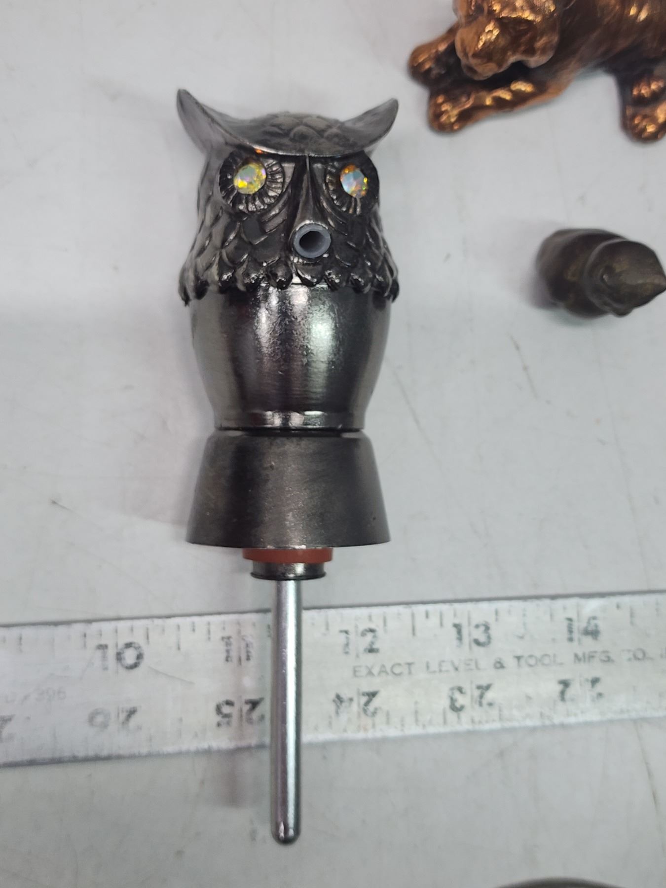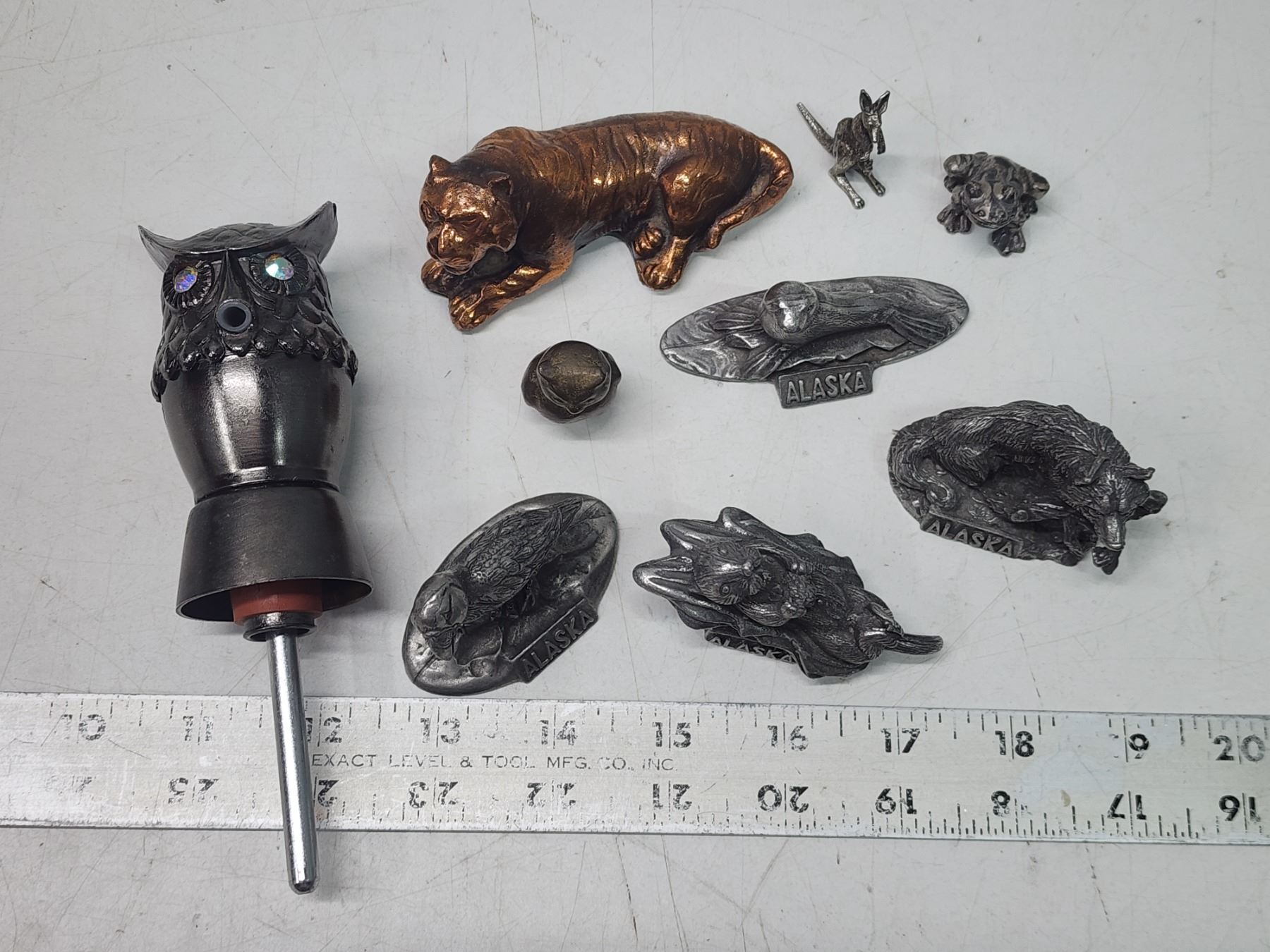 Assorted metal figures - Animals, owl head liquor pourer, etc.