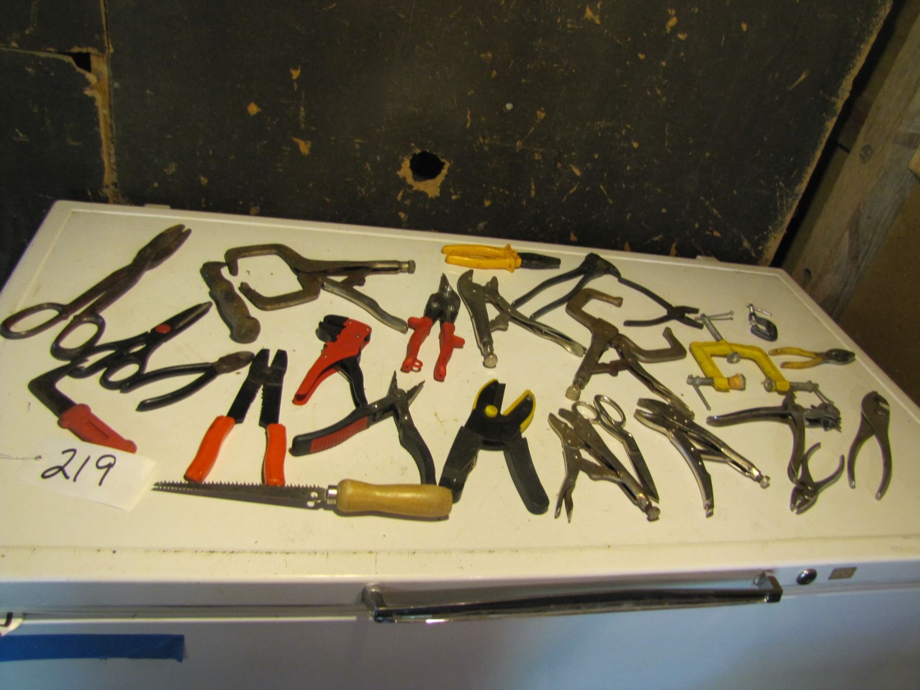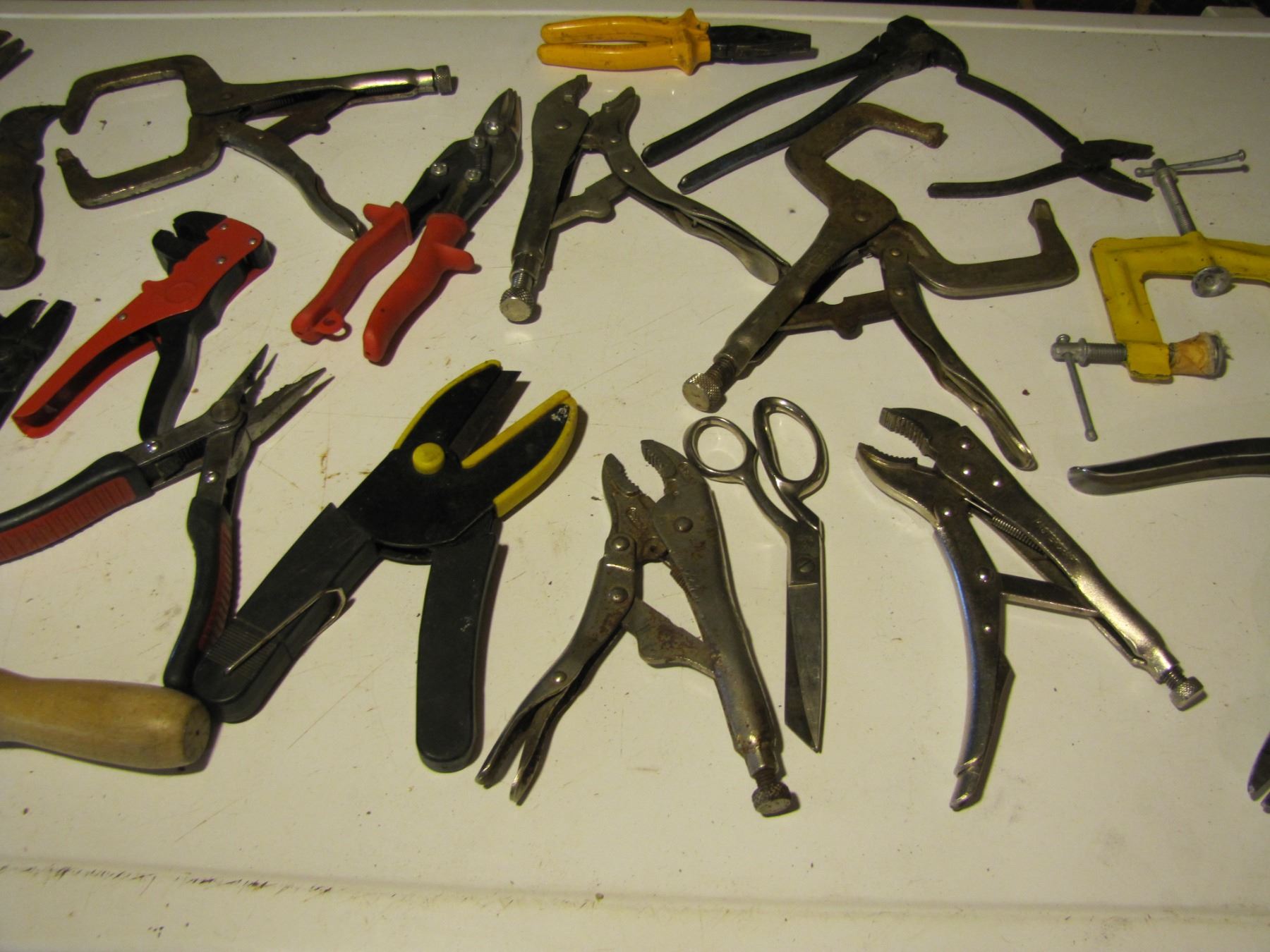 Assorted pliers , welding clamps, vice grips, scissors and tin snips