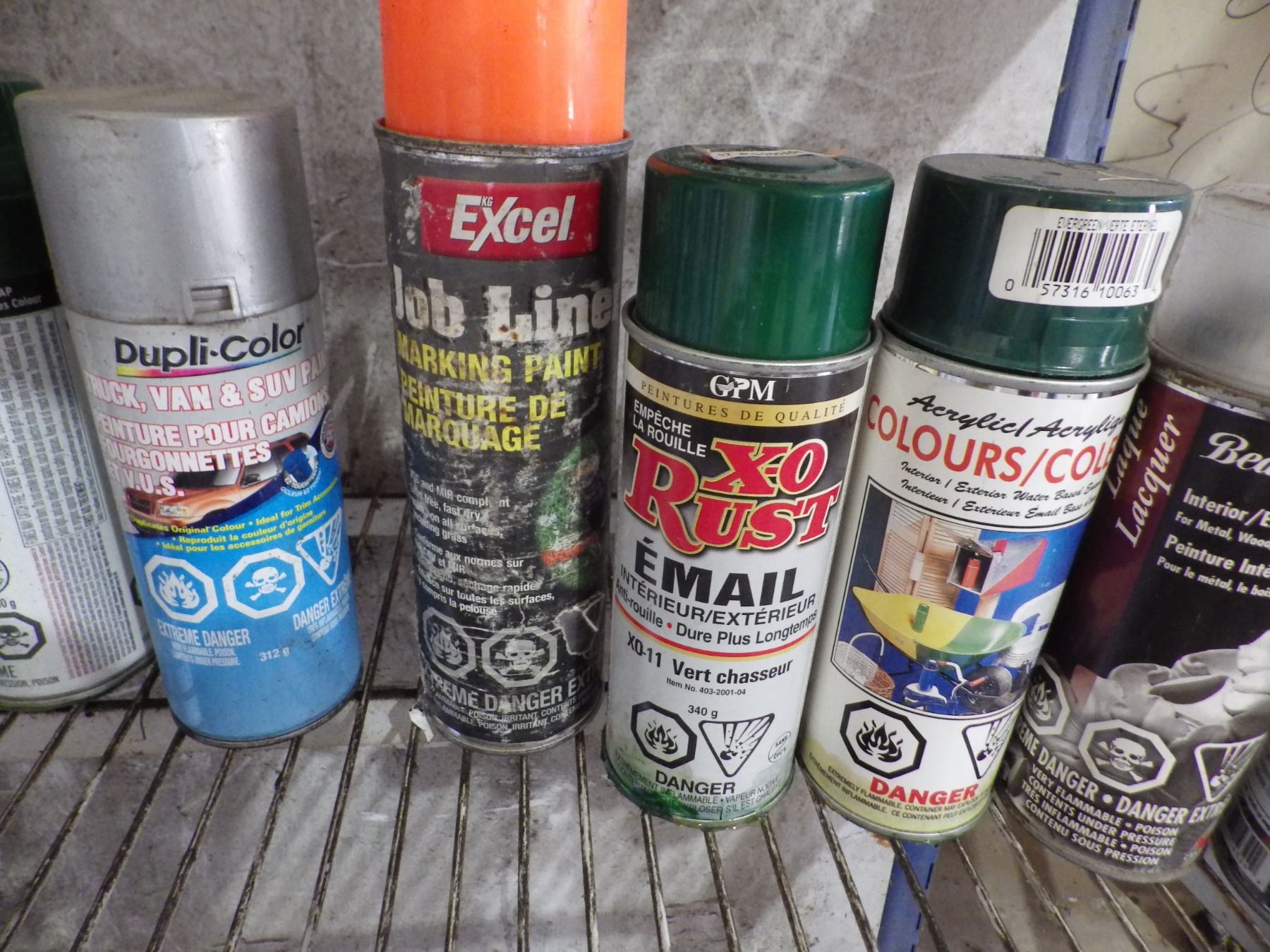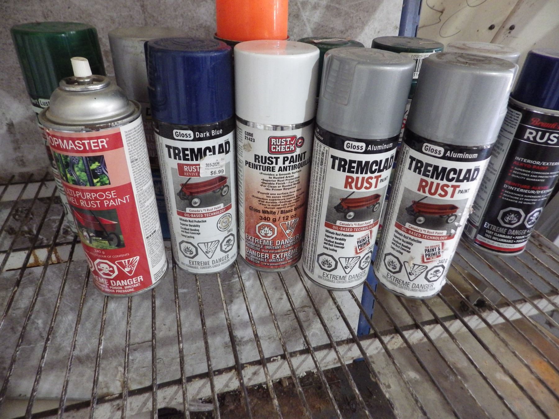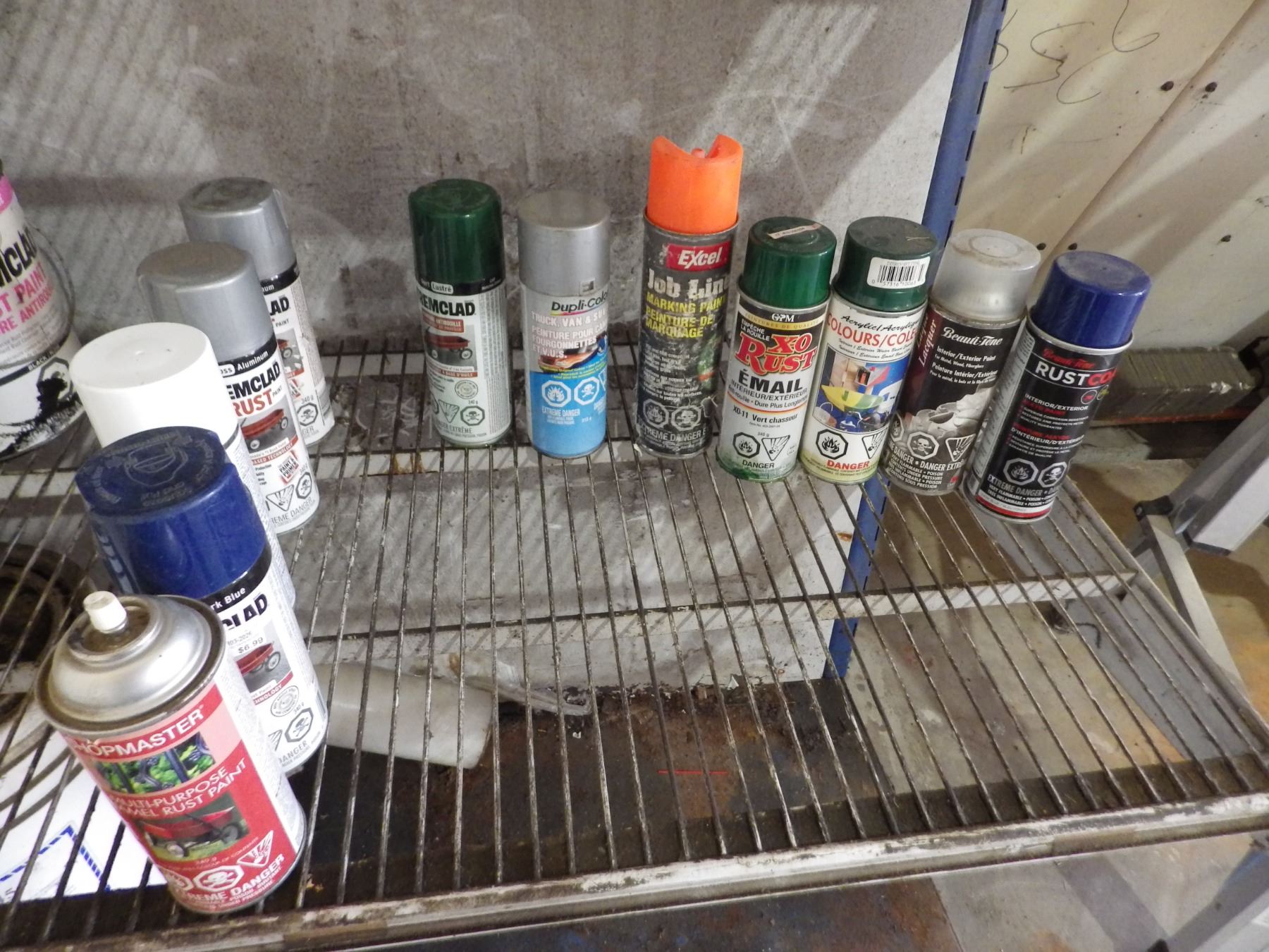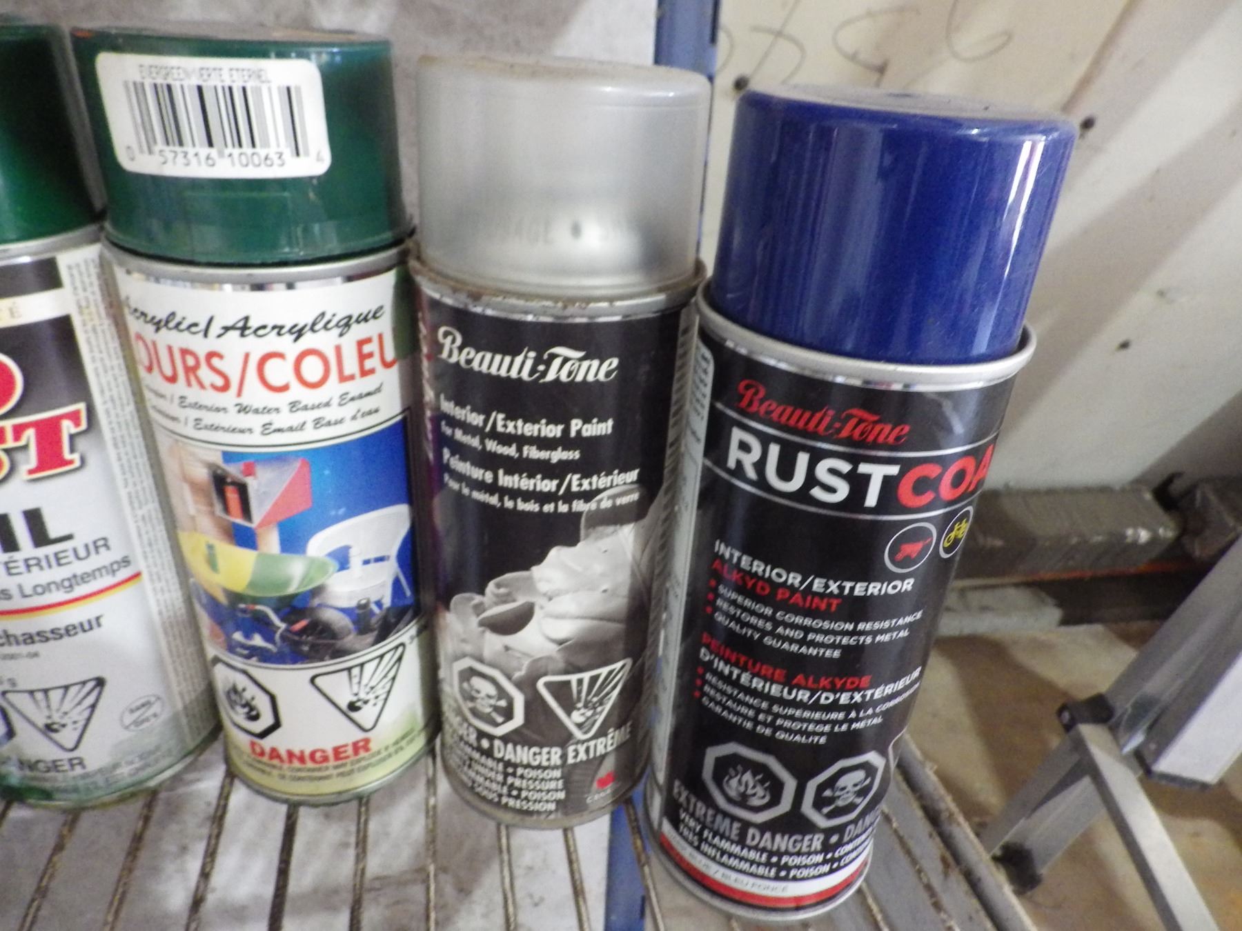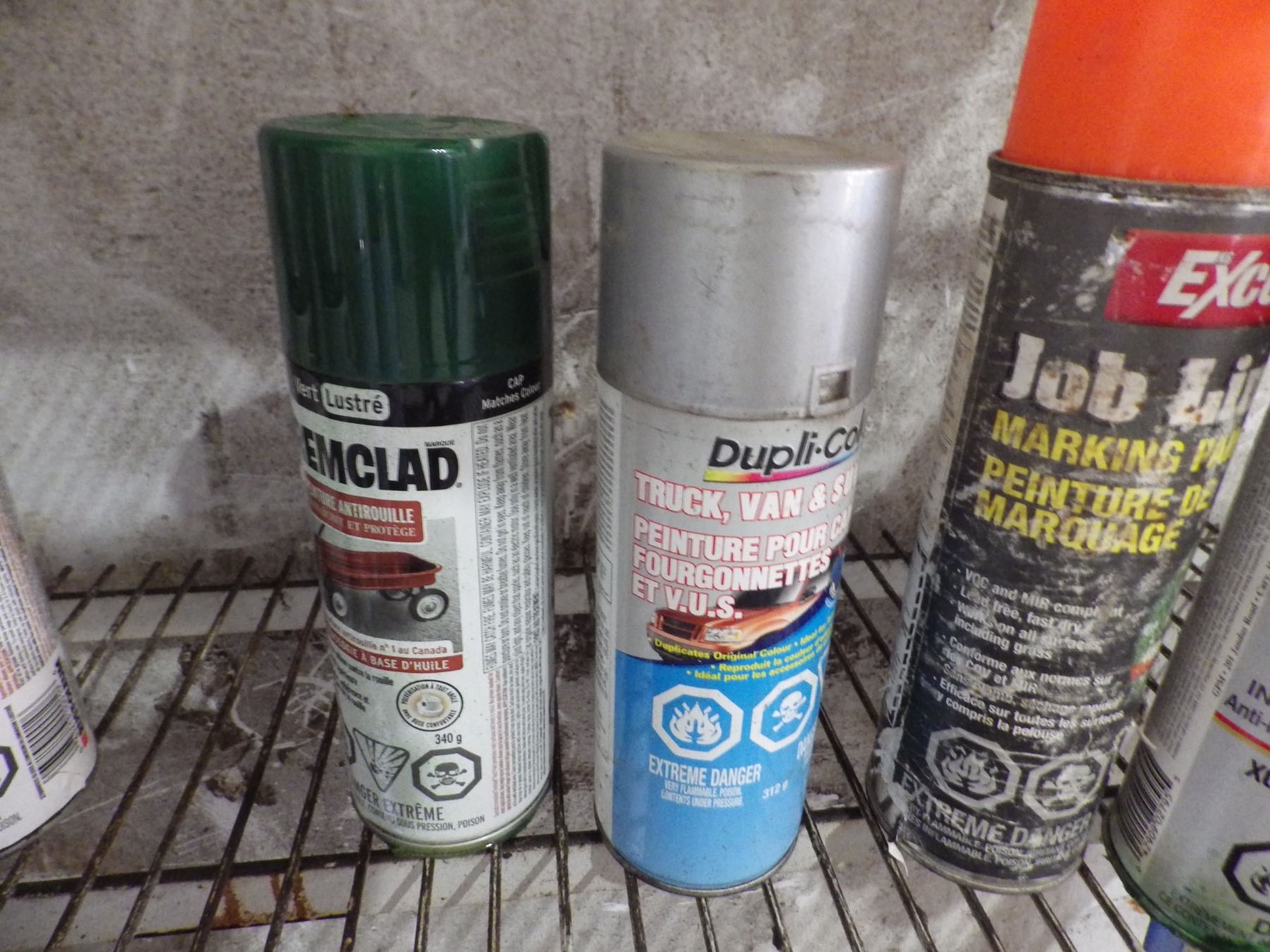 Assorted spray cans of paint et cetera.