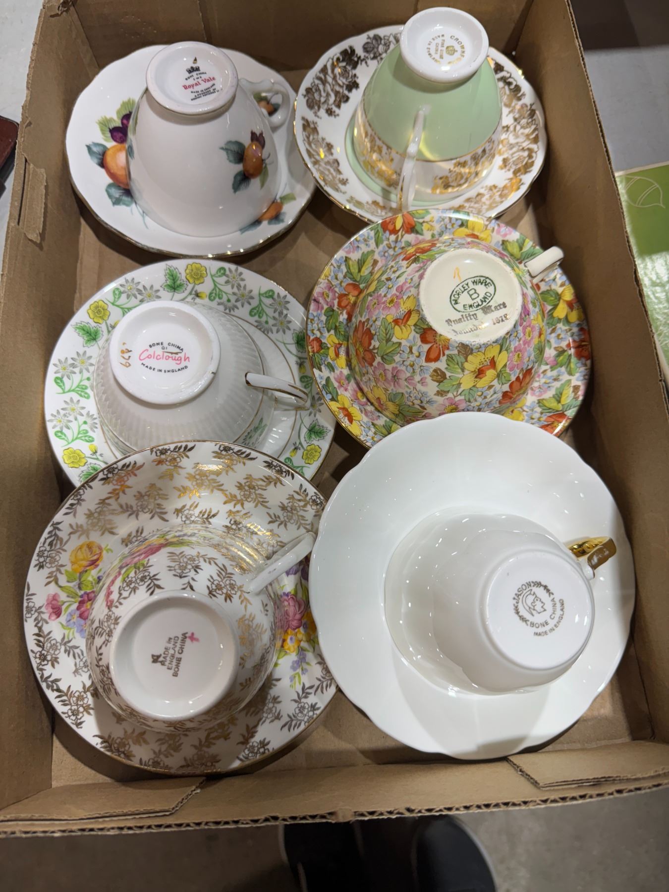Assorted tea, cups, and saucers