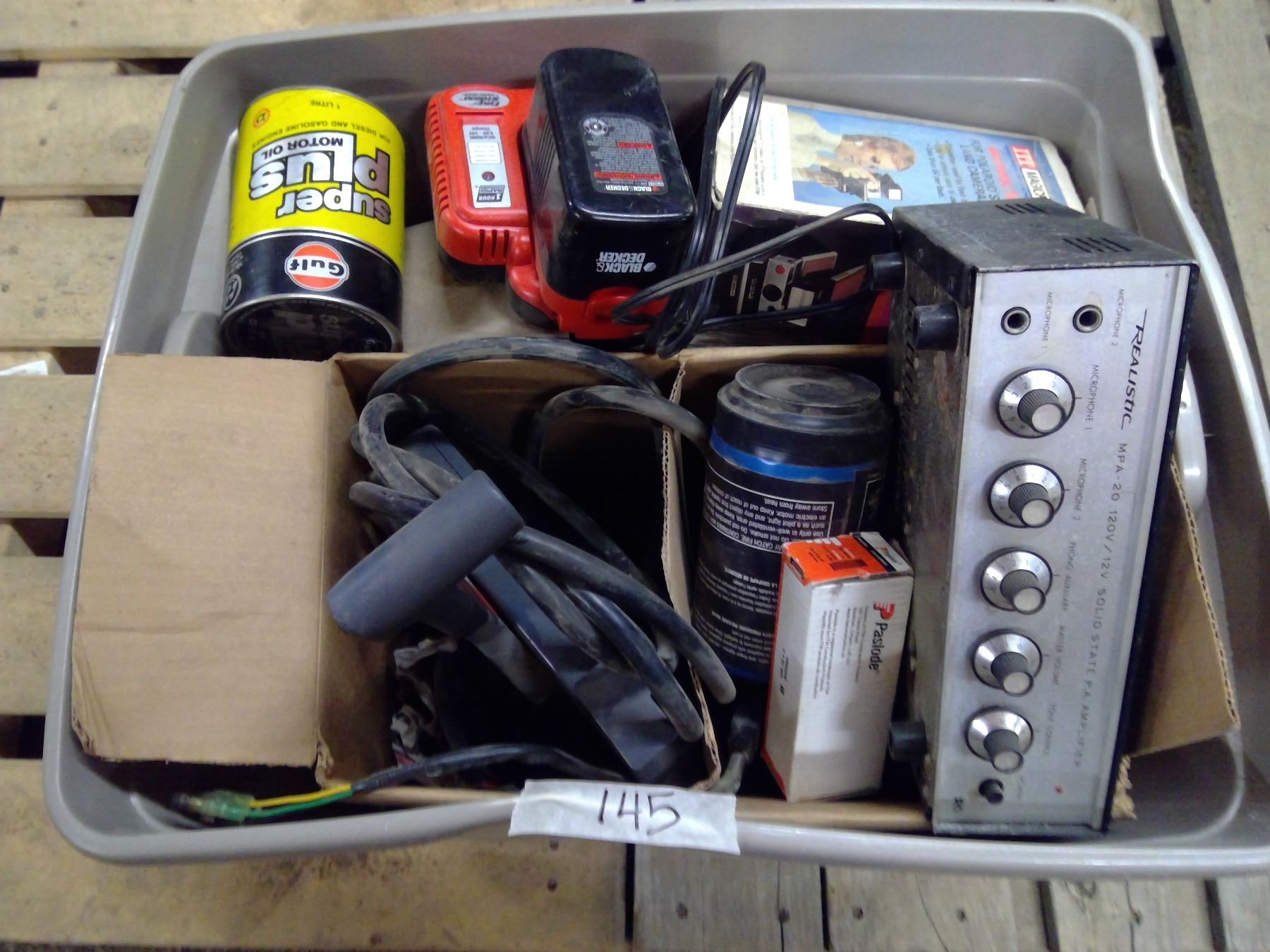 Assorted tote of amplifier, B&D charger, yamaha boat controls and misc.