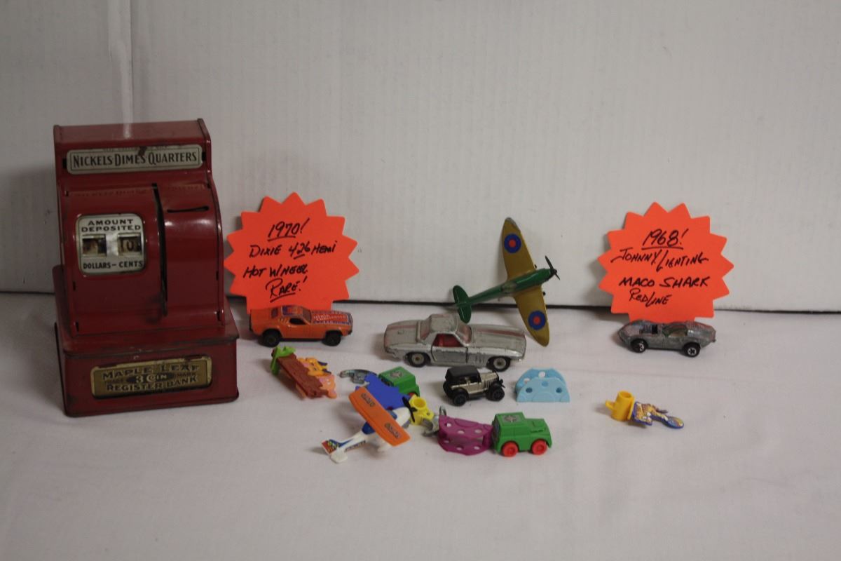 This is a small assortment of matchbox and hot wheels toys, as well as a toy cash register