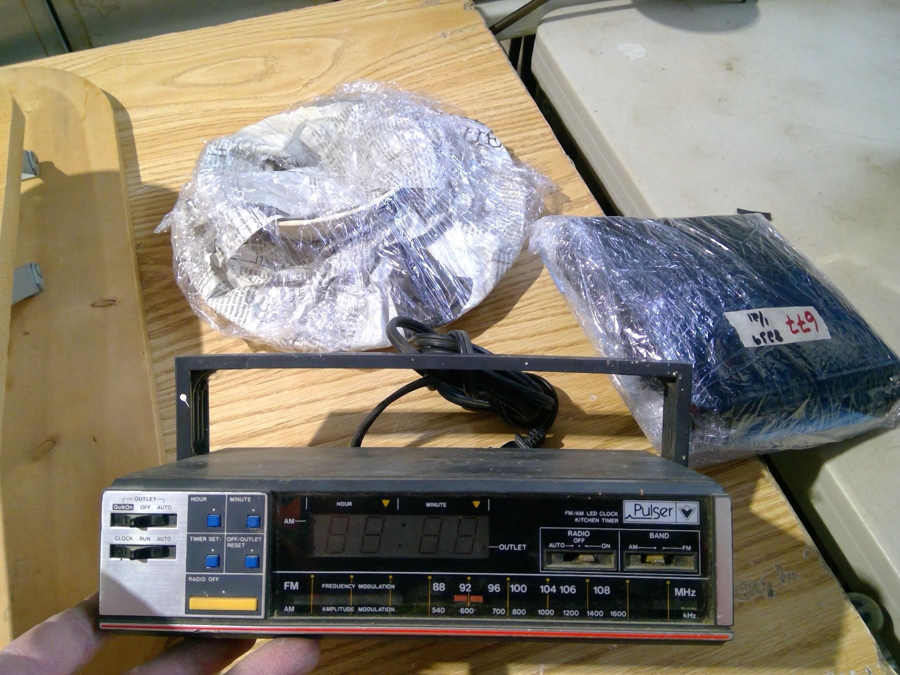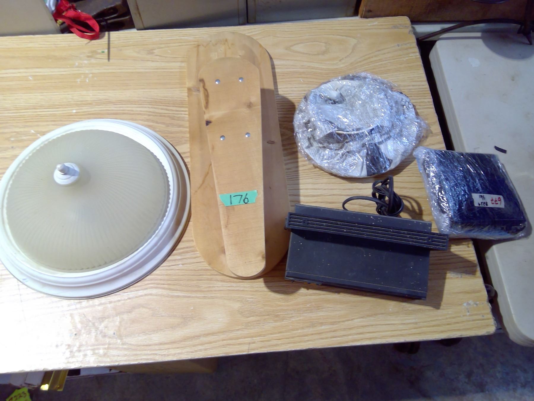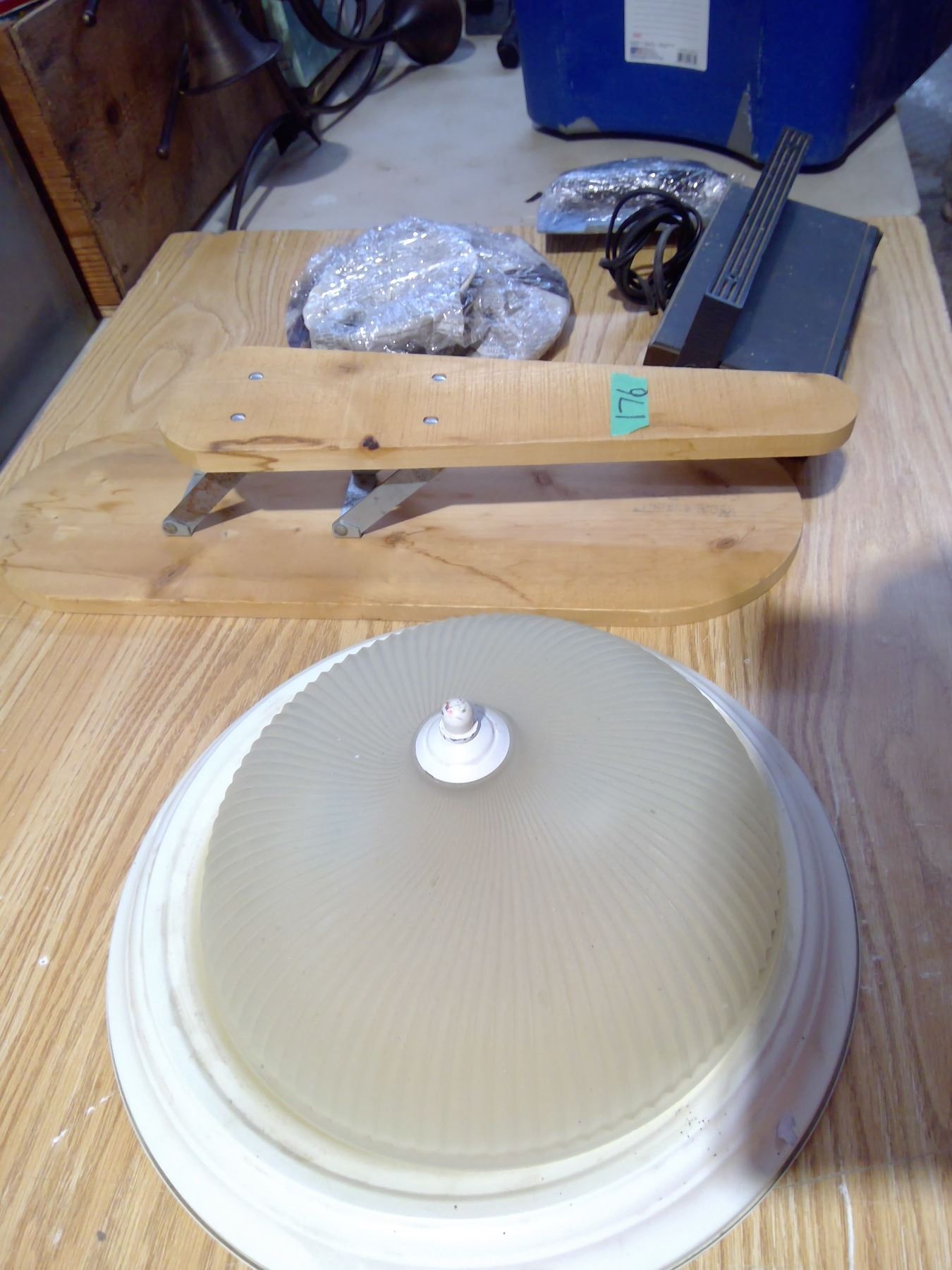 Assorted tub of undercounter radio, ceiling light, dishes, foot polisher rest ?