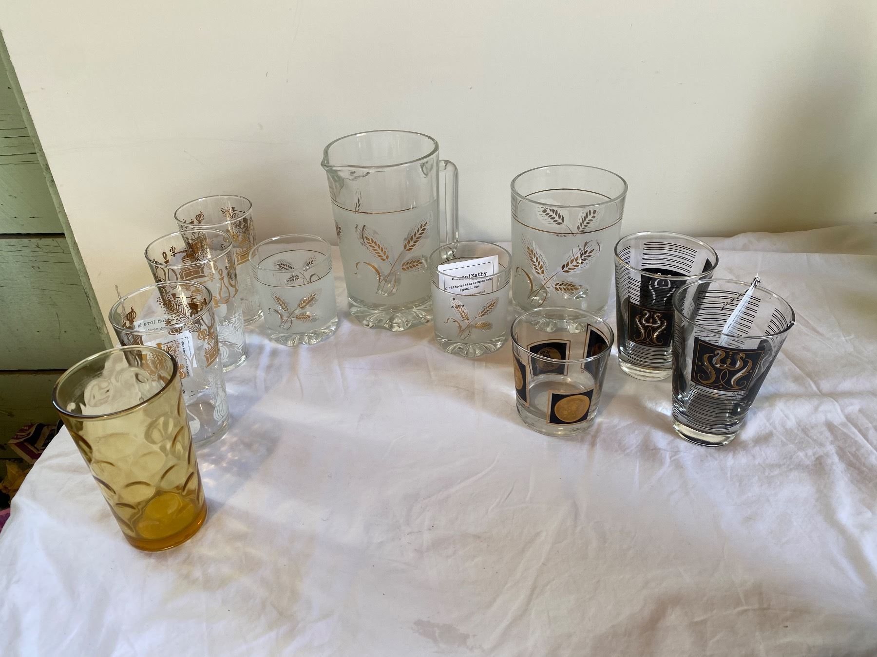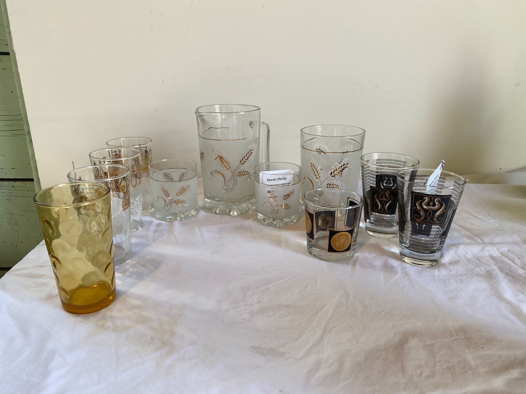 Assorted vintage glasses and pitcher and ice bucket