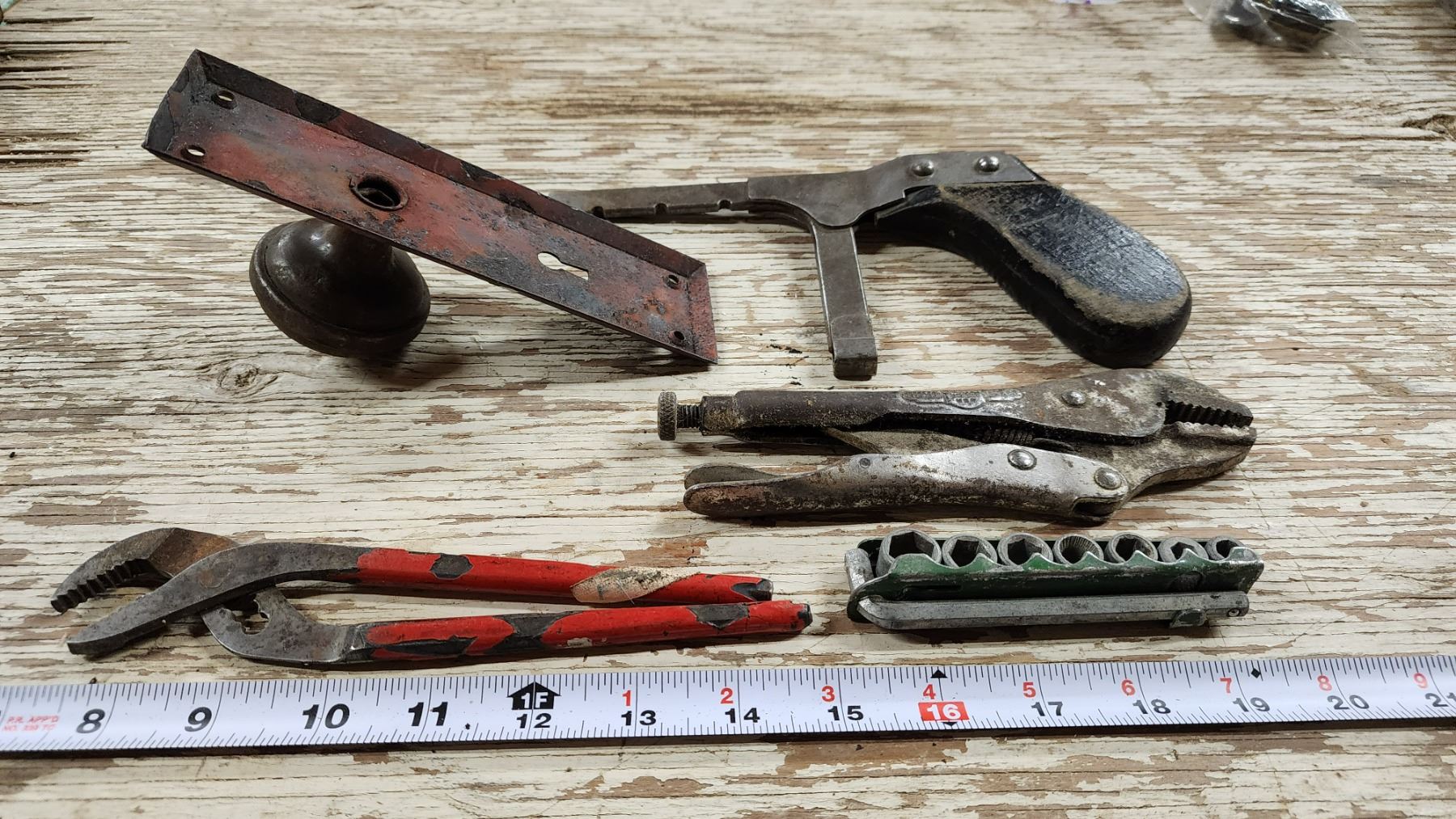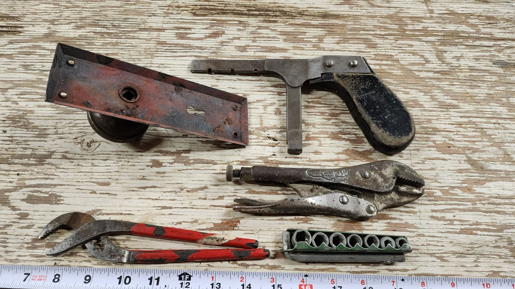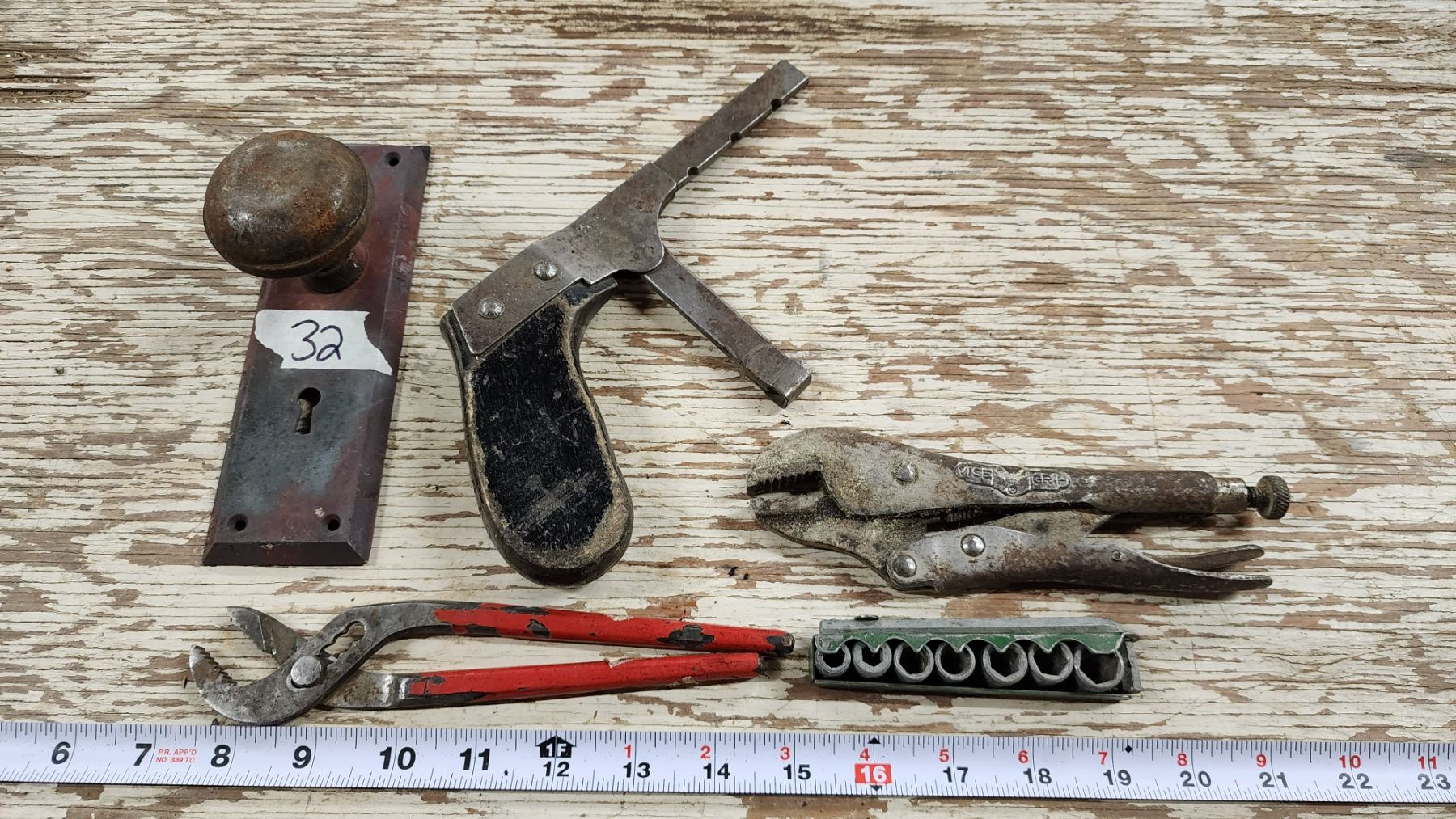 Assorted vintage items - Vice grip, small socket set, metal door knob, etc.