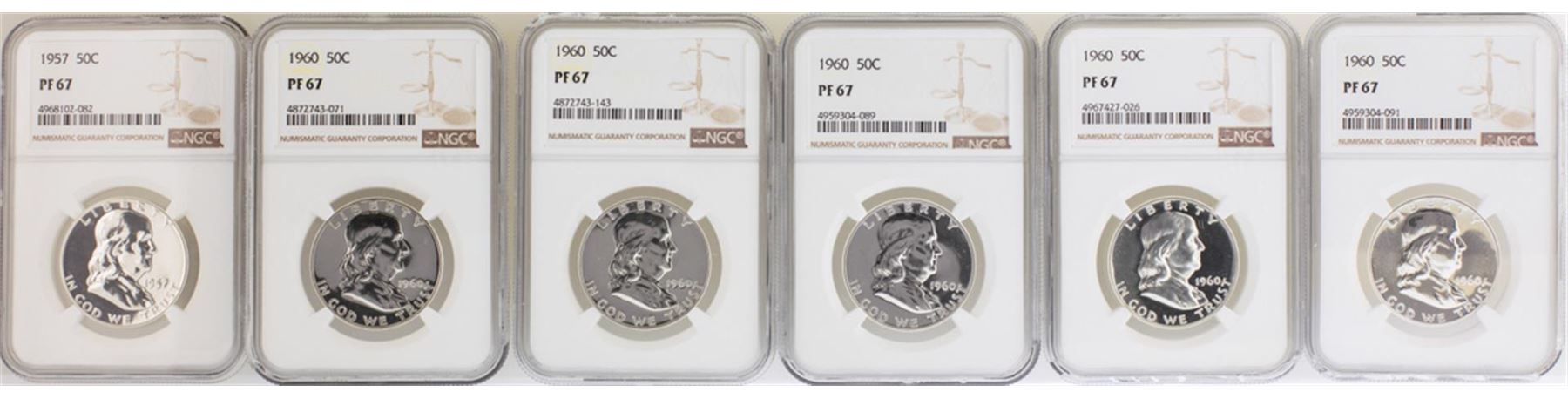 One Assortment of (6) Cracked Slabs Proof Franklin Coins NGC PF67. NGC Certified.