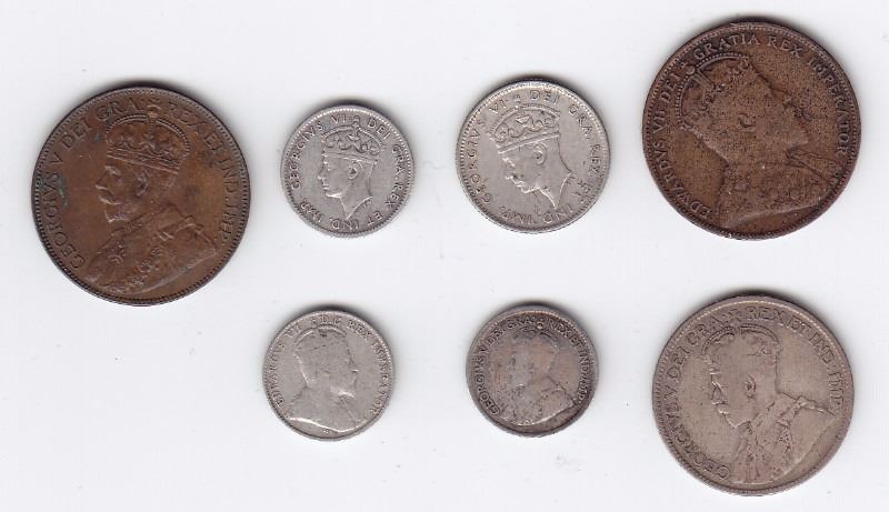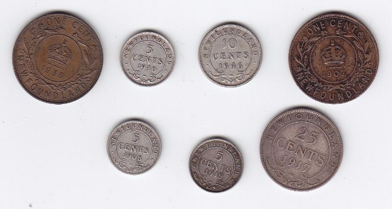 Assortment of 7 Newfoundland Coinage 1907 (F) e1936(XF) Large Cents, 1908 (G), 1919 (F+) 1940 (EF+) Silver 5 cents 1946 (VF+) Silver 10 cents, 1917 (VG) 25-cent