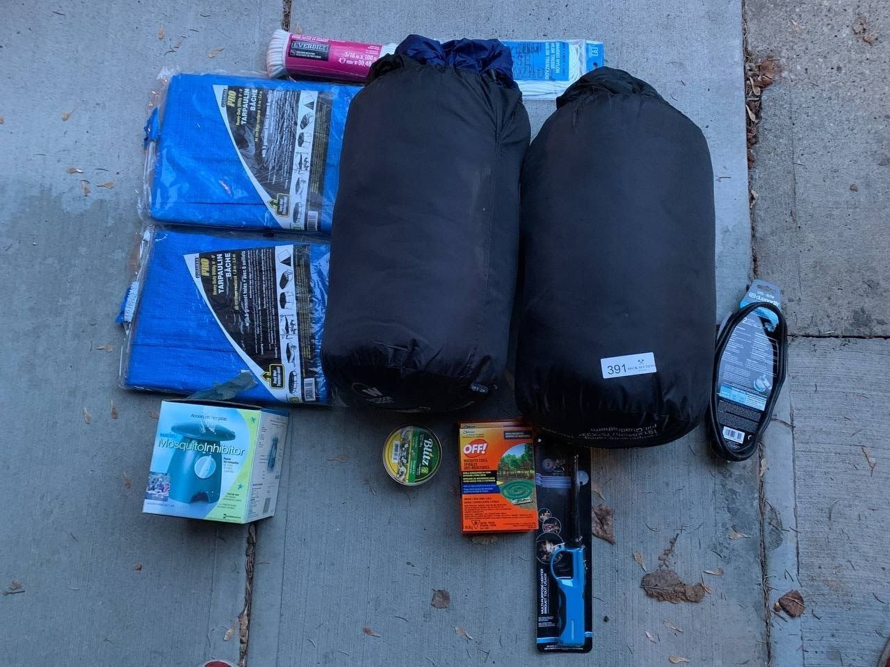 Assortment of Camping Gear - Sleeping Bags, Tarps, Mosquito Coils, and More!