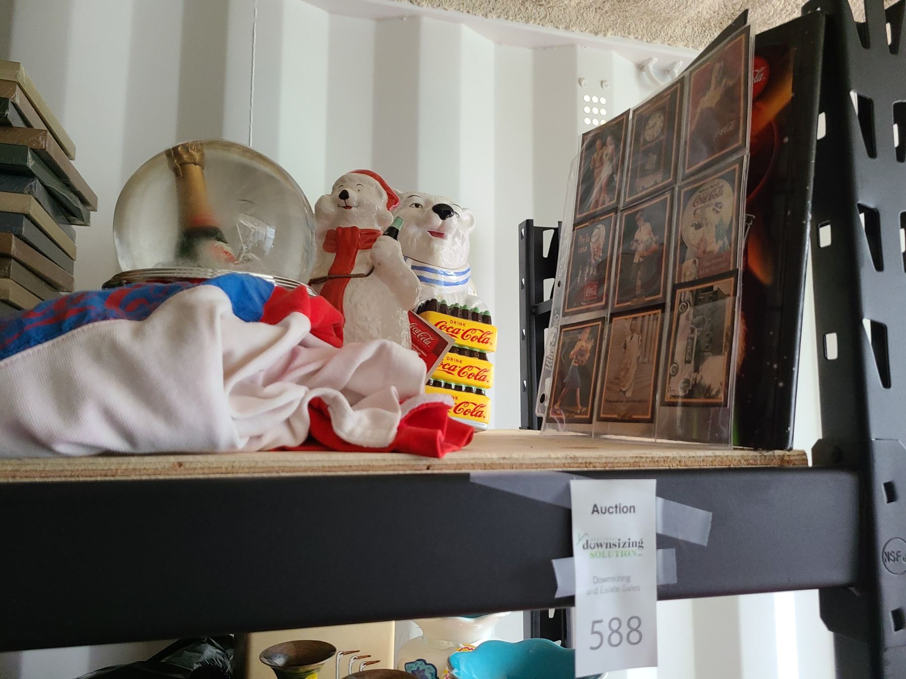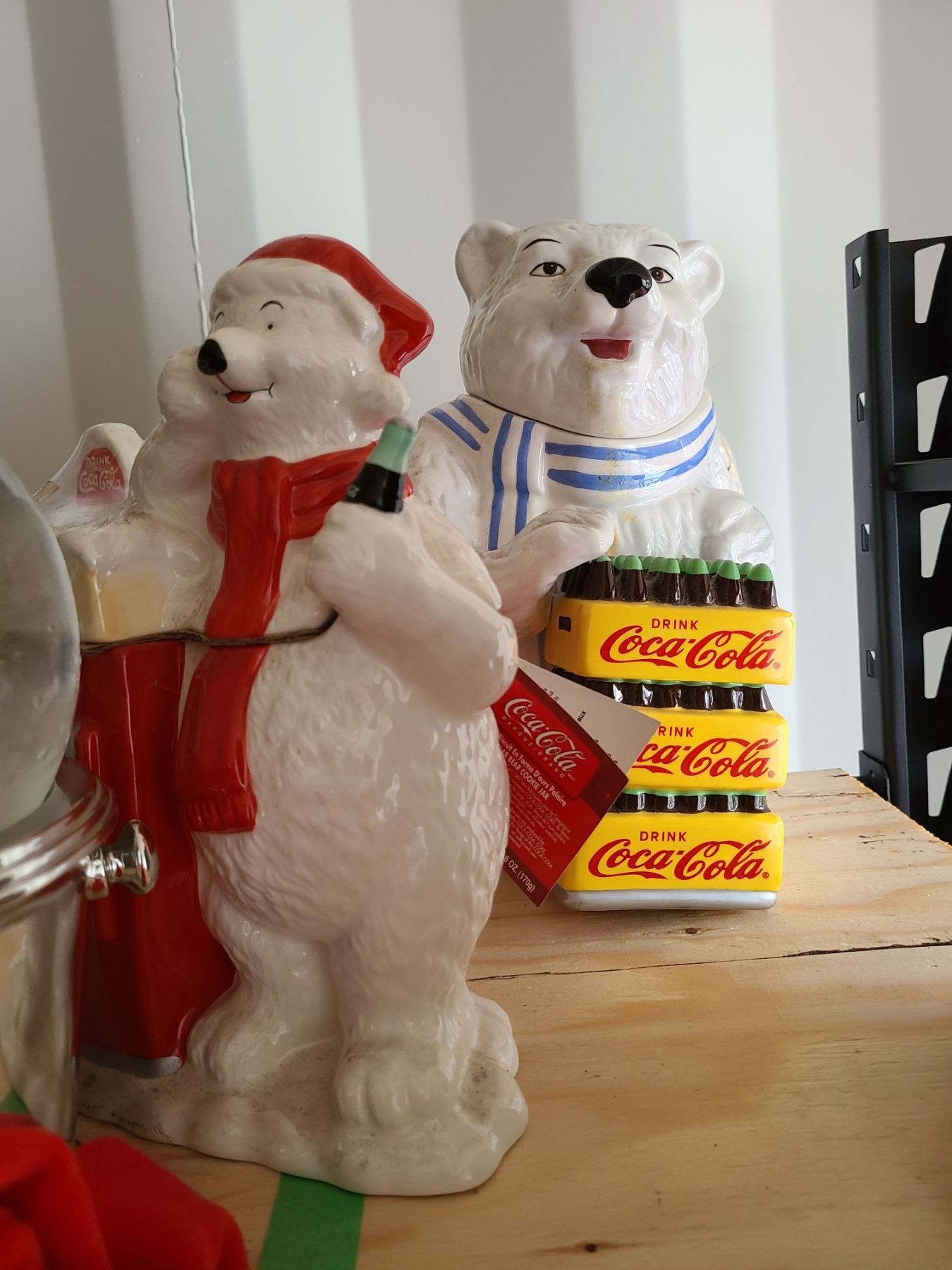 Size small Coca Cola rugby shirt, childs, Polar Bear Cookie Barrel, large polar bear pushing flats of coke bottles cookie barrel, sheet of Coca Colar trading cards. Bring packing material pickup at 9 am
