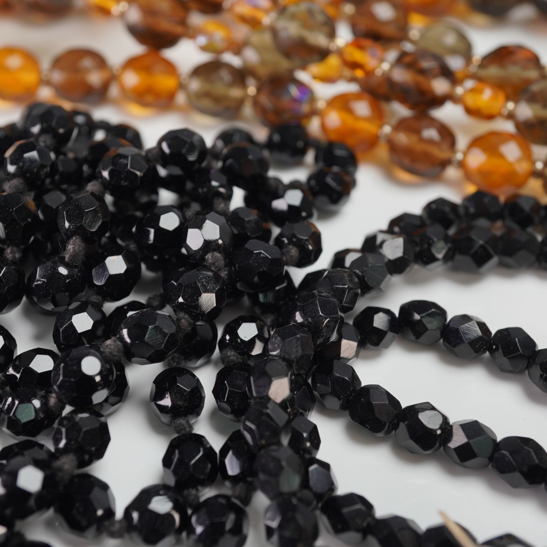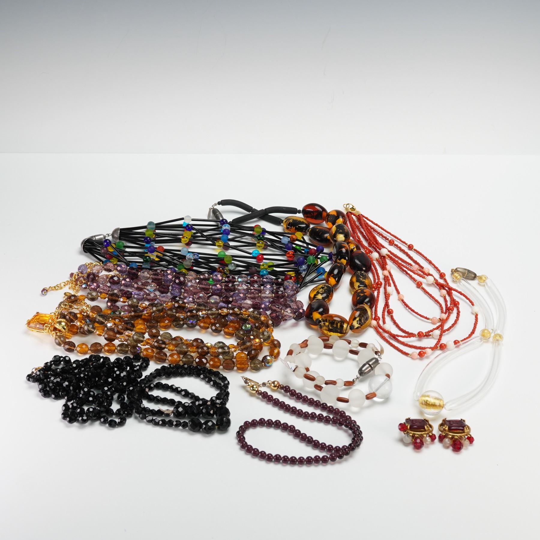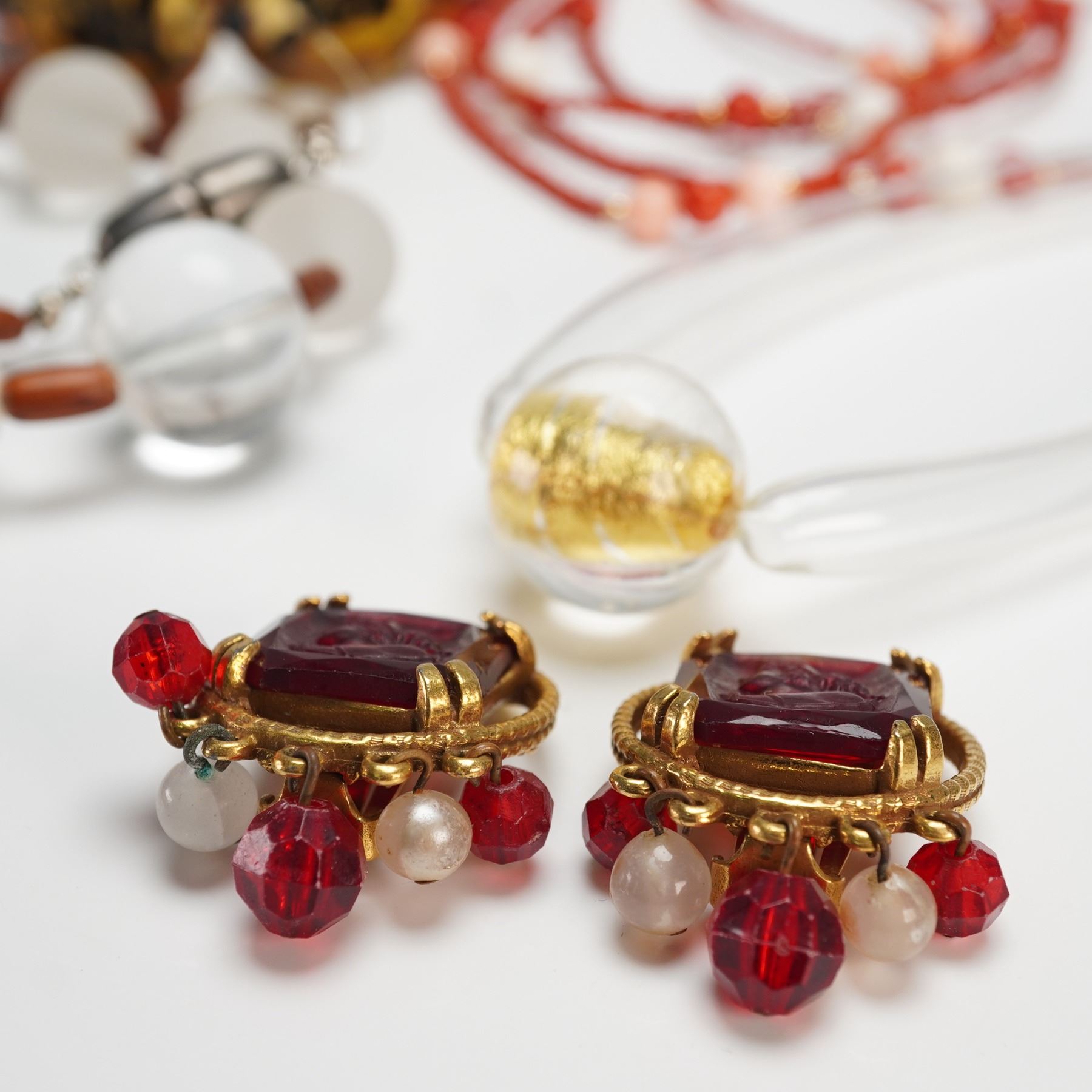 Colorful collection of vintage and modern costume jewelry, including multiple beaded necklaces in a variety of styles and materials such as glass, resin, and acrylic. The grouping features faceted and smooth beads in tones of amber, amethyst, black, and clear frosted glass, alongside a statement pair of goldtone intaglio earrings with deep red glass centers and dangling bead accents. An eye-catching and eclectic mix ideal for display or wear.