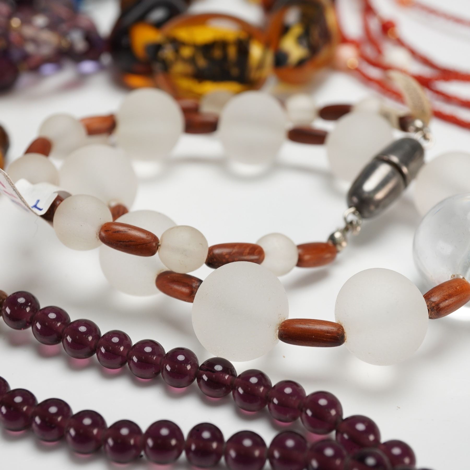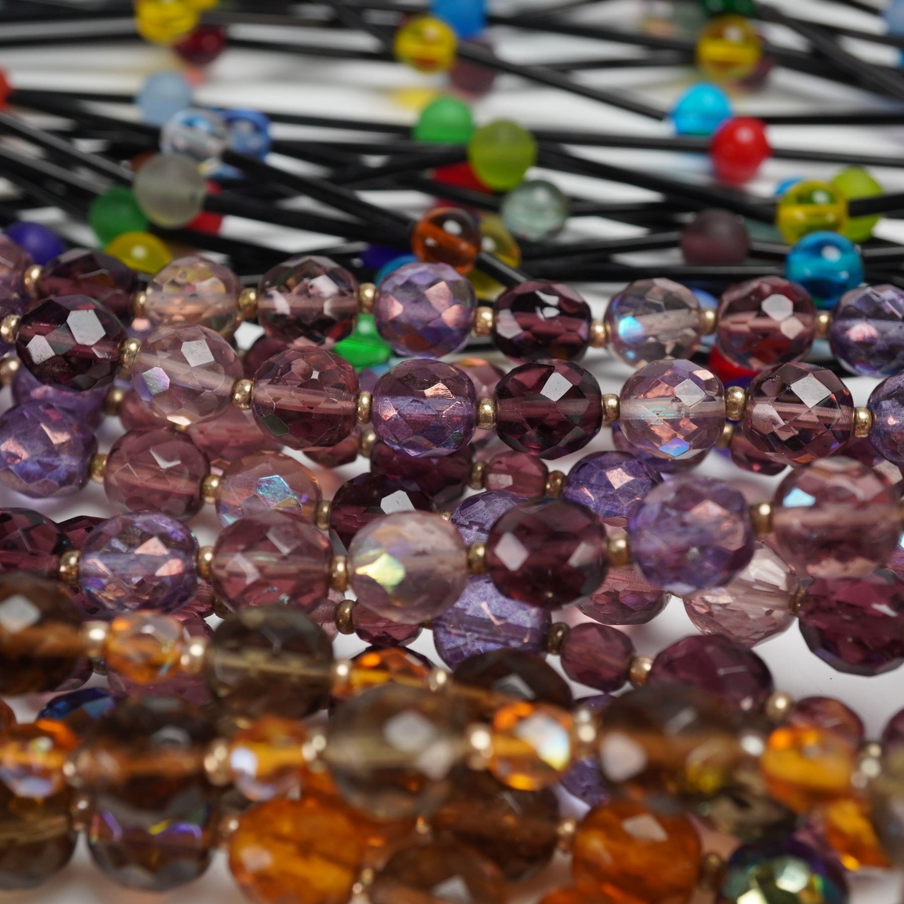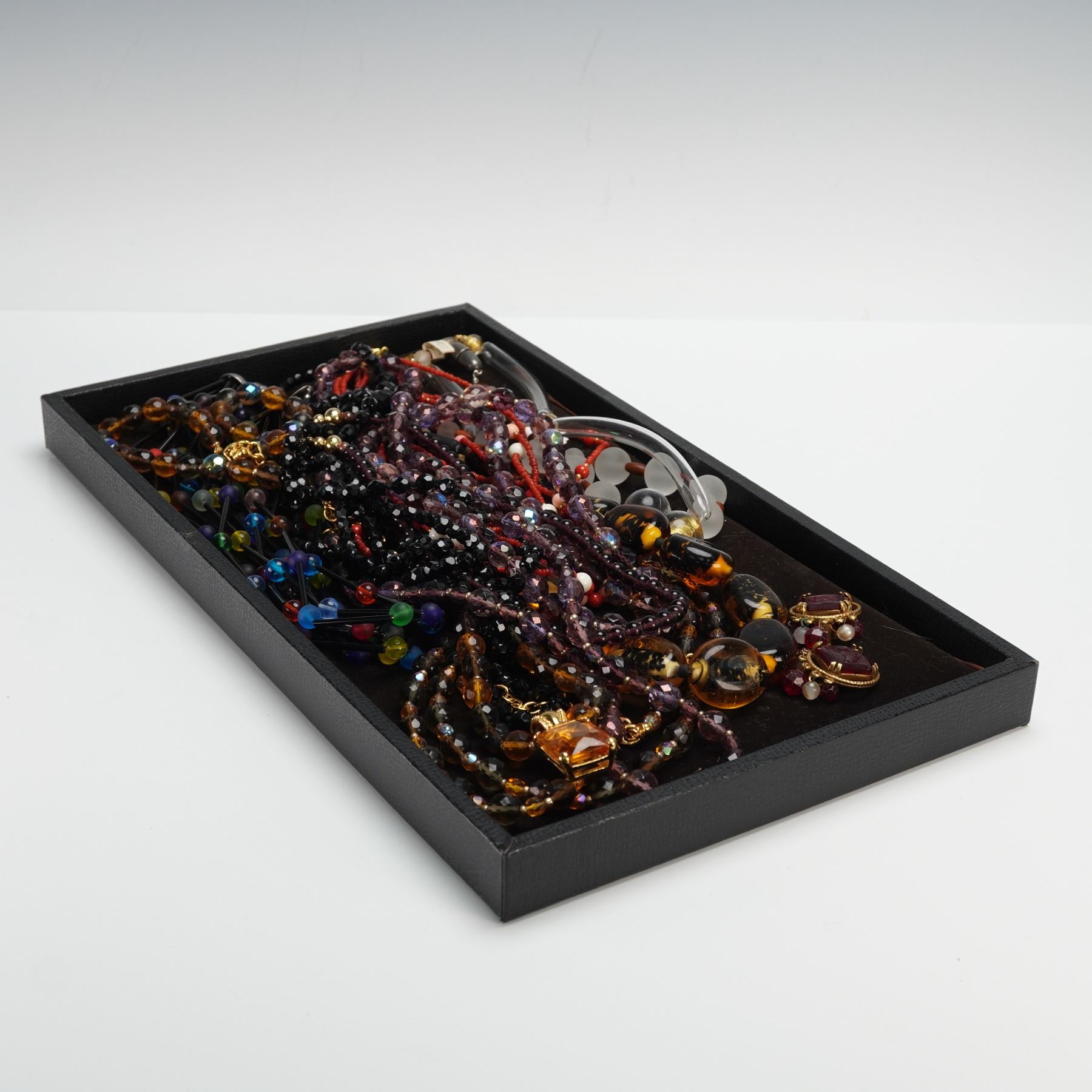 Colorful collection of vintage and modern costume jewelry, including multiple beaded necklaces in a variety of styles and materials such as glass, resin, and acrylic. The grouping features faceted and smooth beads in tones of amber, amethyst, black, and clear frosted glass, alongside a statement pair of goldtone intaglio earrings with deep red glass centers and dangling bead accents. An eye-catching and eclectic mix ideal for display or wear.