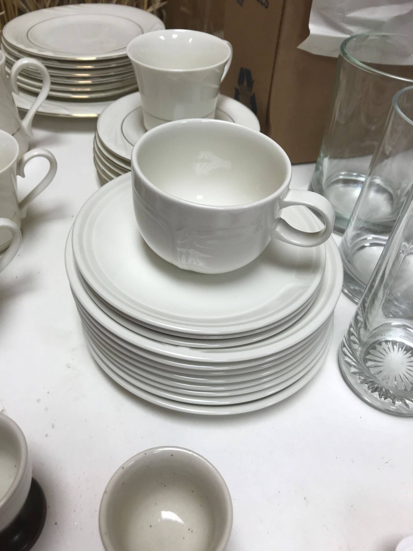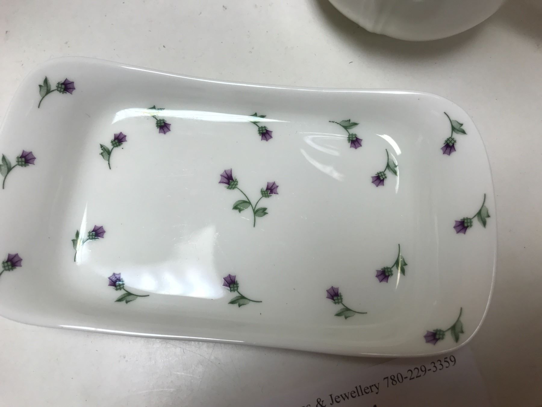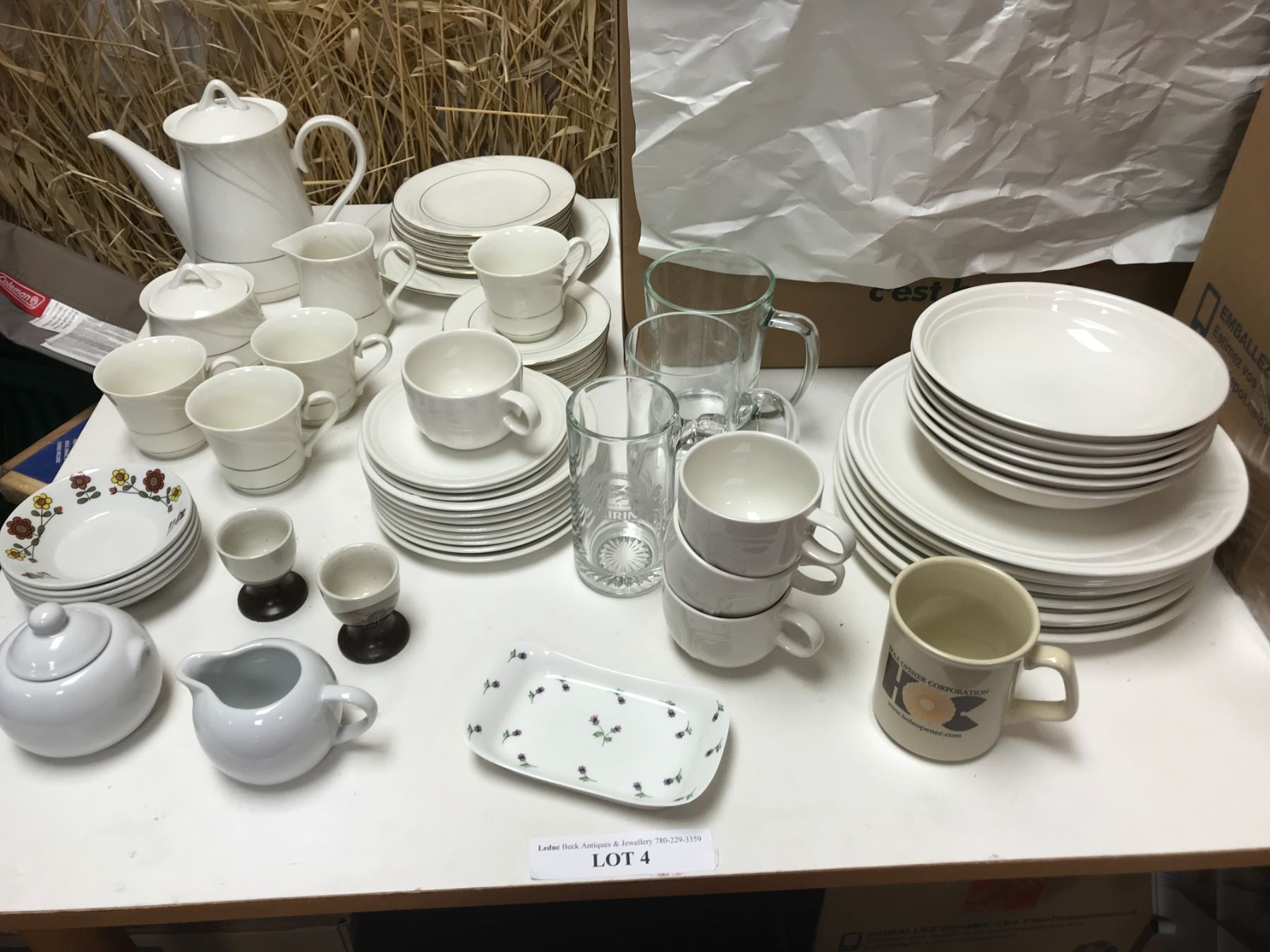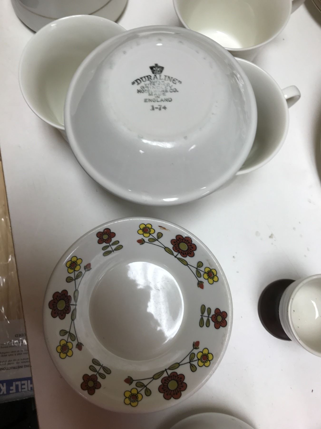 Assortment of Dishes, Bone China Plate from Scotland, Highe Grand Ceramic Tea-set, Johnson Brothers Focus Kitchen Dishes, Egg Cups, Duraline Floral Bowls from England