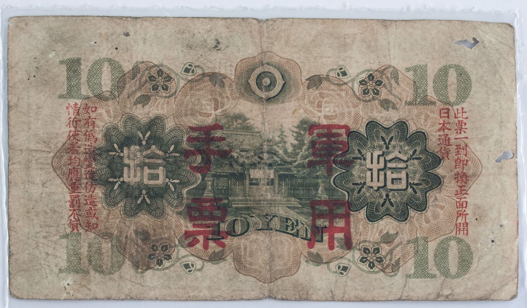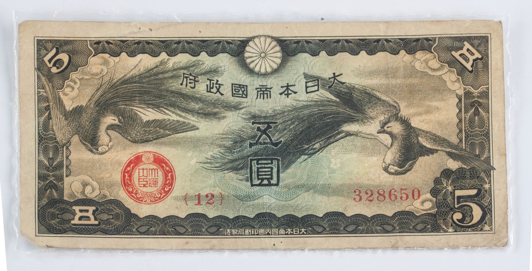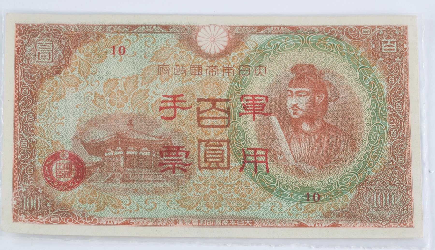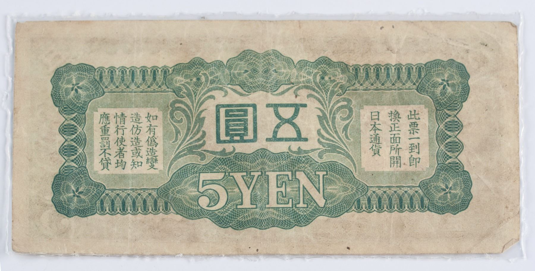 Assortment of five (5) Japanese banknotes; Japanese military yen during World War II; of 1 piece of 5 Yen, 2 pieces of 10 Yen, 1 piece of 50 Yen, 1 piece of 100 Yen; 5.5 cm x 11.5 cm - 8.5 cm x 16.5 cm