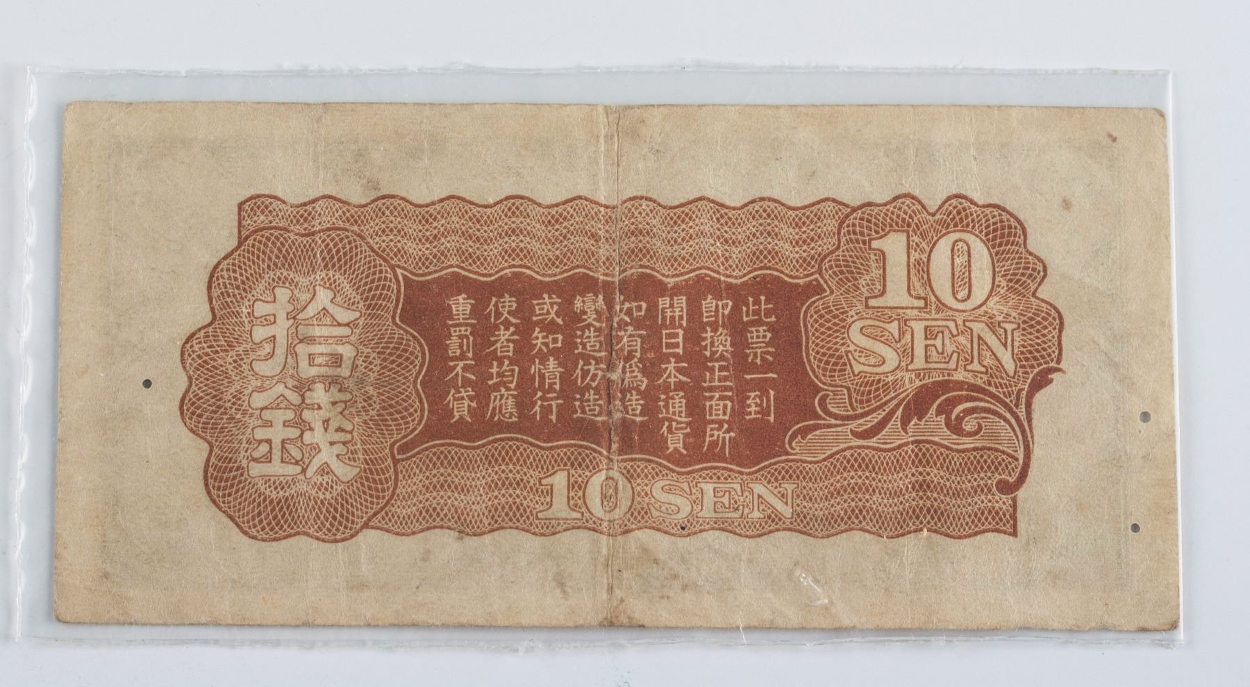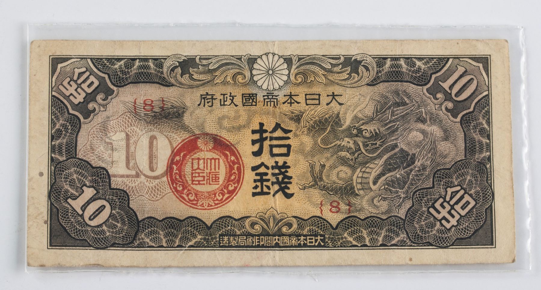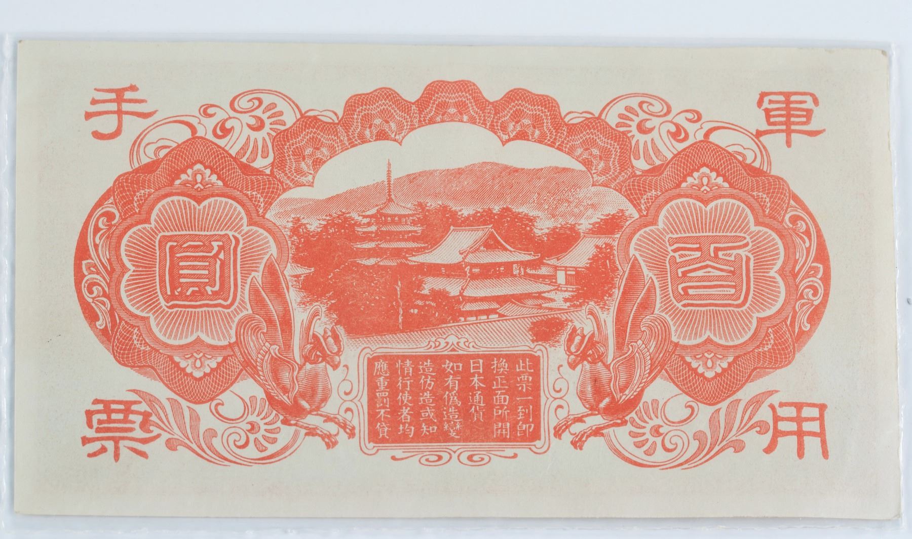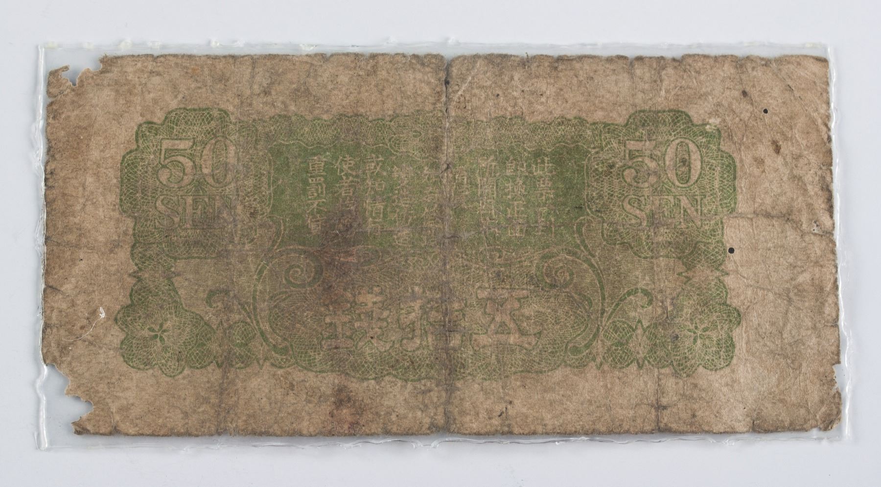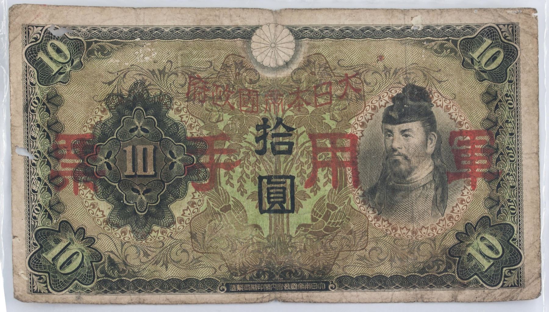 Assortment of five (5) Japanese banknotes; Japanese military yen during World War II; of 1 piece of 5 Yen, 2 pieces of 10 Yen, 1 piece of 50 Yen, 1 piece of 100 Yen; 5.5 cm x 11.5 cm - 8.5 cm x 16.5 cm
