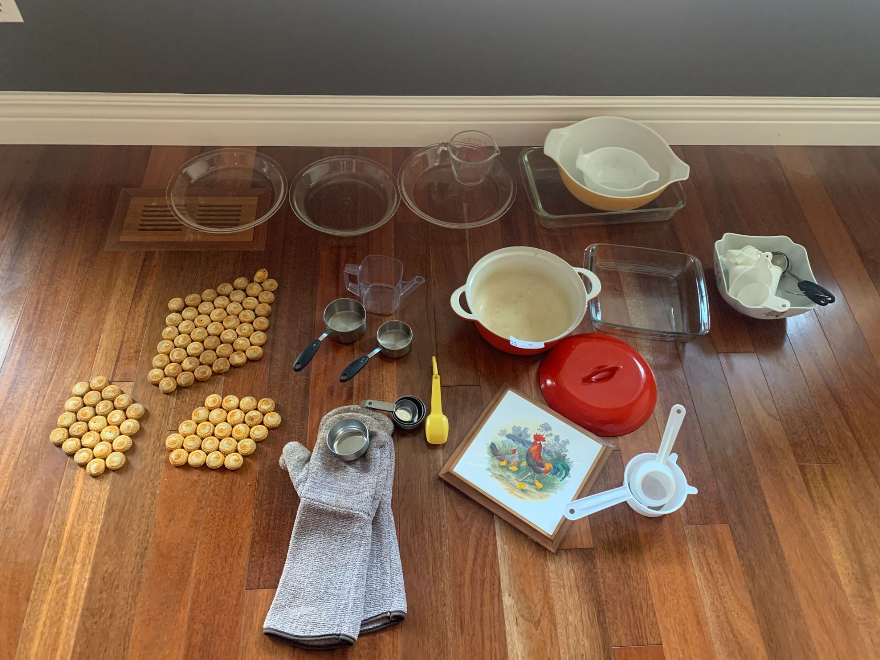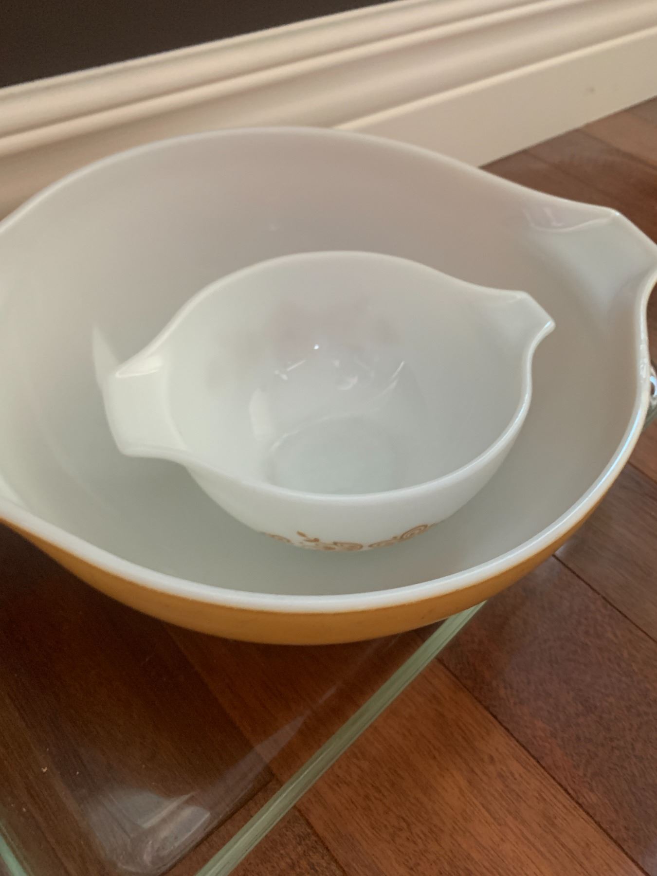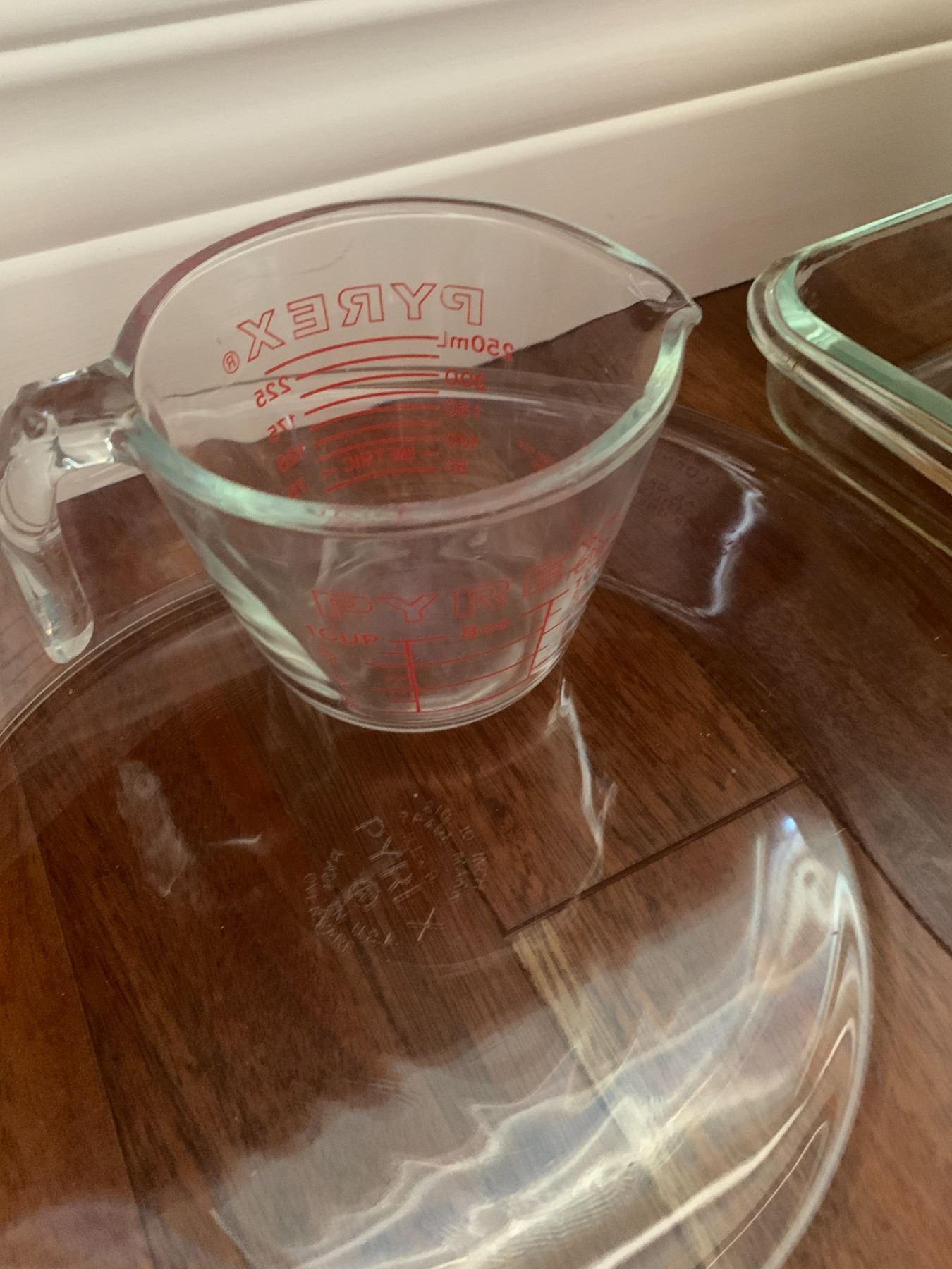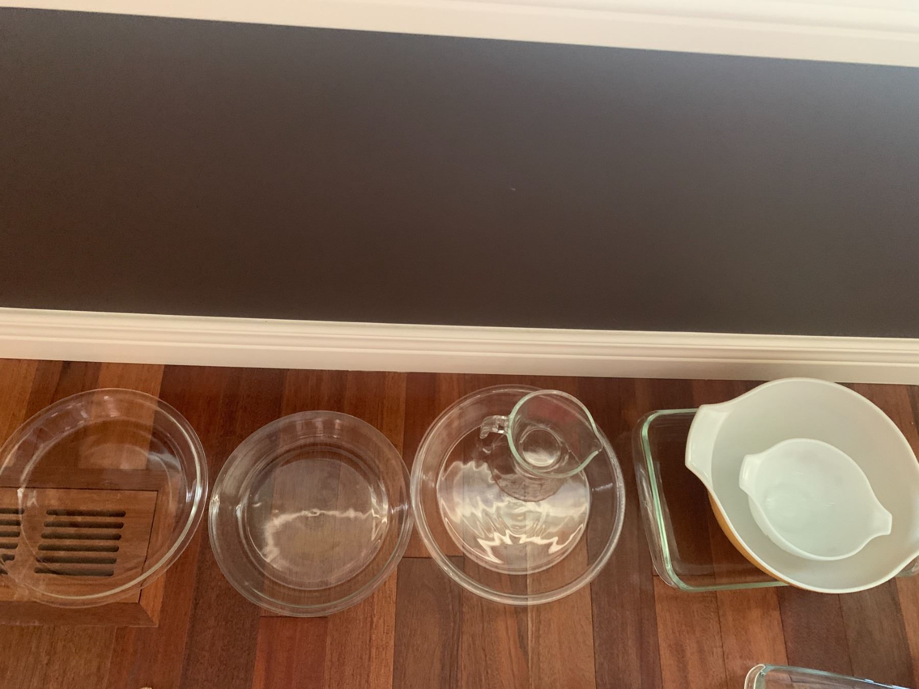 Everything in the far back row is Pyrex (3 round baking dishes, 1 long baking dish, measuring cup, and 2 x bowls)