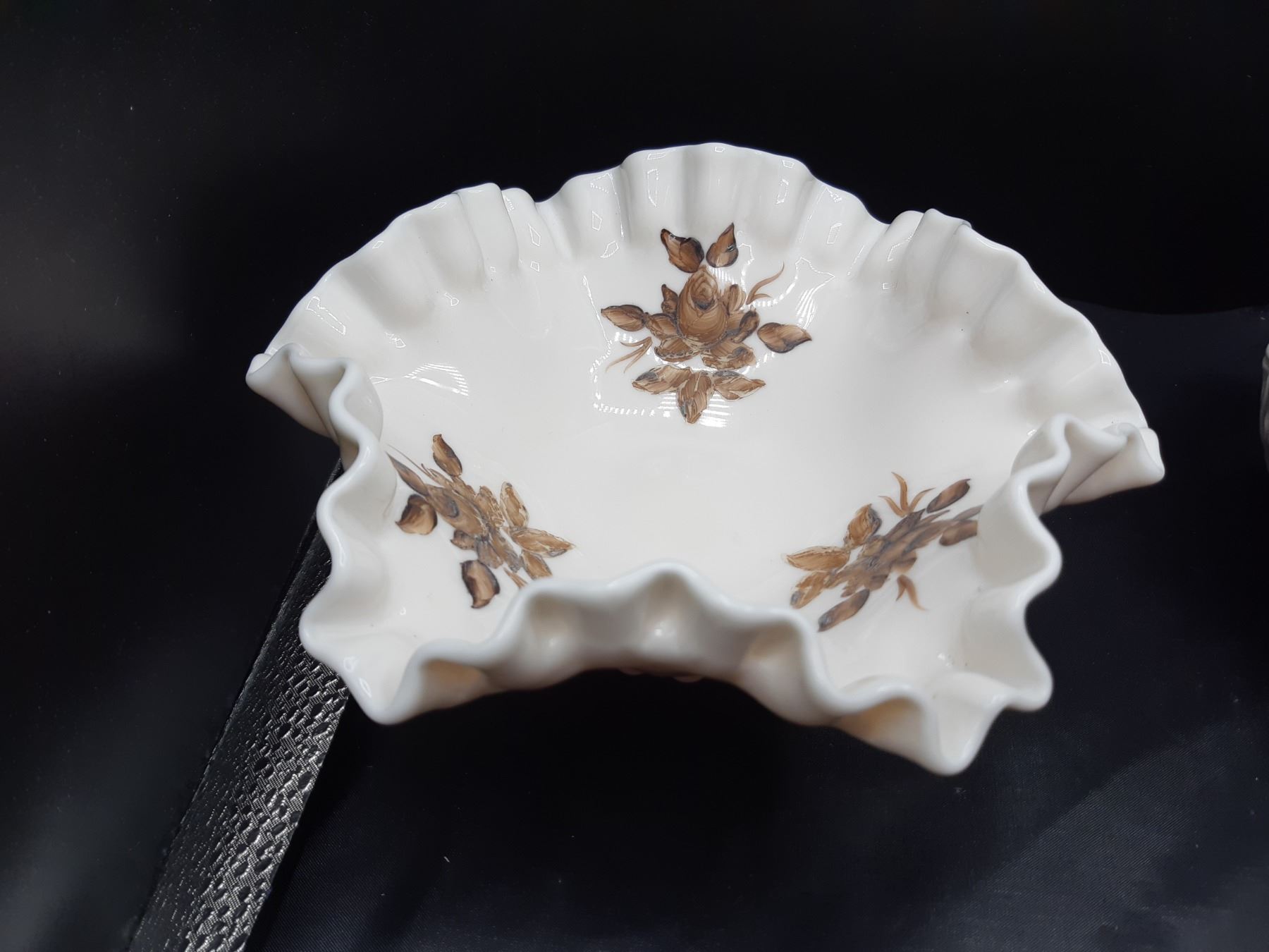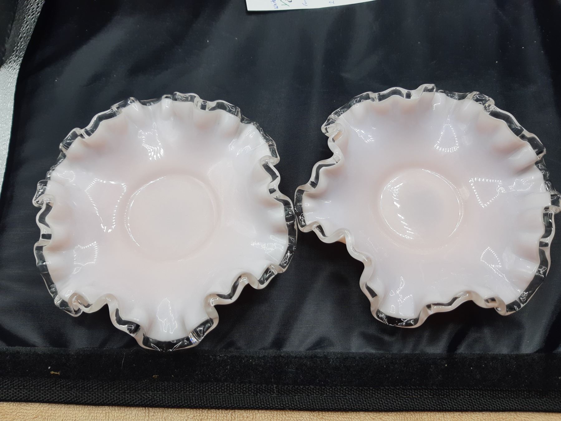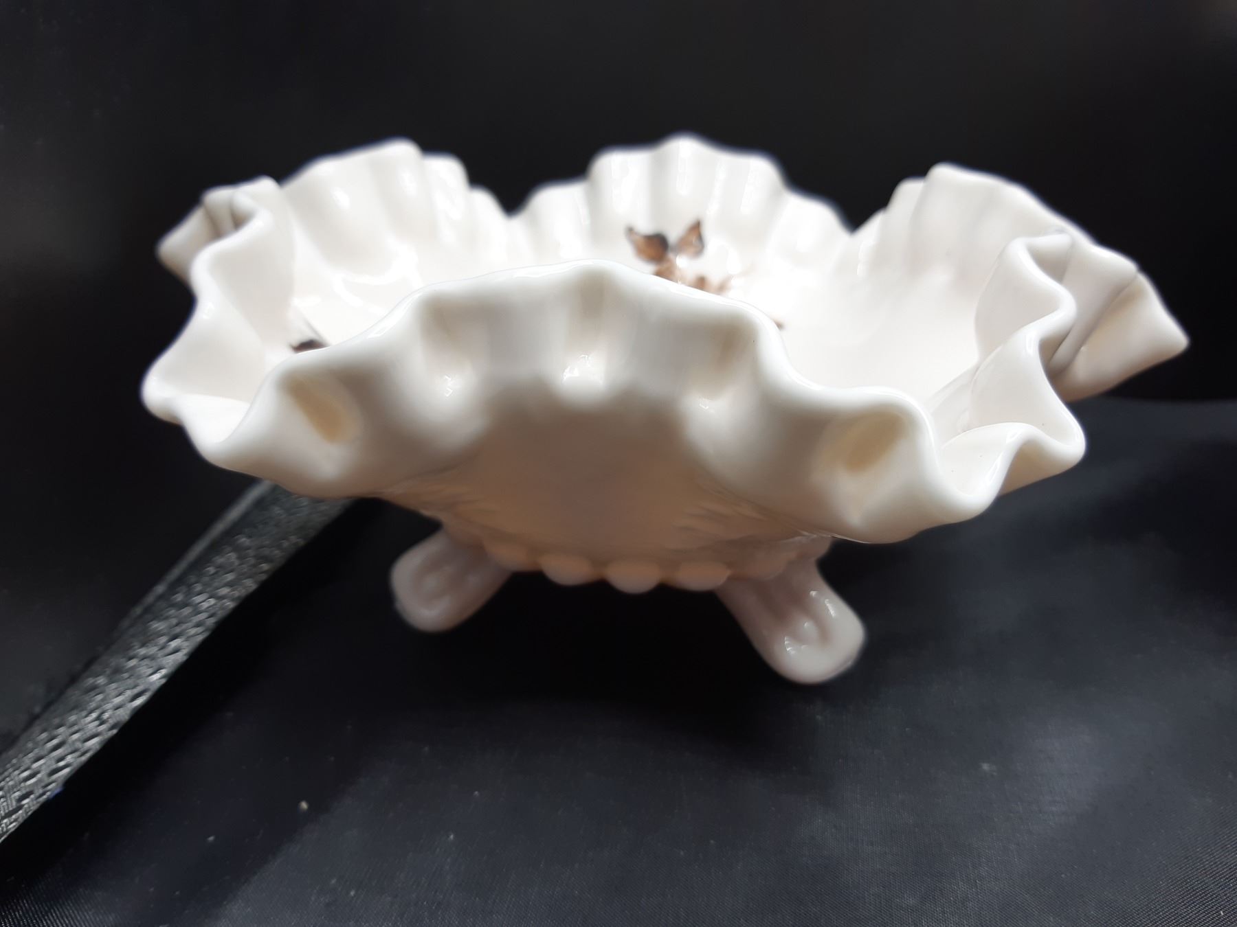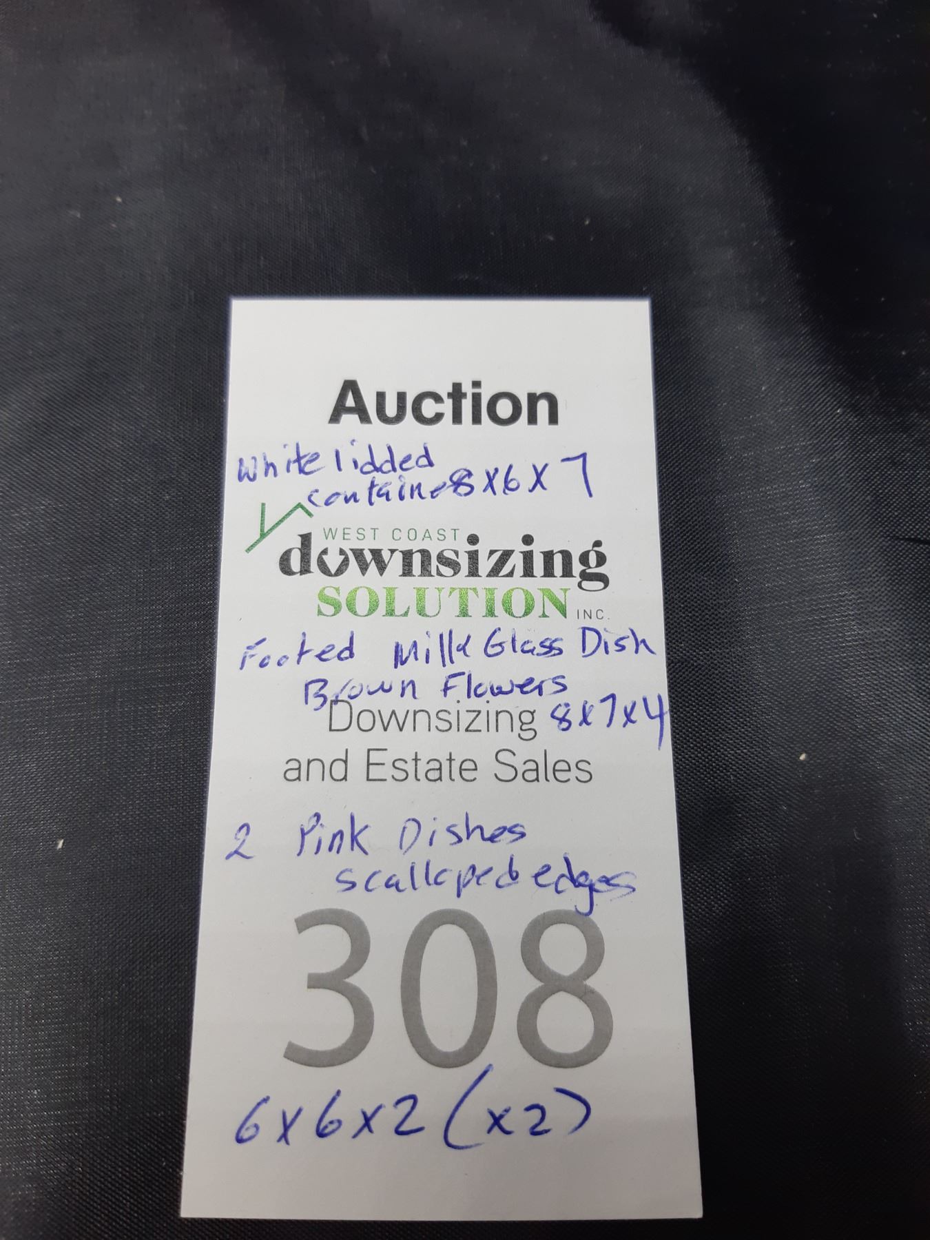 Rectangular covered container 8x6x7, Footed Milk Glass Dish with Brown flowers 8x7x4, 2 Pink Glass dishes with scalloped edges 6x6x2. Bring packing material and pickup at 9 am