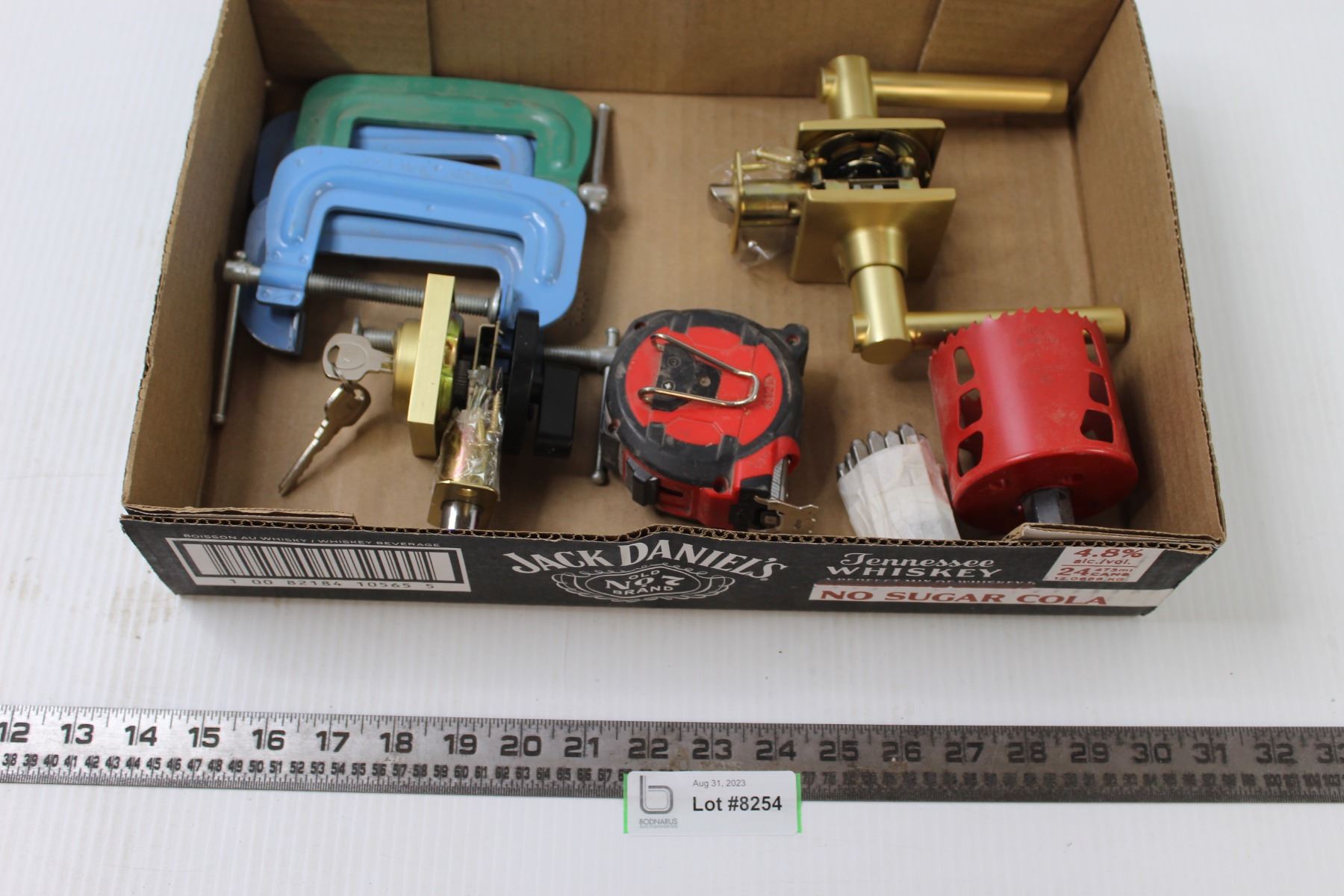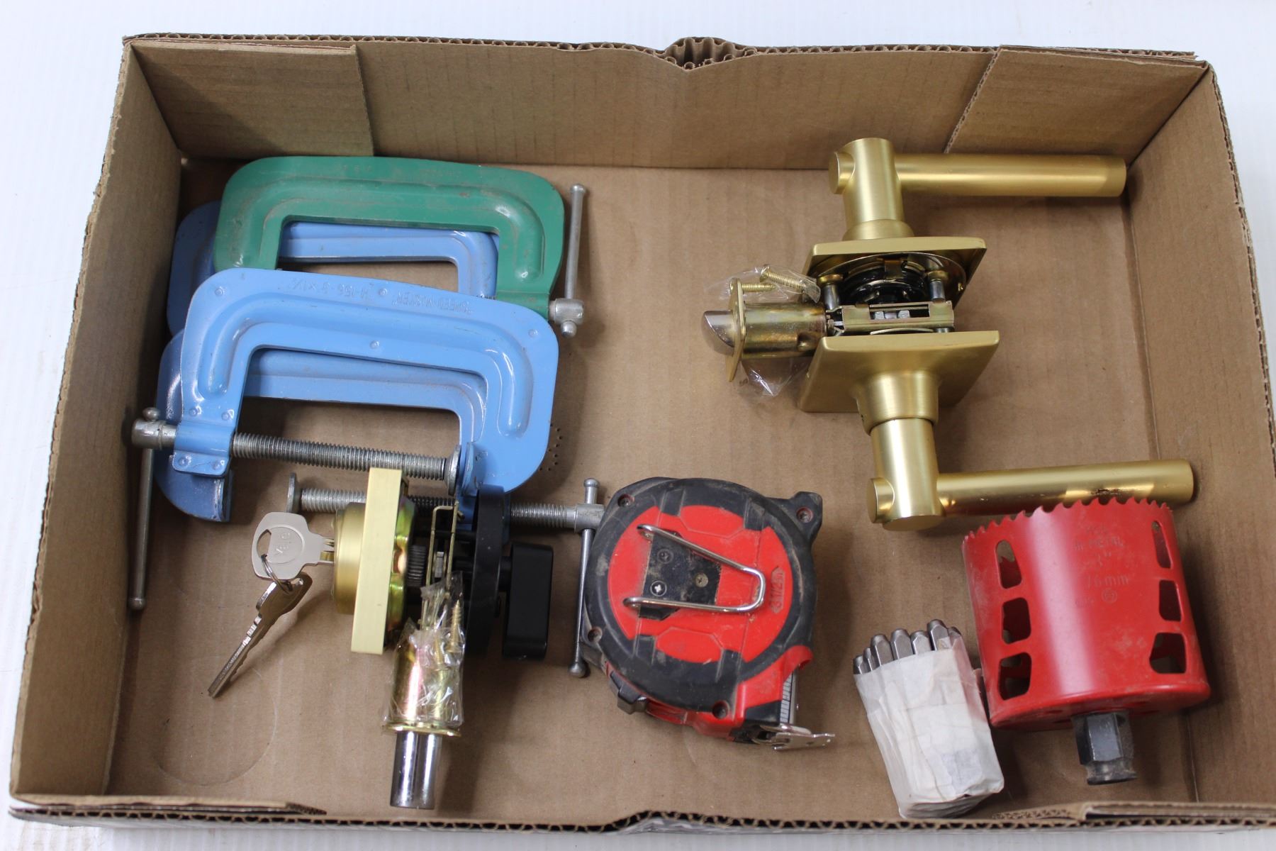 Assortment of Hardware and Tools -- C-Clamps, Door Hardware