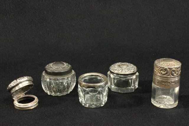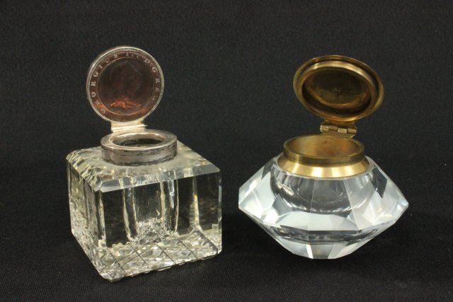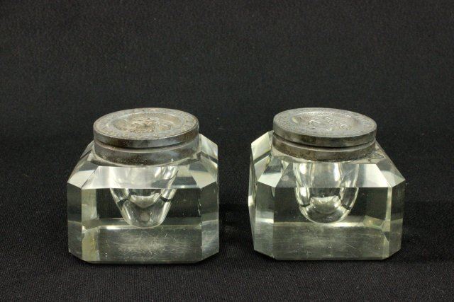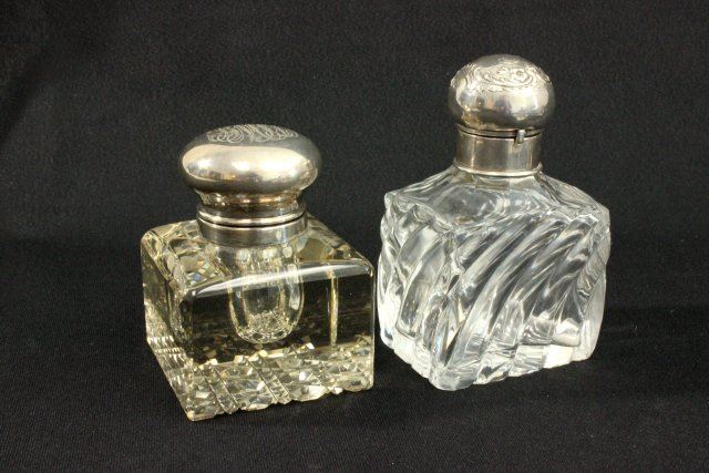Inkwells, vanity set bottles & candleholders, some with silver tops and rims. 16 pieces. From a NYC collector's 40 year compilation.