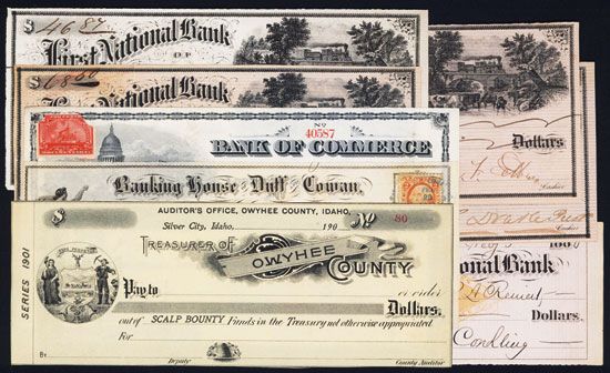 22 checks from 15 different banks, companies and cities from Iowa, Ky., Ill., NY, Kan., Ind., Ohio, Iowa, Va., Nebr., NJ and Tenn. Treasurer, numerous vignettes including railroad and US Capitol, 13 with revenue imprint, 4 with revenue stamp, usual mixed condition, Imprinted revenues including RN-D1, RN-F1, RN-G1, Fine condition group, printers include August Gast, ABN and others.