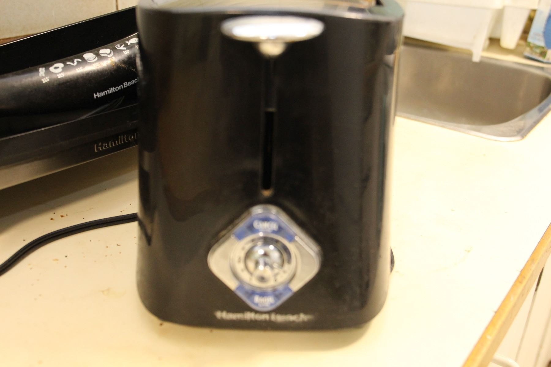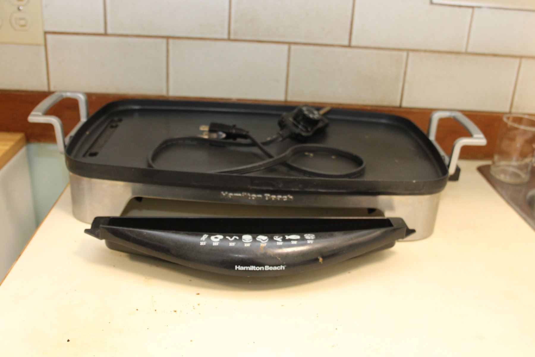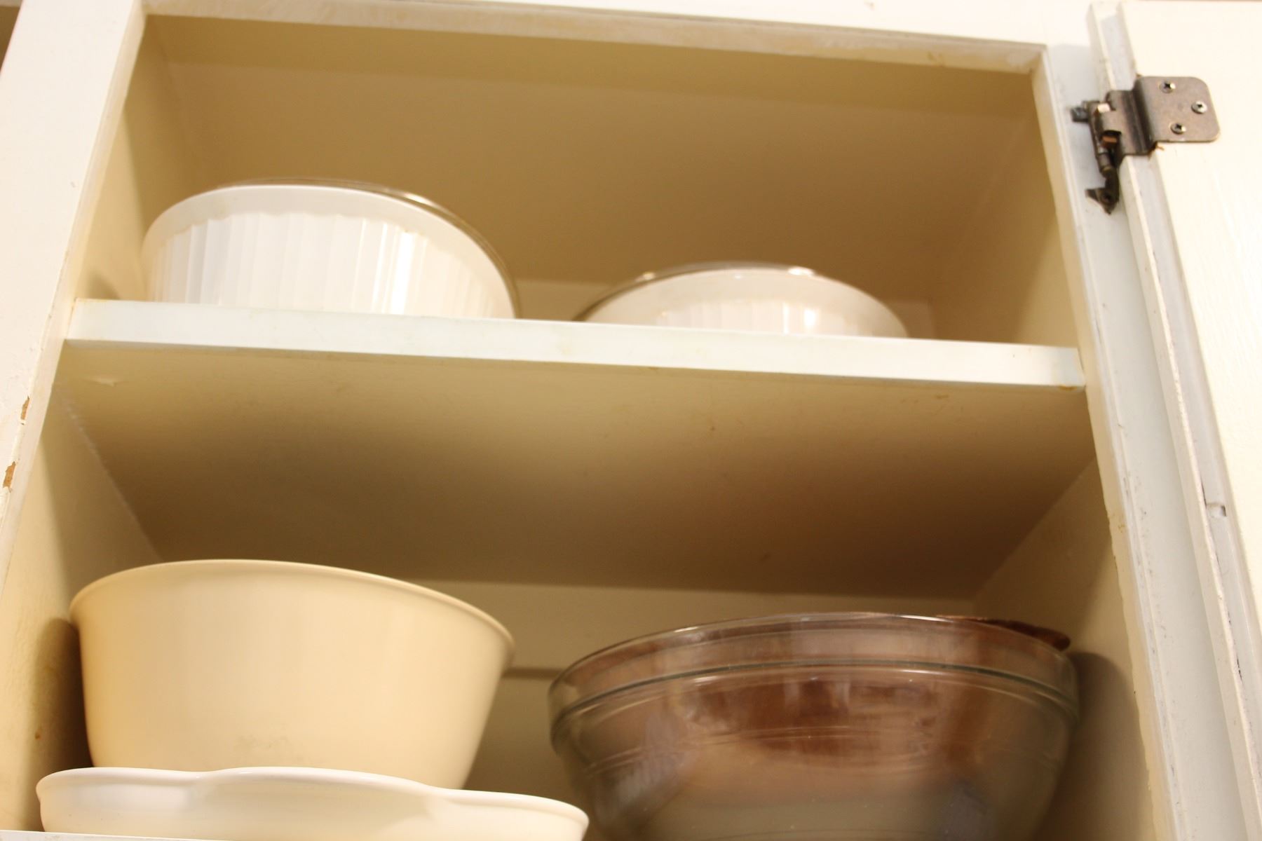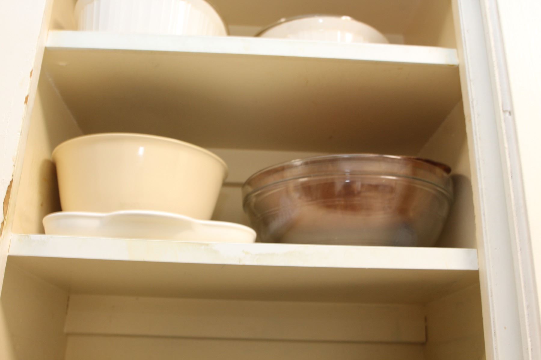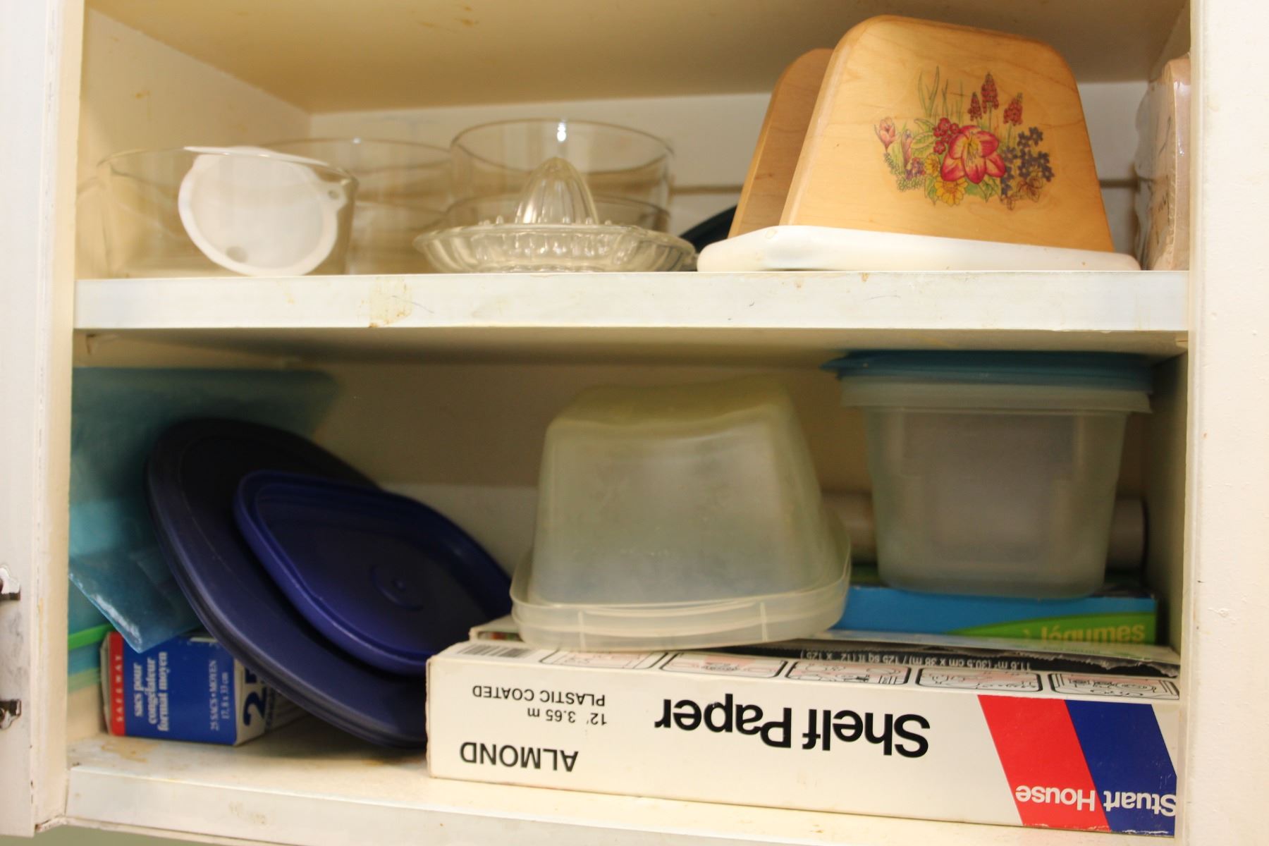 Food storage containers, French White lidded casserole baking dishes, Pyrex baking dishes, Hamilton Beach electric griddle & toaster, untested. Pick up at 9:00 am - 10:00 am